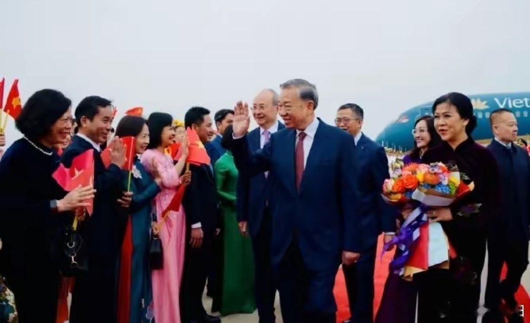 苏林携夫人抵达北京,夫人身着绣花长裙尽显端庄优雅4月14日上午,苏林携夫人抵达北京,现场迎接仪式隆重有序,铺设了红毯,摆放着鲜花,还有专人列队迎接,氛围庄重热烈。而随行的苏林夫人,凭借一身精致穿搭瞬间成为全场焦点,尽显温婉大气的东方风韵。从现场画面来看,苏林夫人身着一袭深紫色丝绒奥黛套装,这款作为越南国服的服饰,被她演绎得恰到好处。服饰采用古朴大气的仿古设计,低饱和的深紫色调自带温婉贵气,避开了高饱和色彩的张扬,搭配丝绒面料独有的哑光质感,在自然光下晕染出温润又有层次的光泽,沉稳又高级。在蓝天与红毯的映衬下,这份紫色既不抢镜也不突兀,完美契合外交场合的庄重氛围,还与苏林的藏蓝色西装形成和谐的色彩呼应,整体氛围感十足。这套奥黛选用重磅丝绒材质打造,绒面细腻绵密,触感柔软亲肤,兼具美观与舒适度。面料垂坠感极佳,走动时泛起细腻的光影流动,没有亮面面料的浮夸感,却自带低调奢华的质感。同时丝绒还具备良好的塑形效果,既能贴合身形勾勒出优雅线条,又不会过于紧绷,让整体造型挺括又不失松弛感,完全适配正式场合的仪态要求。剪裁上完整保留了奥黛的经典精髓,立领、收腰、高开叉的设计尽显巧思。小巧的立领贴合颈部线条,修饰出修长脖颈,平添几分端庄;精准的收腰剪裁巧妙勾勒腰线,优化身材比例,显得身姿愈发挺拔;高开叉设计则打破了传统礼服的笨重感,行走时衣摆轻扬,灵动飘逸,尽显优雅姿态。整体剪裁极简大气,没有多余的夸张设计,将“少即是多”的高级感贯彻始终,既传承了民族服饰的文化内核,又贴合现代审美。服饰上的手工花卉刺绣堪称点睛之笔,裙身纵向错落分布着三朵大花卉刺绣,从领口延伸至裙摆,视觉上拉长身形,更显高挑纤细。刺绣工艺十分精湛,针脚密实细腻,花瓣的层次、叶片的脉络都清晰可见,红紫渐变的花瓣搭配翠绿枝叶,在深紫色丝绒底面上形成鲜明又和谐的撞色,既打破了纯色的单调,又不会显得杂乱,将东方传统手工技艺的匠心与温度展现得淋漓尽致,让服饰不止是穿搭,更承载着文化底蕴。在造型搭配上,苏林夫人也尽显低调得体。一头利落的低盘发简约大方,将所有焦点都集中在服饰本身,无多余花哨发型抢镜;配饰仅佩戴一枚简约戒指,遵循极简原则,让奥黛成为造型绝对主角;妆容淡雅精致,温润大气,整体造型端庄、优雅又不失大气,既展现出越南女性独有的传统柔美,又彰显出第一夫人得体的外交风范,完美平衡了传统服饰韵味与现代时尚感。