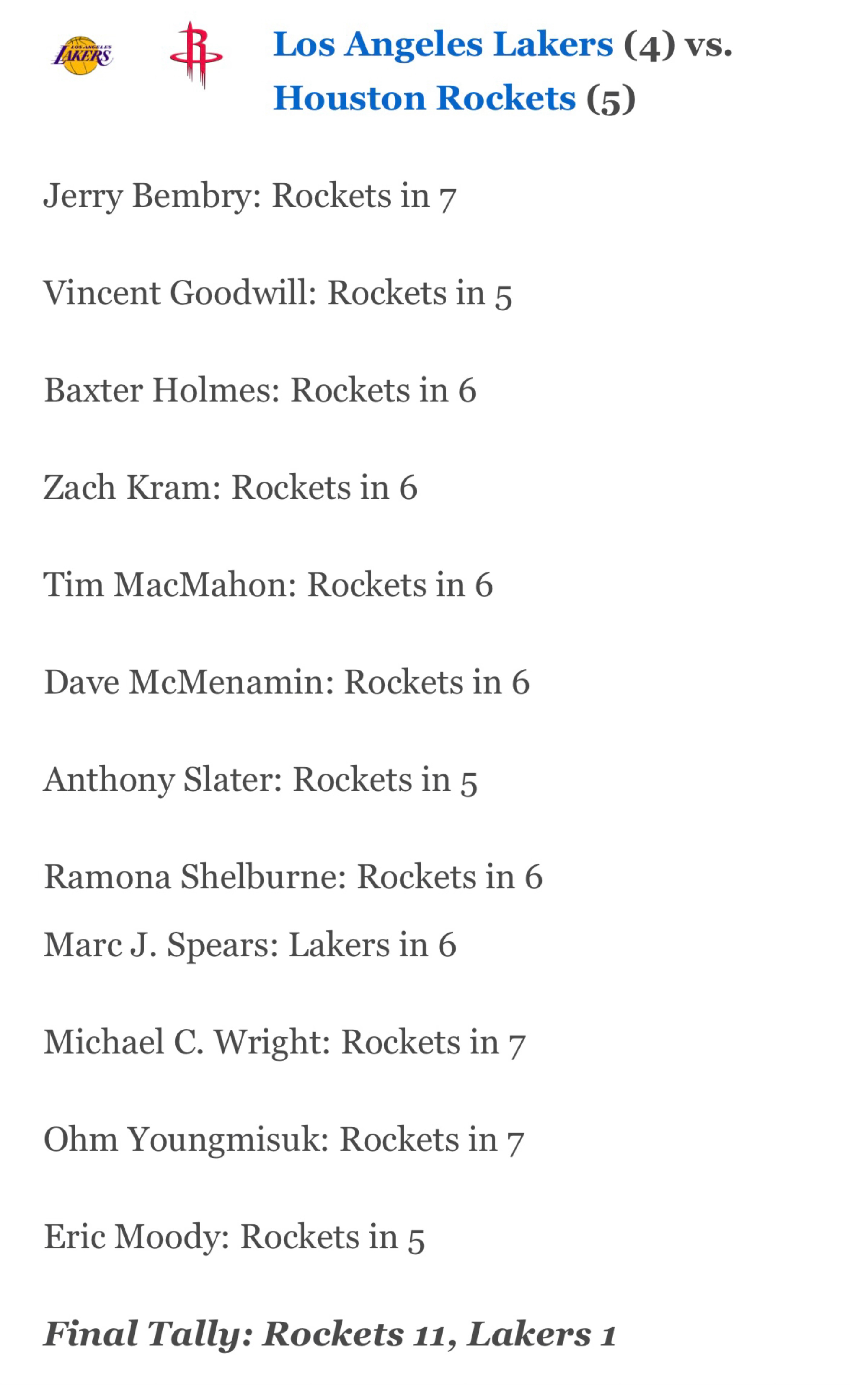 ESPN专家团队12人预测东西部四五名对决:火箭11票VS 湖人1票猛龙0票VS