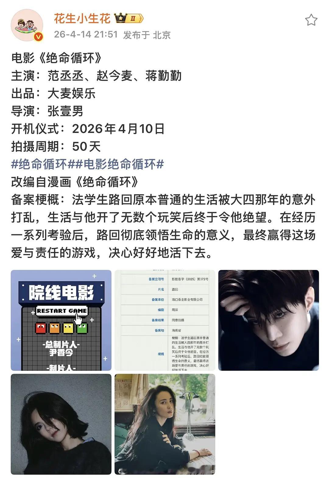范丞丞《绝命循环》正式压番赵今麦以男主名备案,故事围绕男主展开,赵今麦感觉是来抬