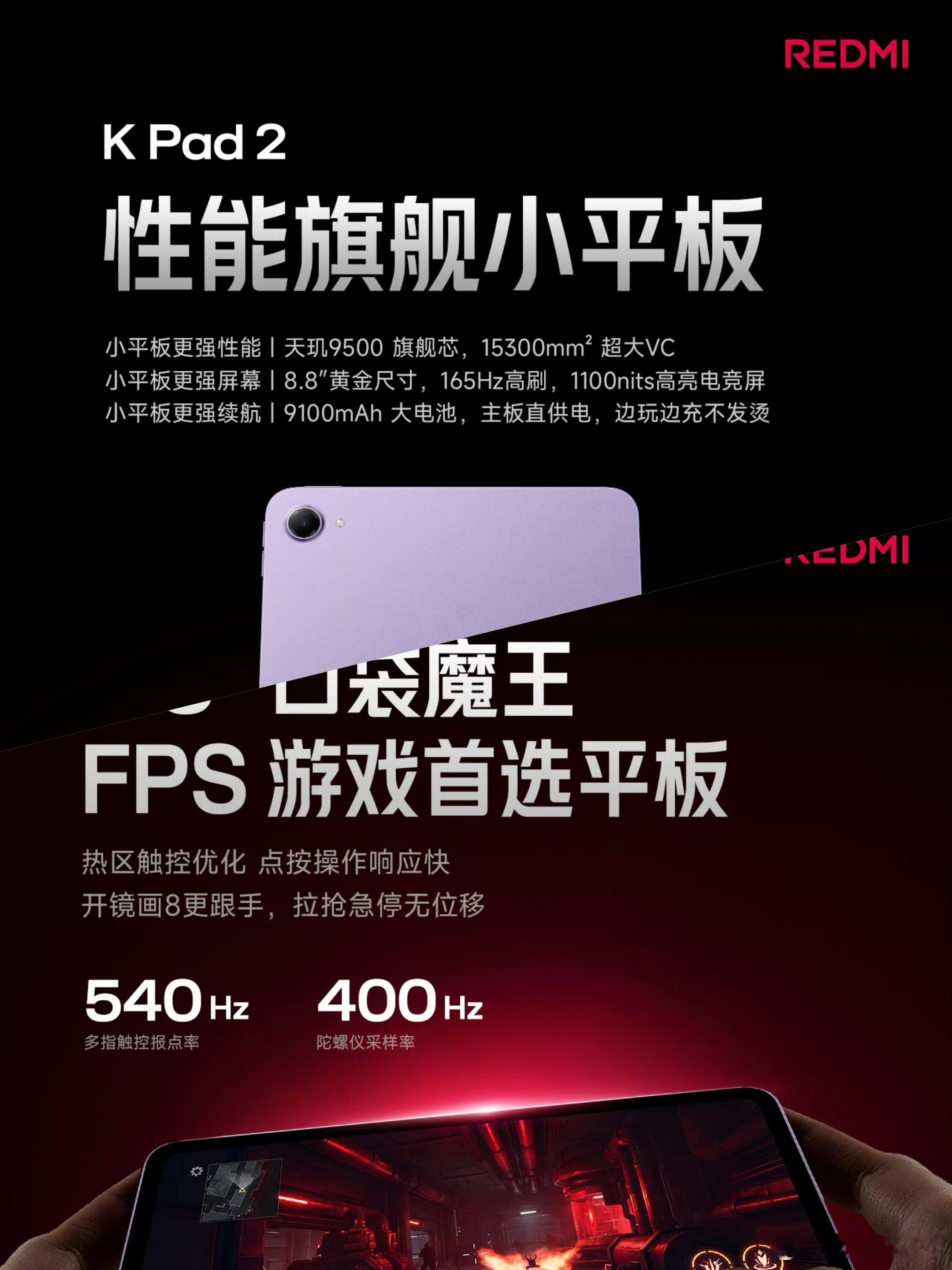 REDMI K Pad 2,8.8英寸 3K 165Hz LCD屏,天玑9500,67W+9100mAh,双X轴马达,双C口(USB3.2 Gen1),侧边指纹识别,电光紫、太空银、深邃黑配色。KPad2
