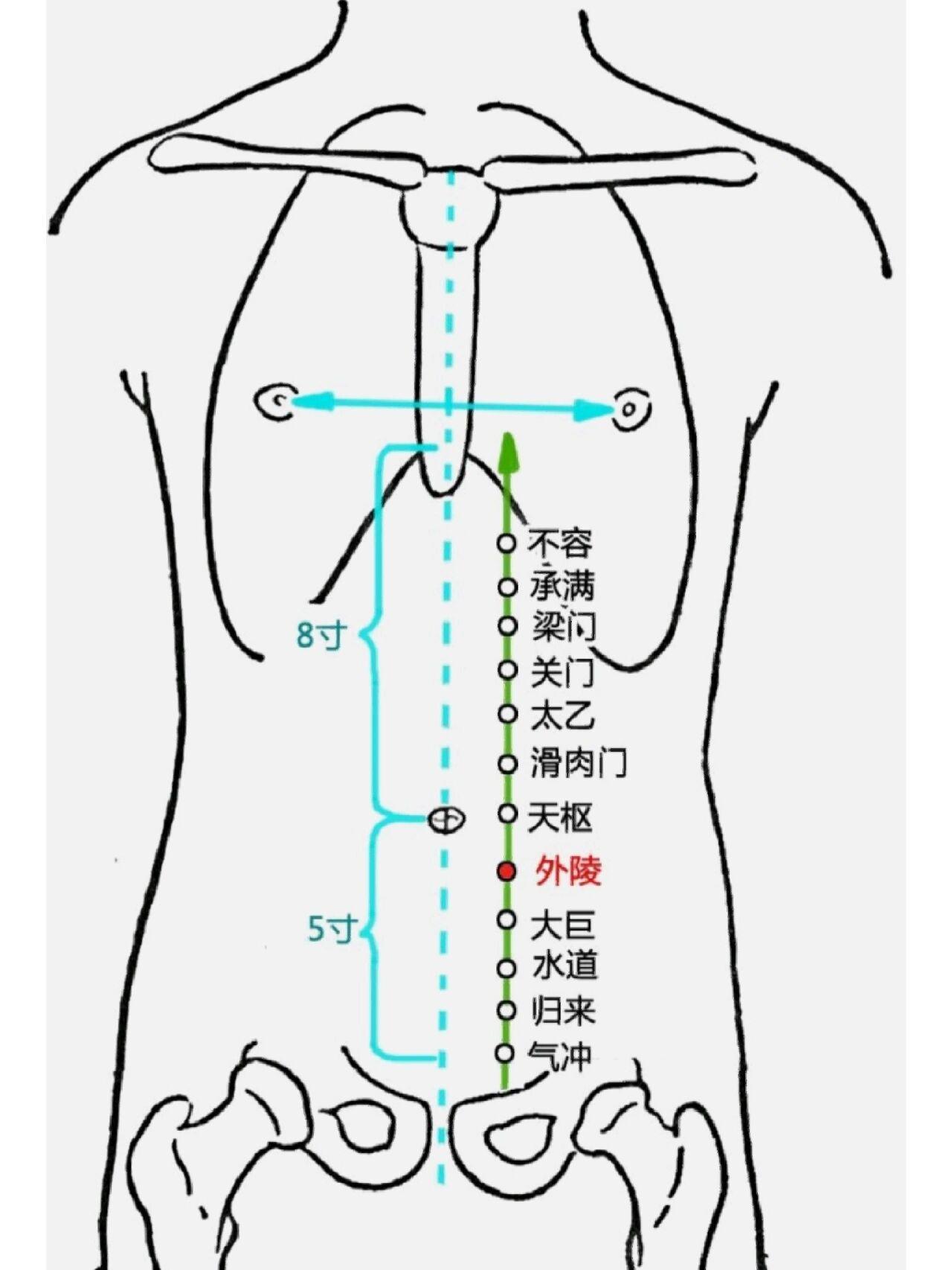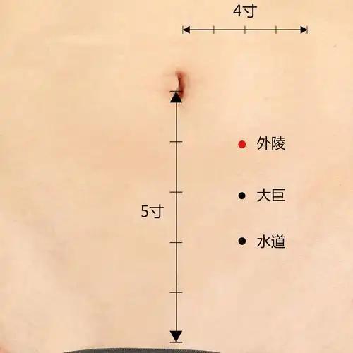 外陵穴位于我们的下腹部。要找到它,先平躺放松,定位肚脐(神阙穴)。从肚脐中心向正下方量取2寸(约为本人三指并拢的宽度),找到石门穴(或关元穴附近,因人而异),再从这个点向两侧旁开2寸(同样约为三指宽),在腹直肌外侧缘的凹陷处就是了。