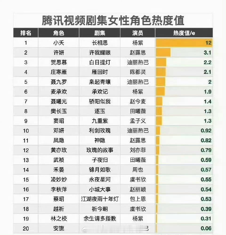 腾讯剧集女性角色热度值迪丽热巴,腾讯剧集角色热度唯一三部在榜的女演员,优秀碾压整