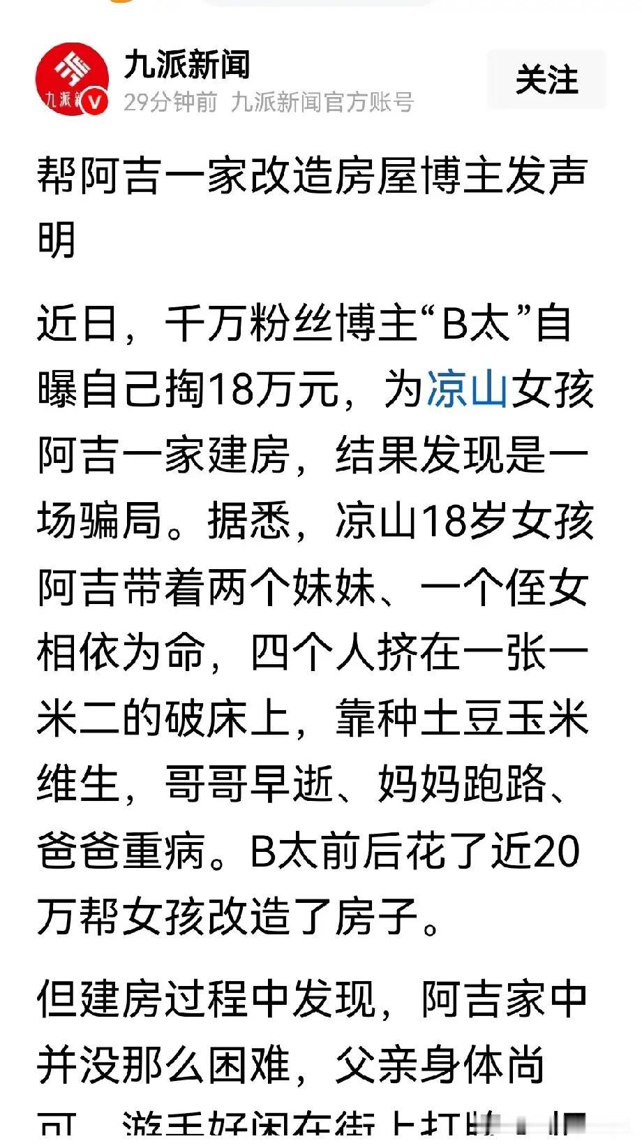 诸位朋友,今儿咱们单说贵州大山里那栋“价值18万的新房”。这事儿,听着像“农夫与蛇”的现代版,实则是一记敲在善意者心坎上的“醒世恒言”。百万粉丝博主B太,怀揣一腔热血,为“独自抚养三妹、父亲重病”的阿吉一家盖起带卫浴的现代新居,谁曾想,房子落成才知是“精心包装的骗局”——父亲能下地打牌,弟弟活蹦乱跳帮忙搬砖,破屋不过是摆拍的“摄影棚”。这哪是帮扶?分明是拿真金白银给“卖惨剧本”当了“投资商”,寒了善心,更戳中了公益的痛点。