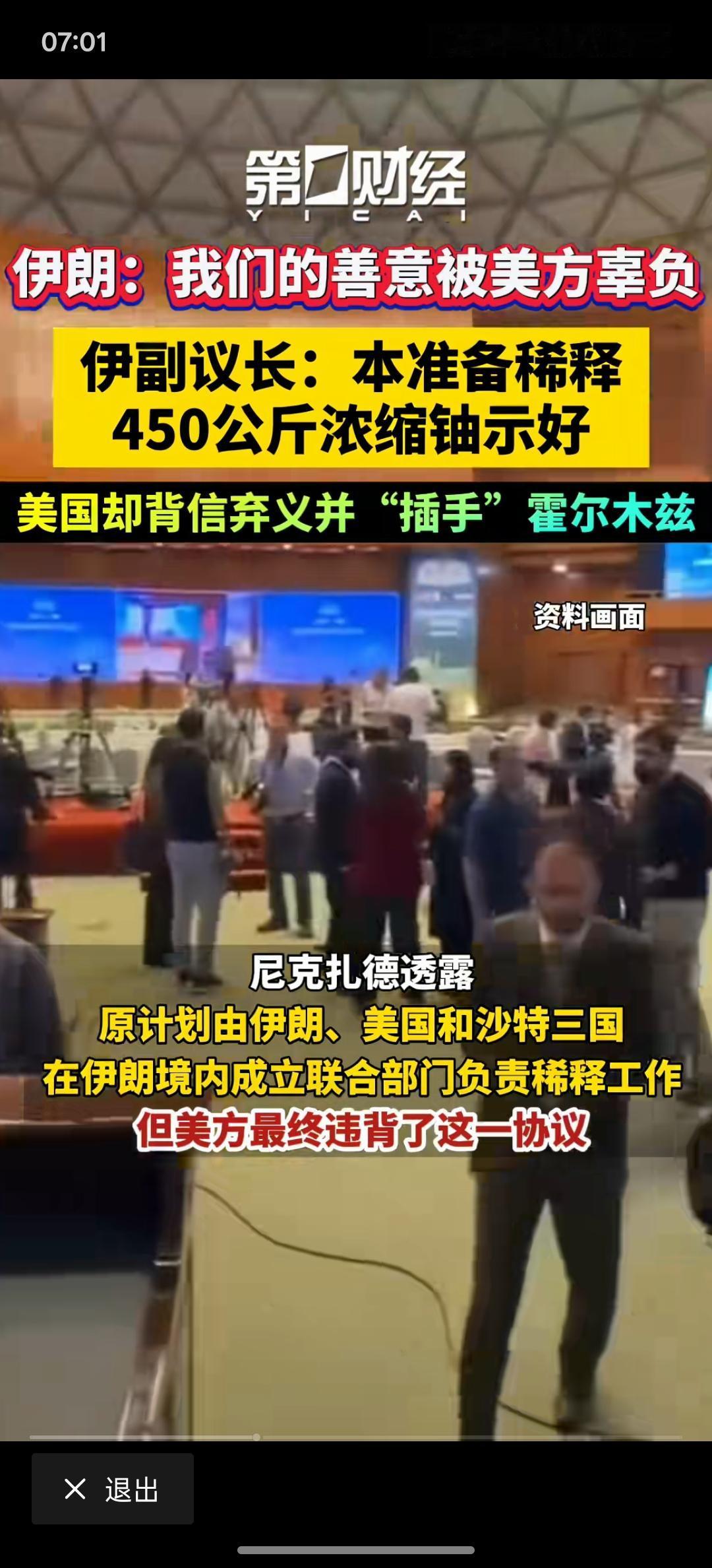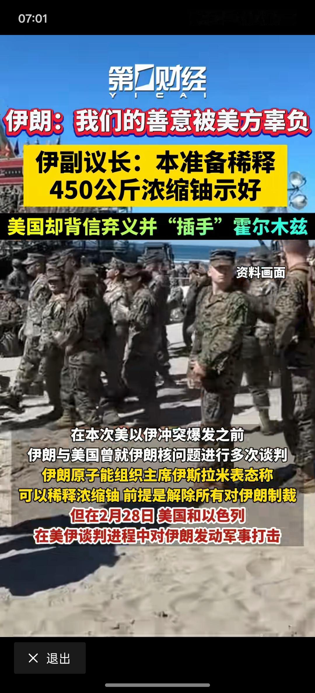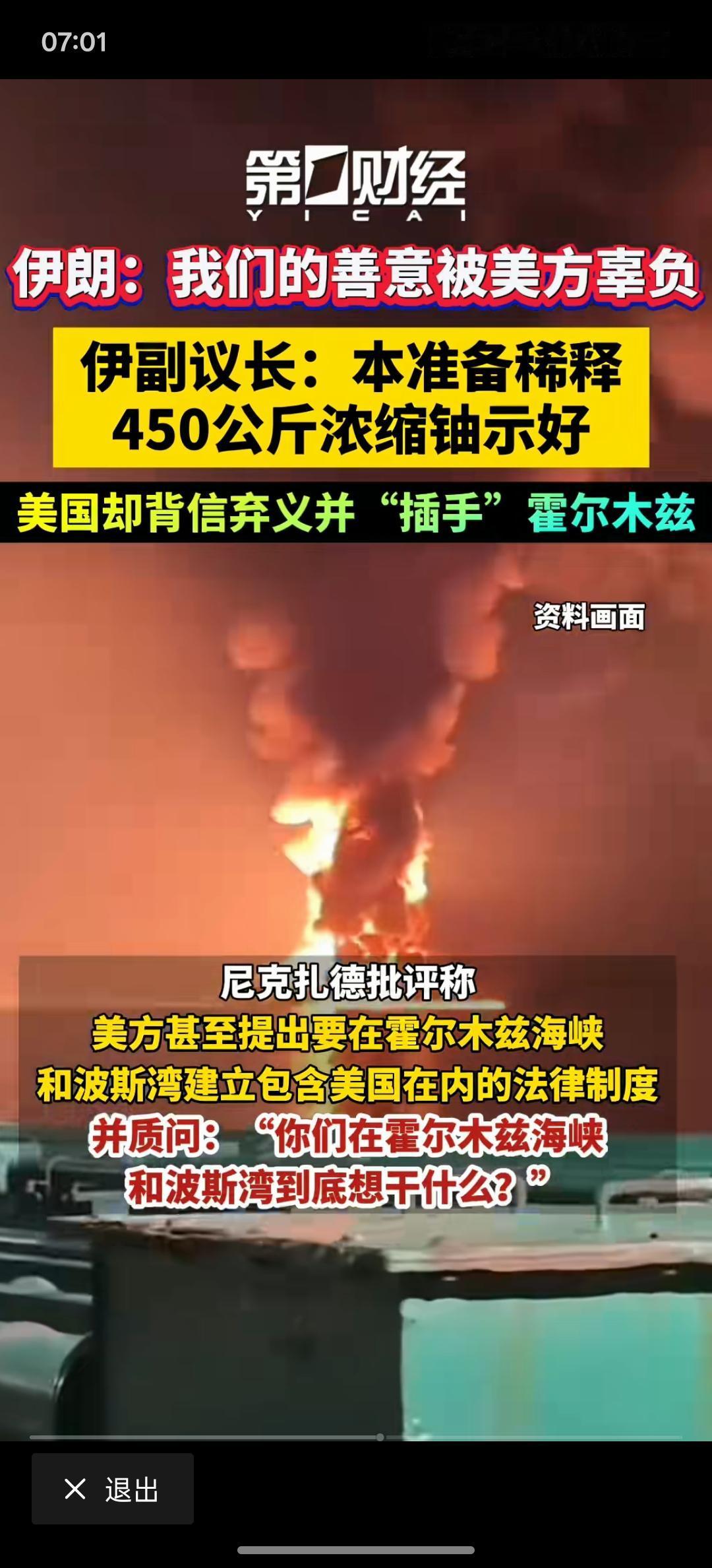 根据最新消息的公布,伊朗方面准备稀释450公斤浓缩铀示好!但美方背弃了伊朗的善意,美国又插手了霍尔木兹海峡的事情!那接下来,美国与伊朗还得继续谈判。根据特朗普所诉说的消息说,美国与伊朗的战争基本上已经结束!