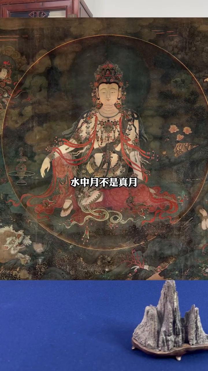 水月有极深禅意,水中之月,镜中之花,可望不可及,美丽不执着。水中月不是真月,却映出真月,慈悲无处不在,却无形可执。这种东方哲学意境在艺术上已经高出了一个维度。画像相传是唐代著名画家周防所创,菩萨坐于岩石之上,背后圆月高悬,前方水面映月,竹林清幽,神态安然自在。