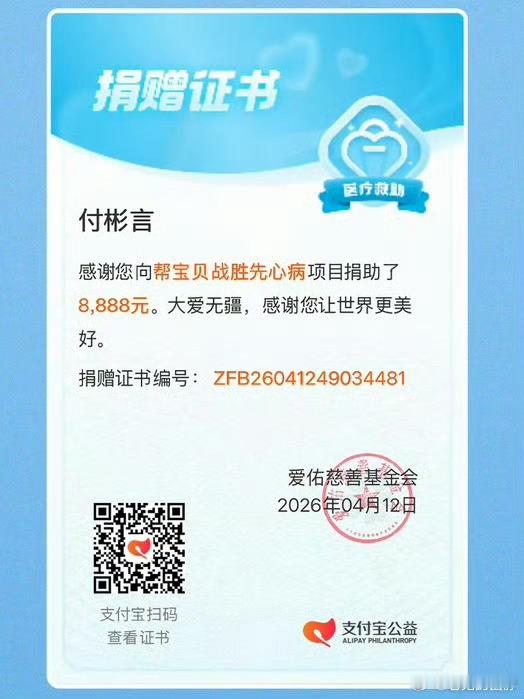 王橹杰粉丝公益应援 王橹杰新剧公益应援:儿童先天性心脏病医疗救助项目,分别以王橹杰和付彬言的名义各捐赠一份 王橹杰杀青应援