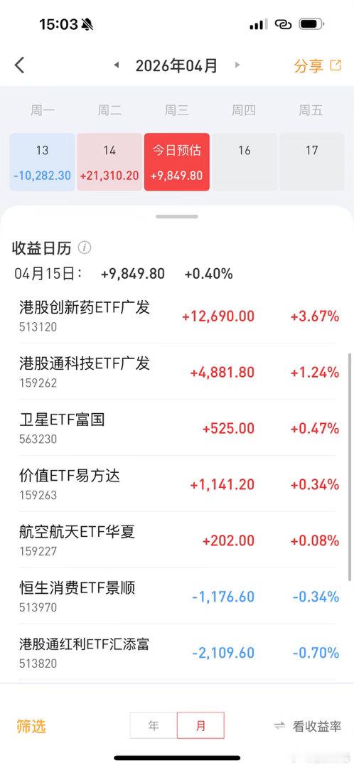 etf帐户今天盈利1万上午还是赚2万多的,下午就落下来了盘中发车减仓了一点点医药汉堡加成了一点点消费寒冰大家多点赞,我持续晒实盘创业板指创10年多新高基金