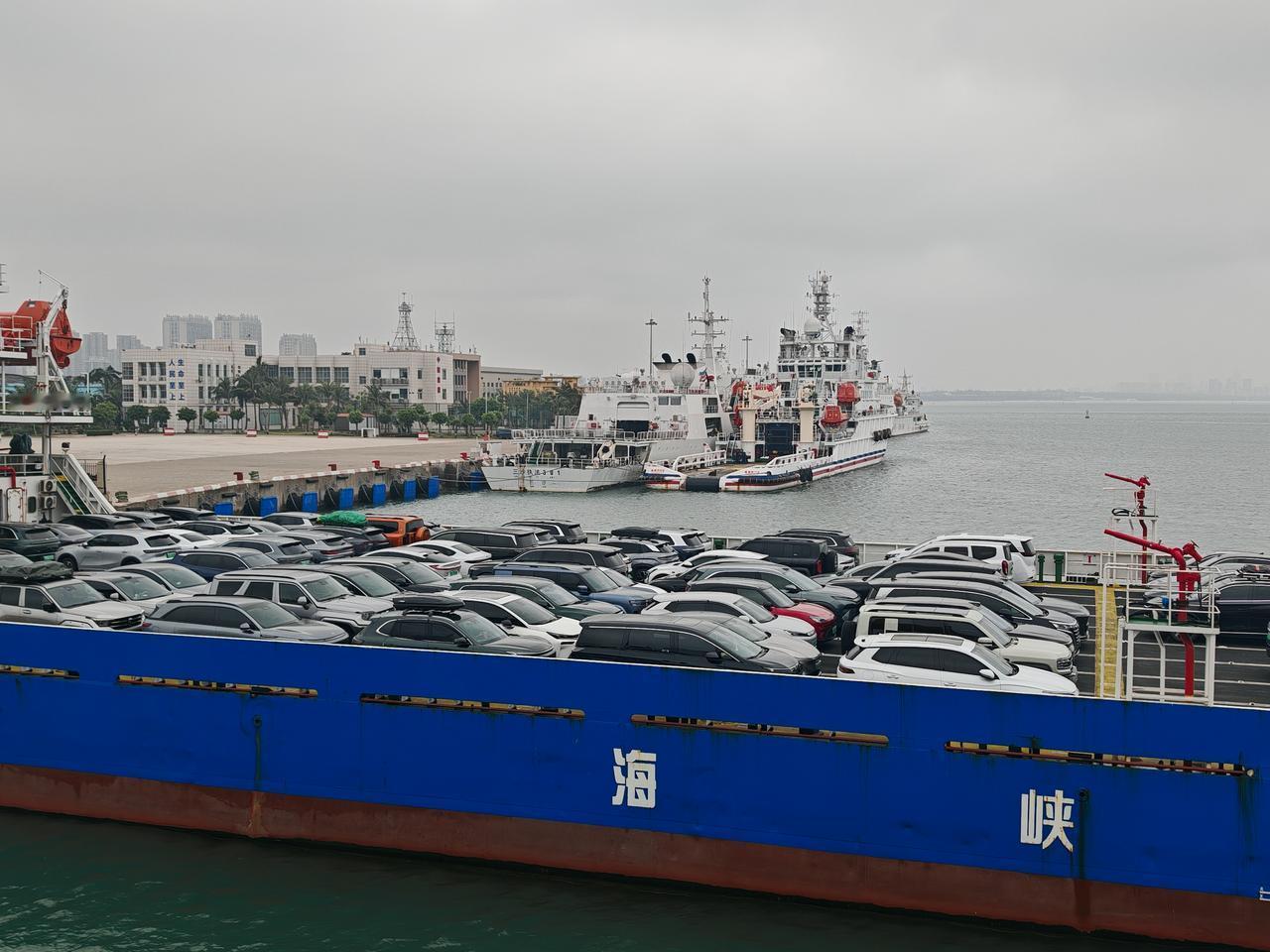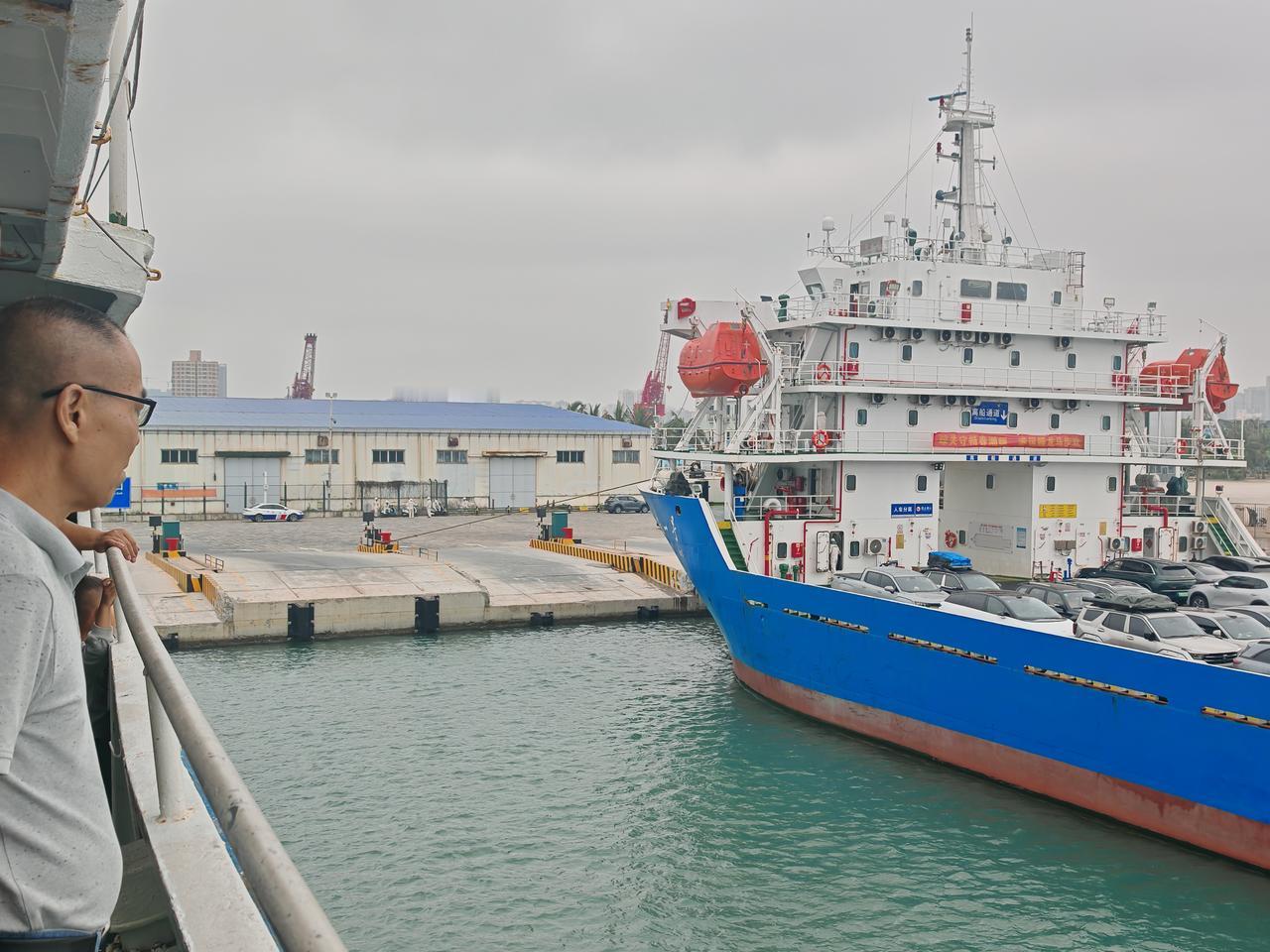 琼州海峡汽车上船,新能源车被单独分开,油车和旅客一个船,新能源车单独一个船,新能源人车分离。
