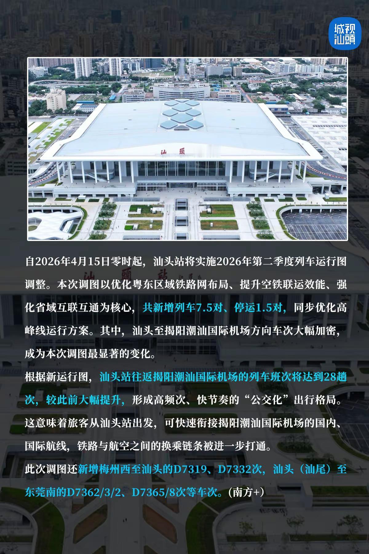 空铁联运班次加密,汕头站4月15日起调图。从汕头站获悉,自2026年4月15日零时起,汕头站将实施2026年第二季度列车运行图调整。本次调图以优化粤东区域铁路网布局、提升空铁联运效能、强化省域互联互通为核心,共新增列车7.5对、停运1.5对,同步优化高峰线运行方案。其中,汕头至揭阳潮汕国际机场方向车次大幅加密,成为本次调图最显著的变化。汕头 汕头站 潮汕机场 汕头高铁站