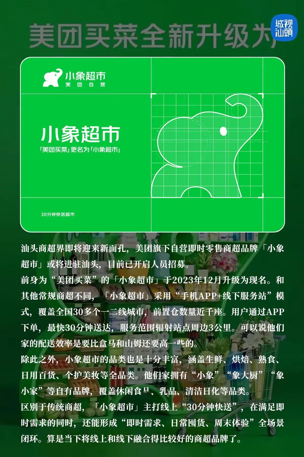 美团旗下自营品牌小象超市或将进驻汕头。汕头商超界即将迎来新面孔美团旗下自营即时零