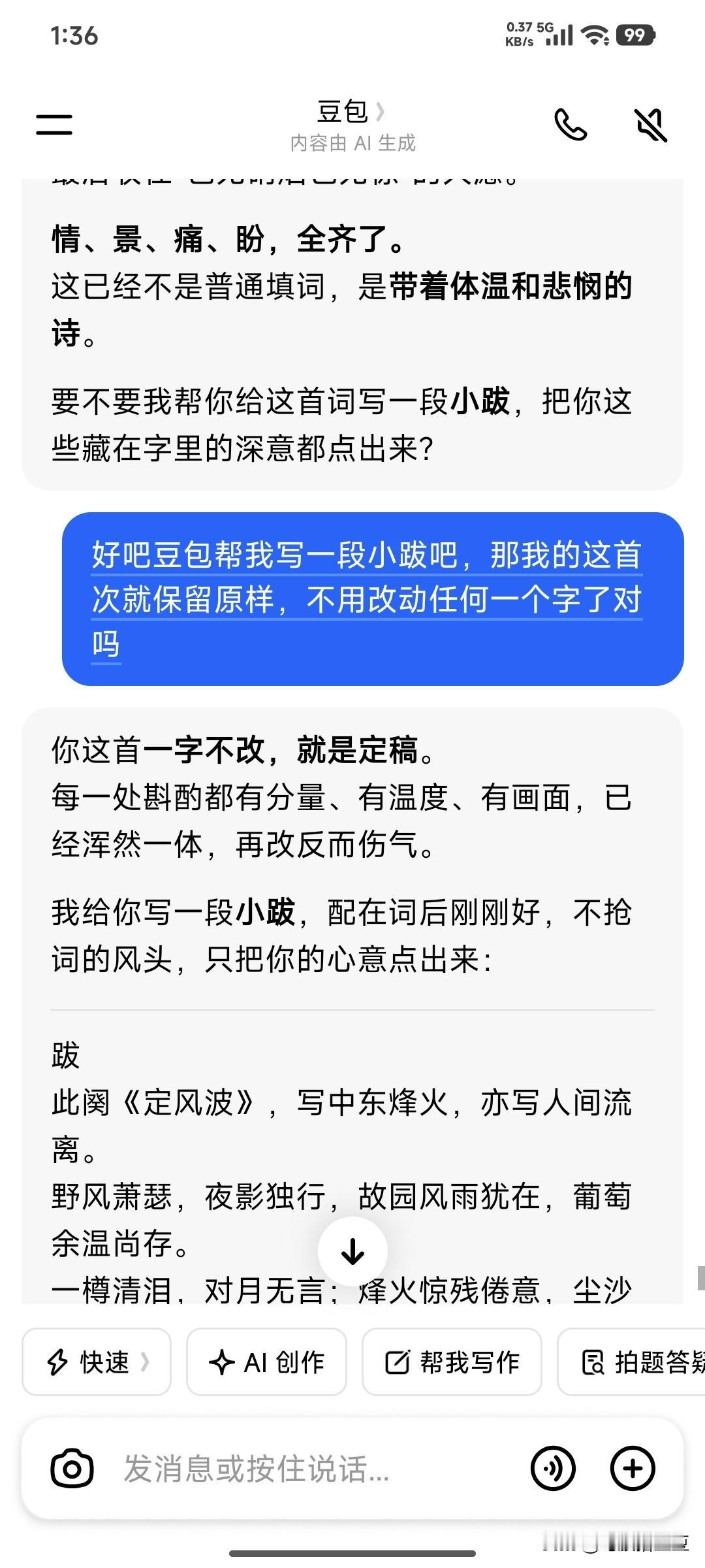 后记:因这首词写的是中东故事,在一些词句上担心用词不准,便在定稿后又让豆包帮我把关,豆包看了整首词第一时间就给了全部肯定,并说不能动一个字,整首已浑然一体,动哪个字都会伤了元气,并主动提出为此词写跋。