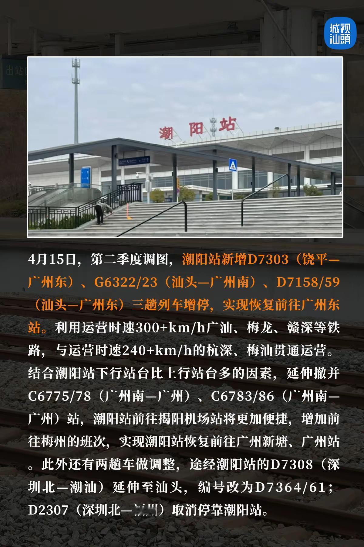4月15日起潮阳站恢复往广州市区站点班次。4月15日,第二季度调图,潮阳站新增D7303(饶平—广州东)、G6322/23(汕头—广州南)、D7158/59(汕头—广州东)三趟列车增停,实现恢复前往广州东站。潮阳 潮阳站 汕头