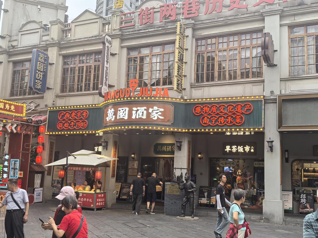 抵达南宁稍作休整后,我们先前往南宁博物馆参观,感受这座城市的历史底蕴。傍晚五点多,一行人来到南宁热门打卡地三街两巷,漫步在古色古香的街巷间,沉浸式体验老南宁的烟火气息。当晚,我们选择在景区内拥有百年餐饮历史的万国酒楼用餐,点了店内招牌特色美食:独具风味的海霸王老友粉河粉、醇香滋补的陈皮花雕老鸭、甜香入味的菠萝扣烧肉、鲜香过瘾的香辣猪杂煲,还有皮脆肉嫩的金牌脆皮白切猪手,一道道佳肴让人垂涎欲滴。