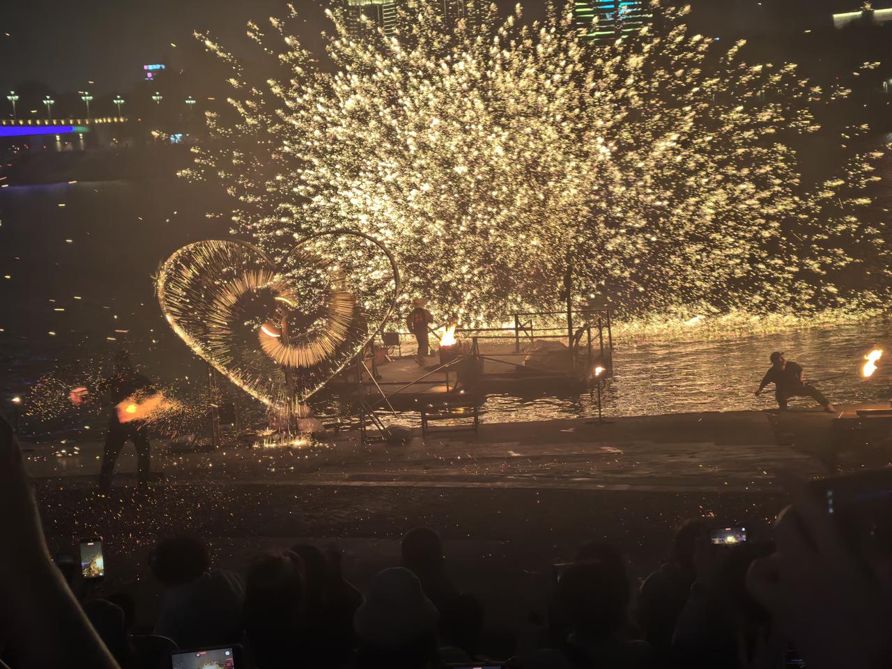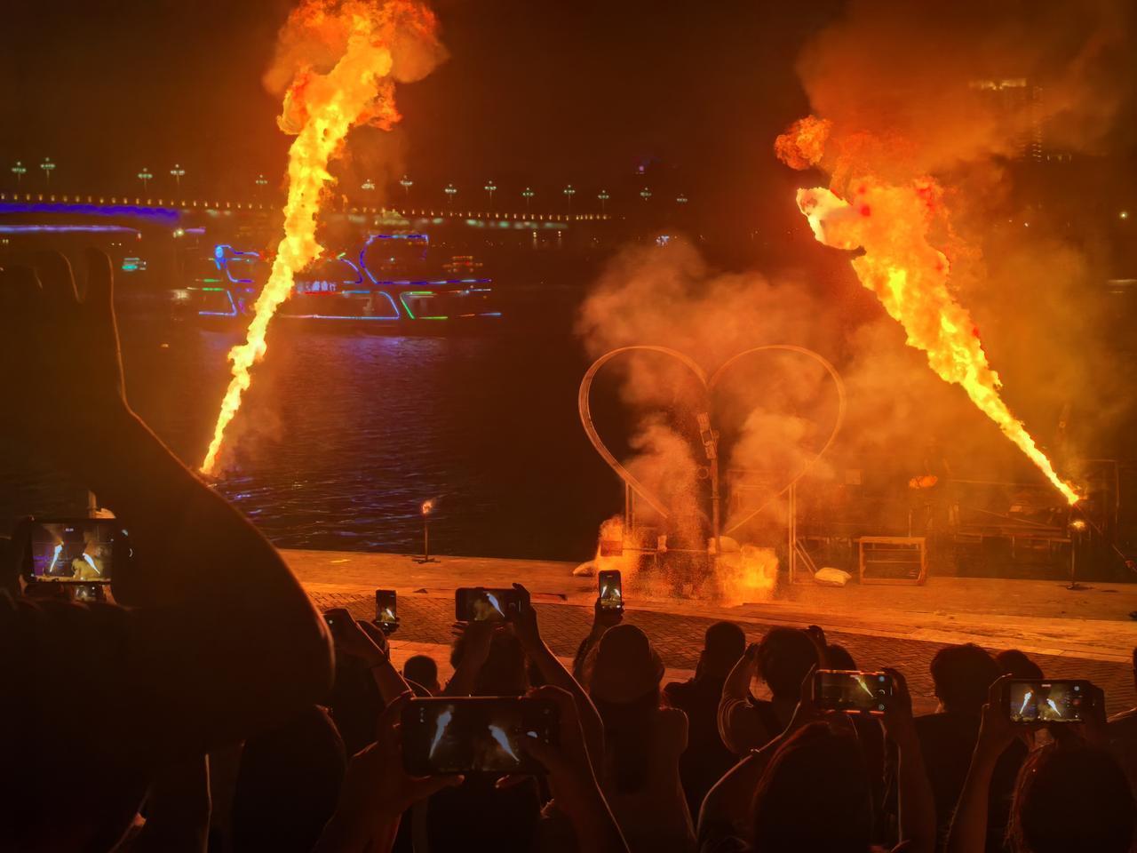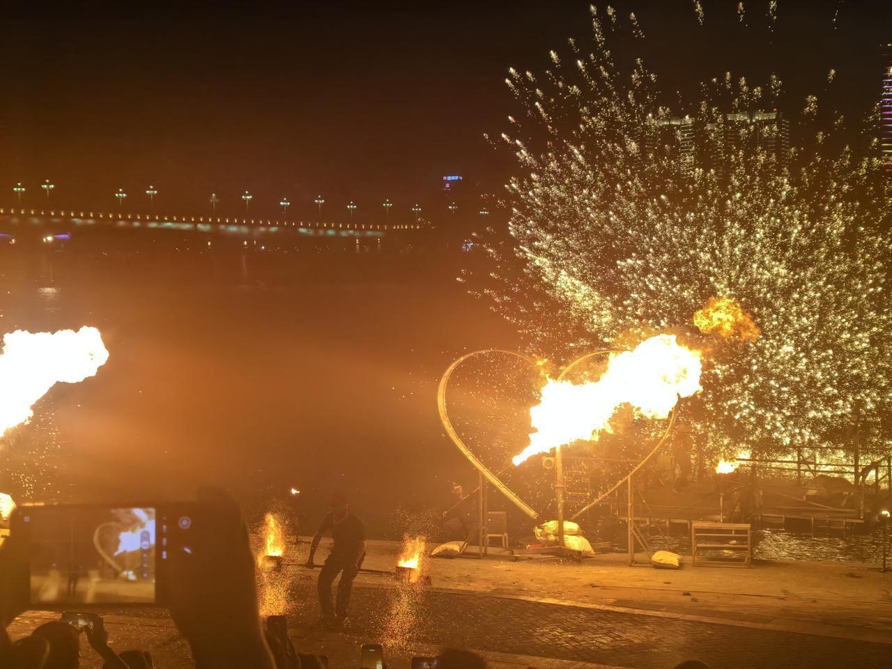 晚餐结束后,八点半左右,我们来到江边,共赴一场震撼人心的焰火盛宴——南宁火秀。这场表演以火焰为核心元素,巧妙融合了中华传统民俗、东南亚异域风情与现代娱乐艺术,将舞蹈、杂技、音乐等多种形式完美交织,既是一场极具视觉冲击力的光影秀,也是一场深厚的文化盛宴。表演既保留了非遗传统的庄重仪式感,又兼具十足的现代娱乐性,亲临现场的我们,真切感受到了火焰迸发的炽热张力,沉浸式领略了这场独属于南宁的视听狂欢