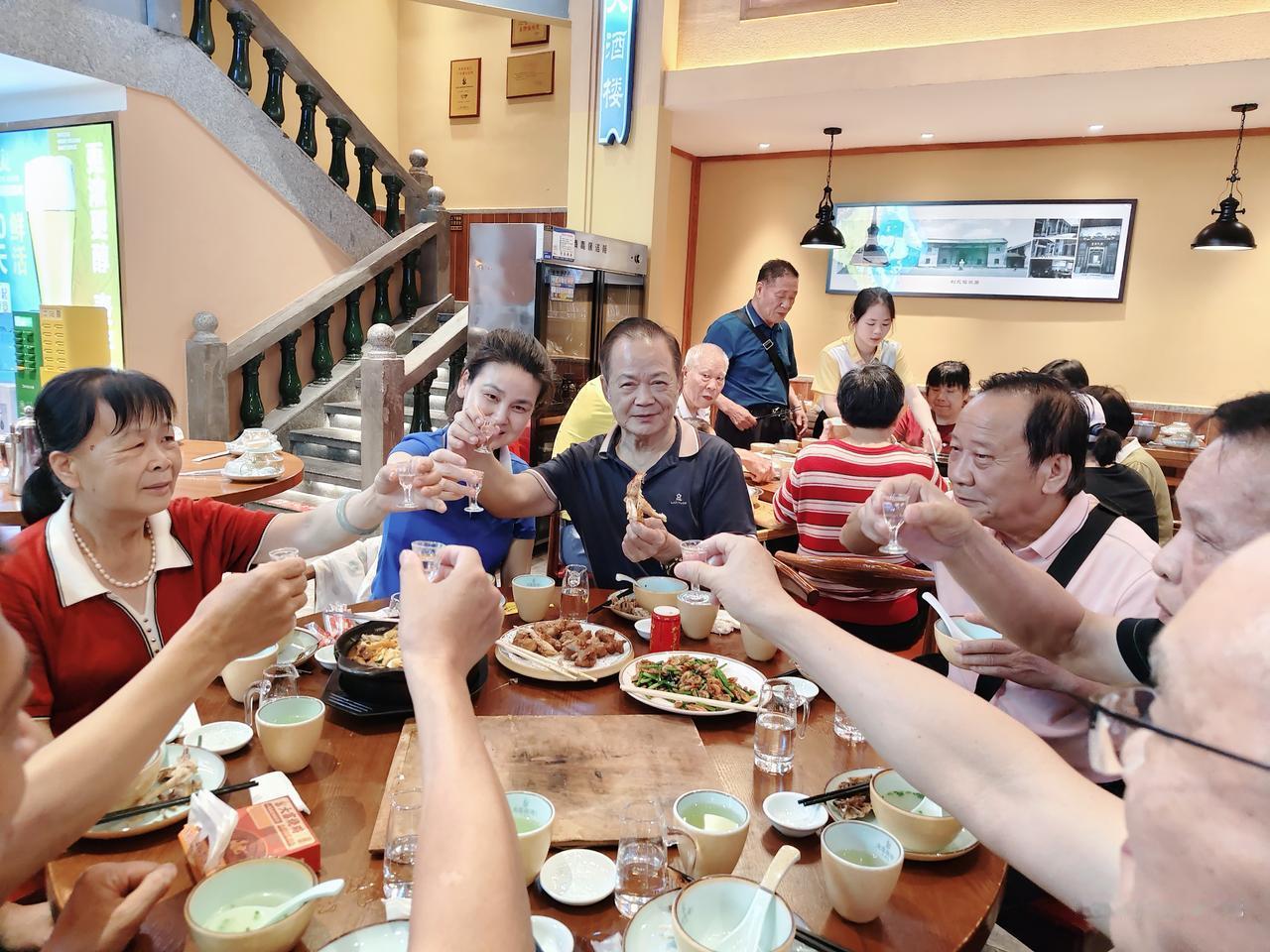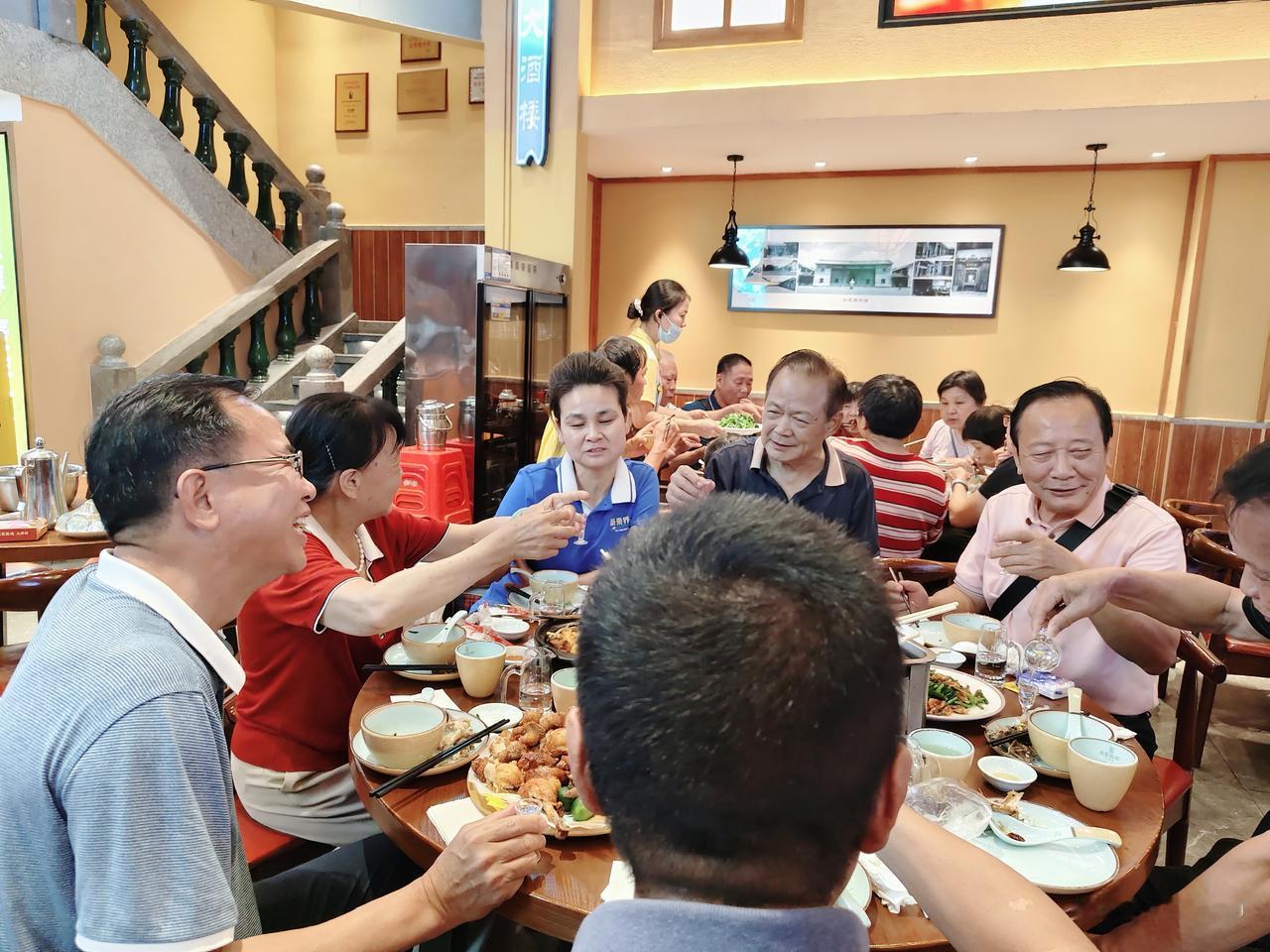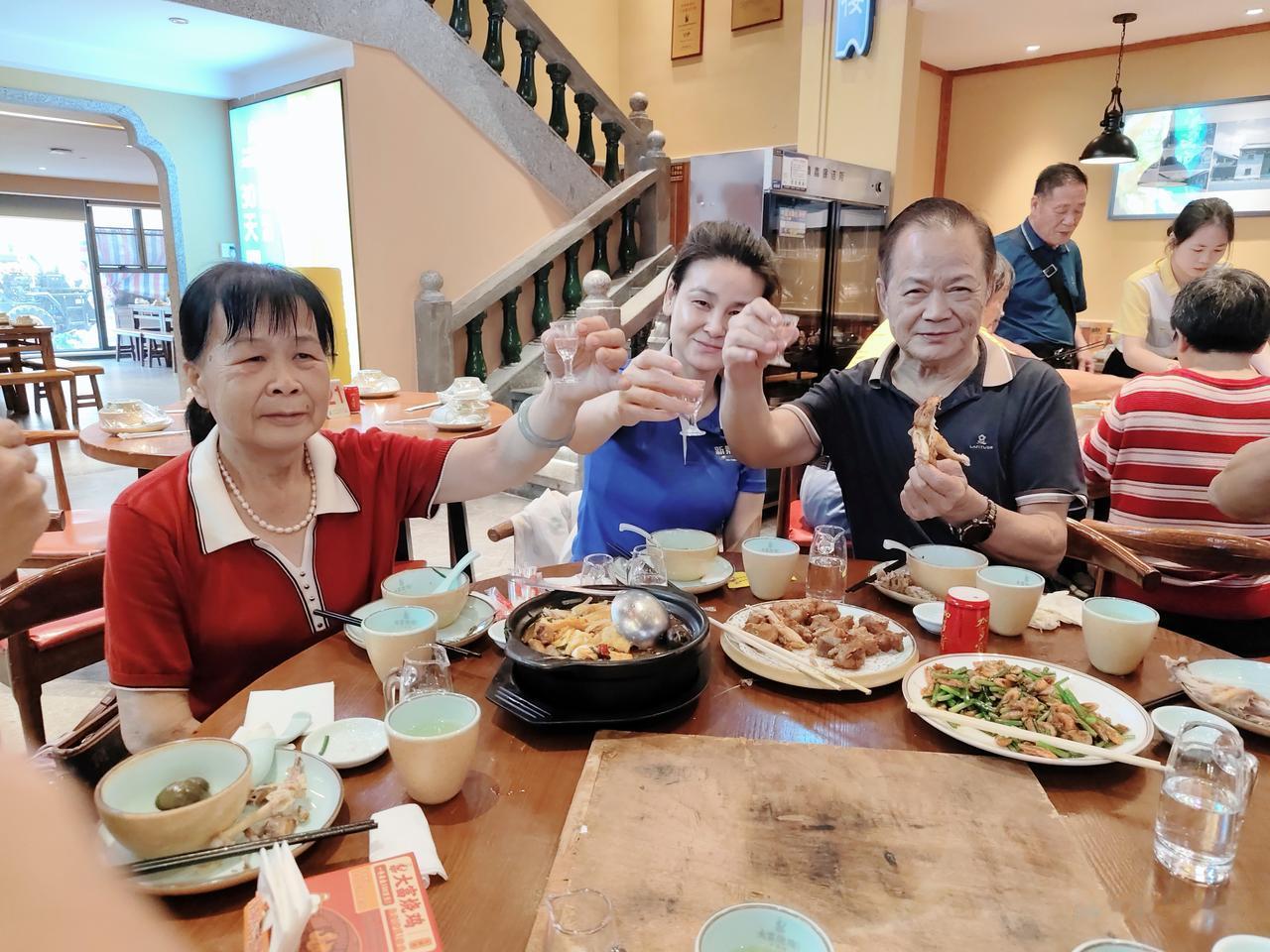 抵达贵港站后,大家直奔当地一家开了二十年的老牌“肥佬大排档”,美美享用了一顿地道午餐。特色柴火烤鸭、豉汁蒸野生塘鲺、油爆肥肠、本地红烧肉、木耳炒土鸡等八道菜肴满满当当,三桌丰盛宴席一共才一千一百多元,人均才四十元左右,实惠又好吃。