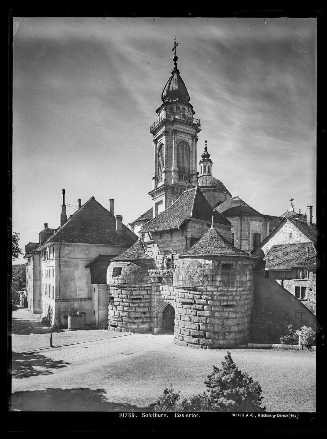 历史知识 1909年拍摄的瑞士古城索洛图恩(Solothurn)的中世纪巴塞尔门(Baseltor ),背后是圣乌尔森大教堂。图2是现在的巴塞尔门,图3是1947年的索洛图恩航拍。