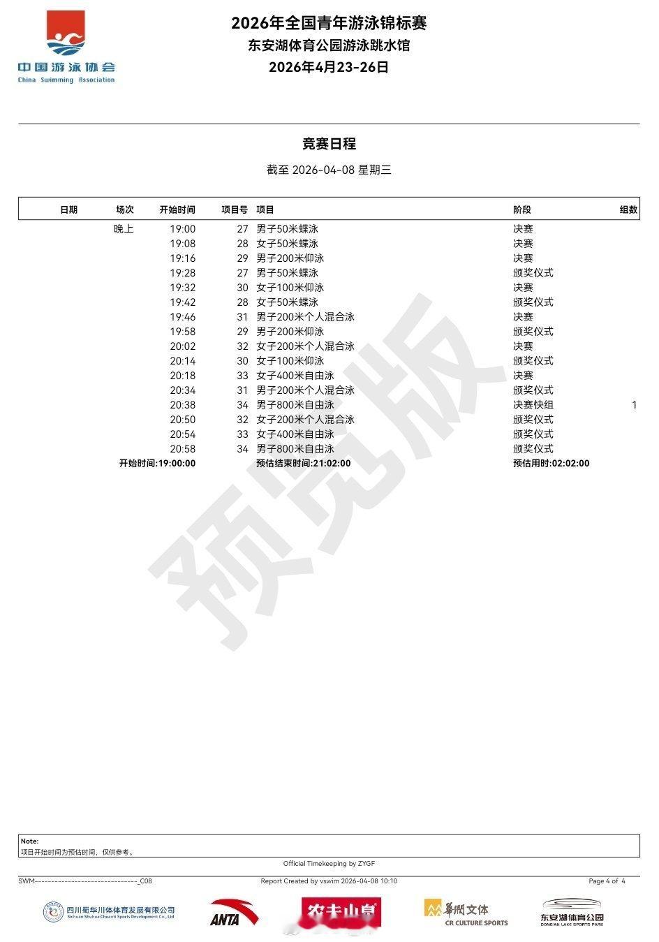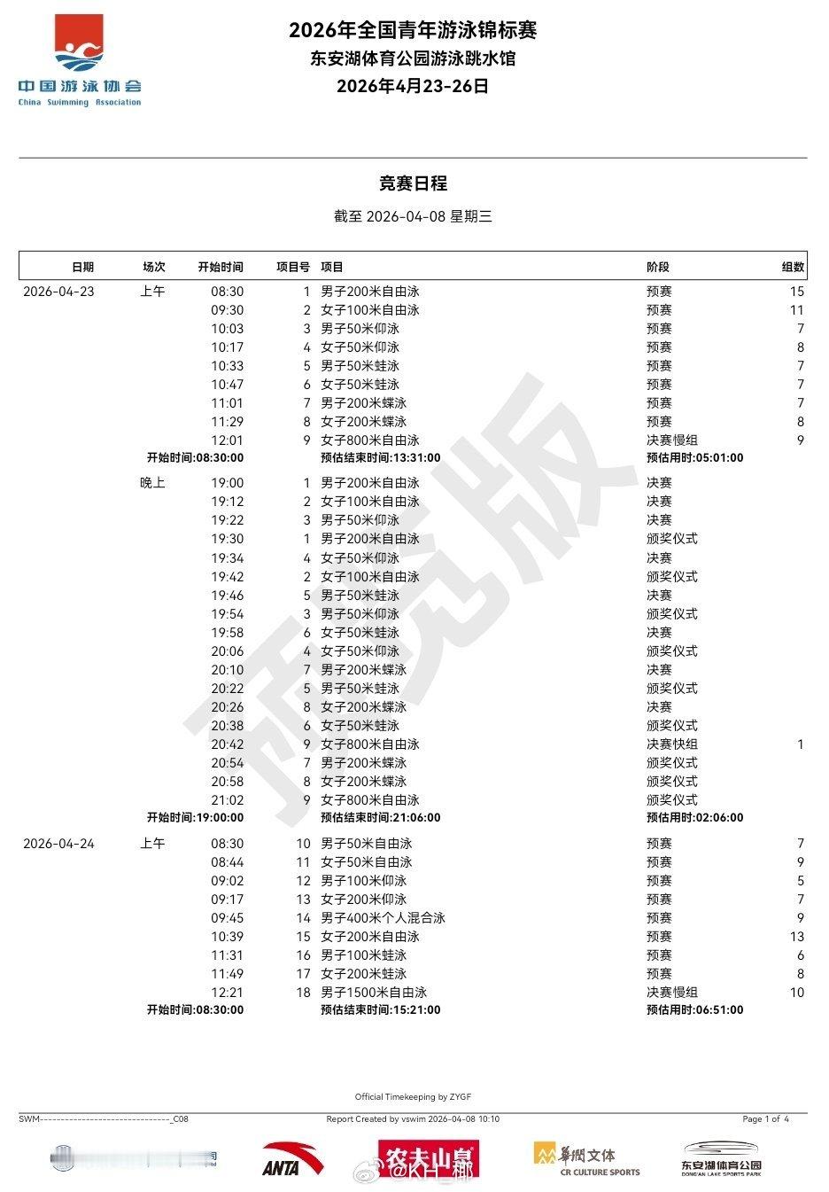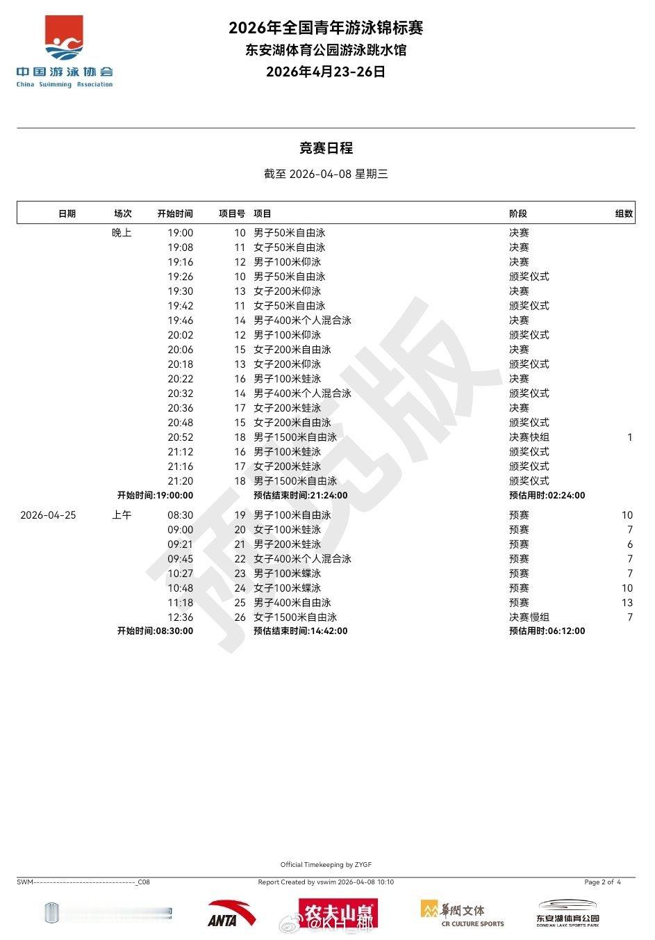 全国青年游泳锦标赛 (4.23-26)竞赛日程 地点:四川成都