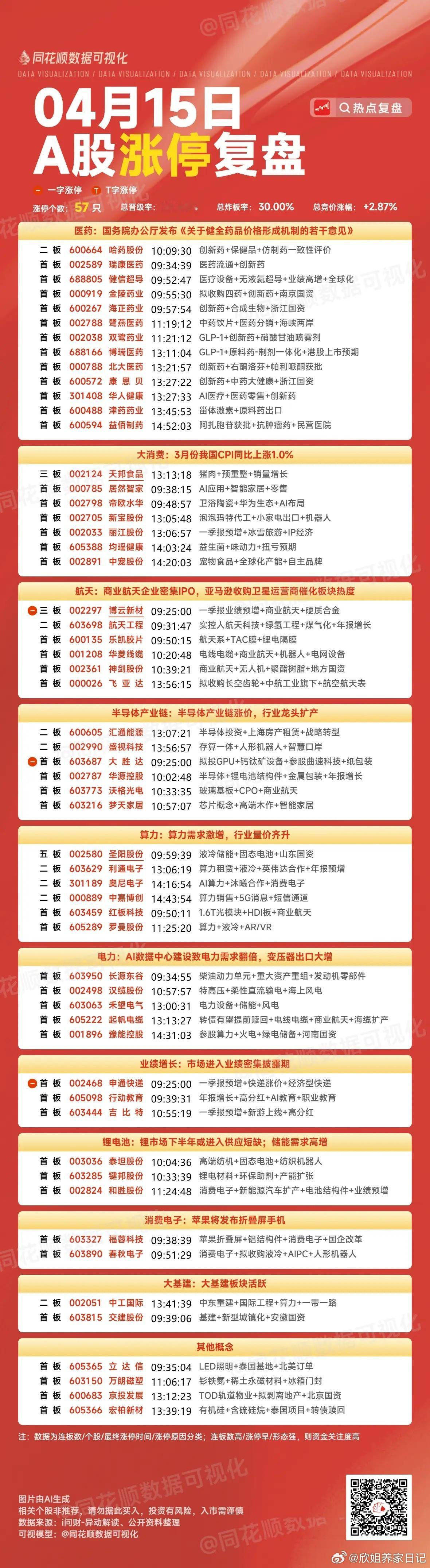 4月15日 今日A股涨停板连板阶梯梳理: 主要集中在医药、大消费、商业航天、半导体、算力等板块。
