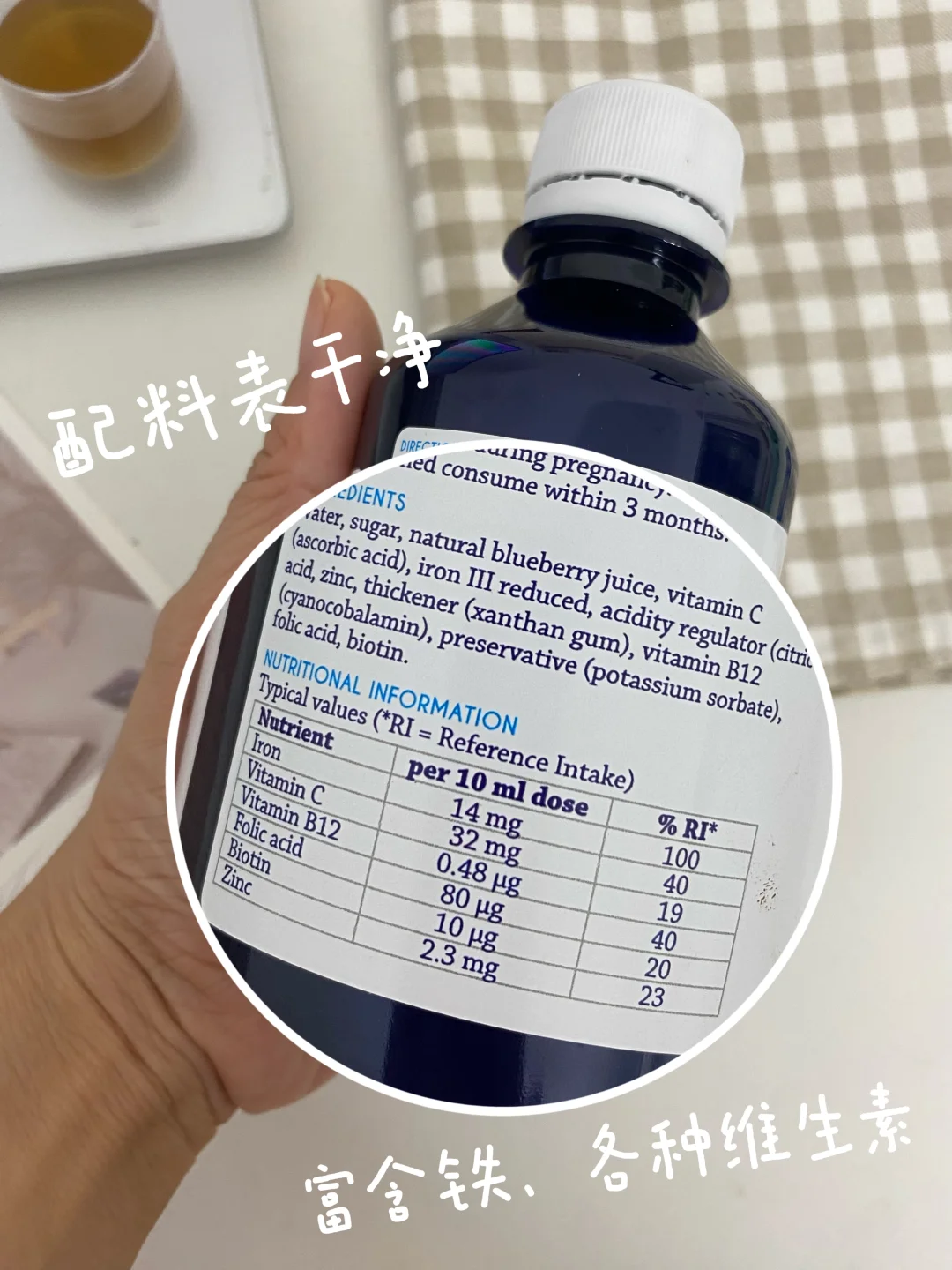 [赞R]人到中年,多把注意力放在自己的健康上,近期入了这款Bluelron铁元补充剂,每天上班前喝10毫升,含铁量为25毫克,满足了我每日所需。喝入口中,没有铁腥味,甜甜的,还含有丰富的VC、B12和叶酸。