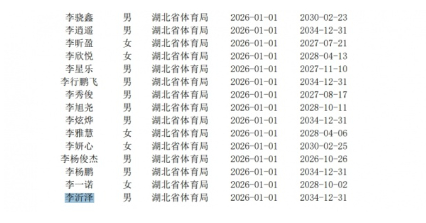 注册名单中,李沂泽注册单位为湖北省体育局,协议从26年1月1日起,结束时间为2034年12月31日。