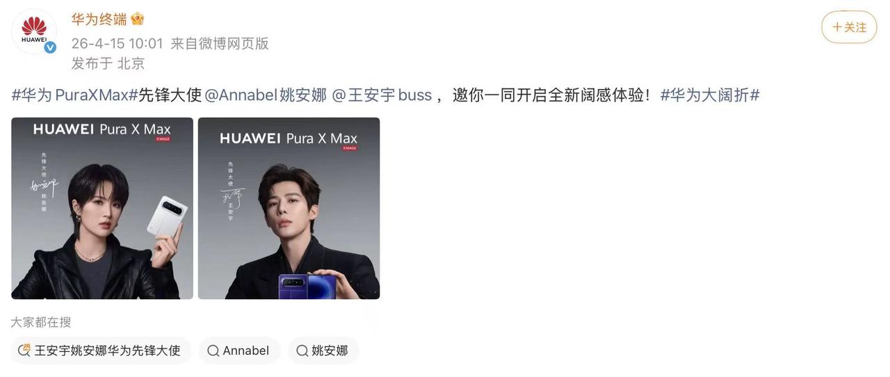 信息来源:界面新闻(2026-04-15);华为PuraXMax 姚安娜代言 折叠屏手机 苹果折叠屏