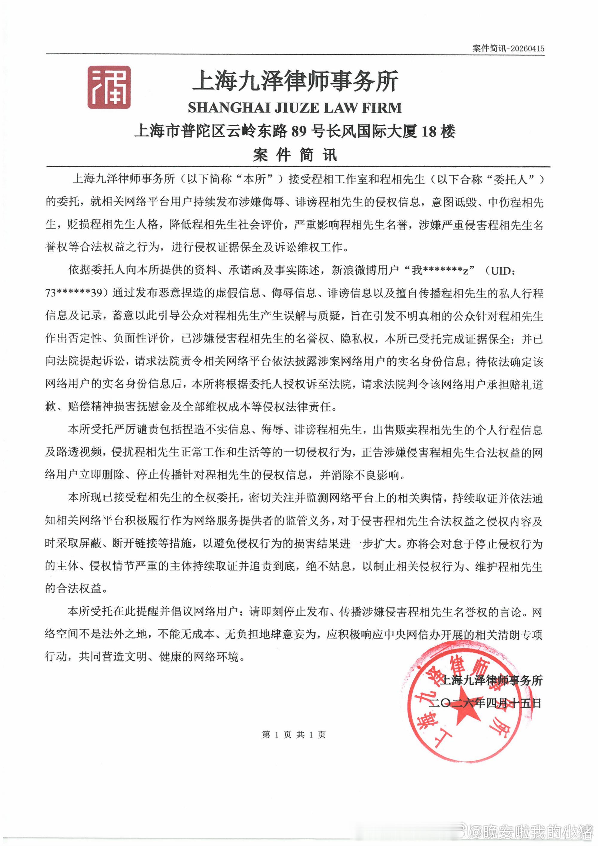 程相工作室发布声明,支持维权