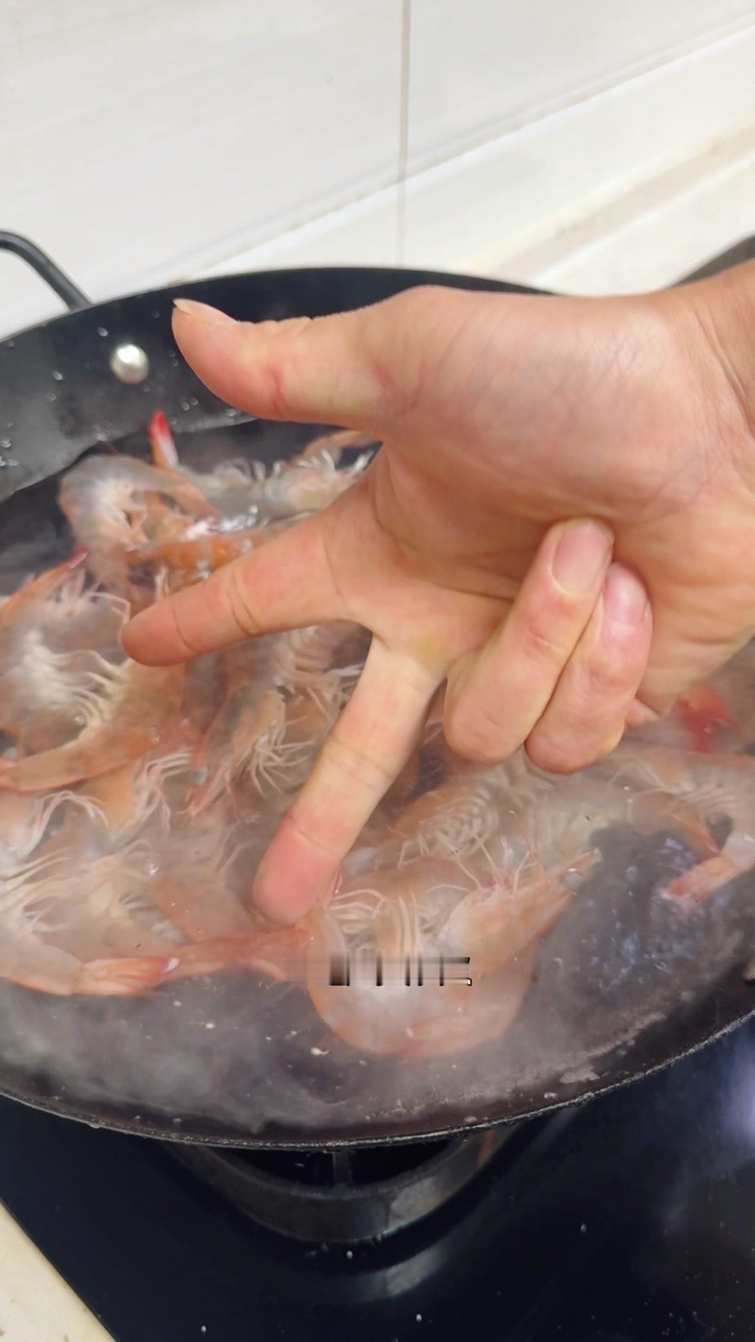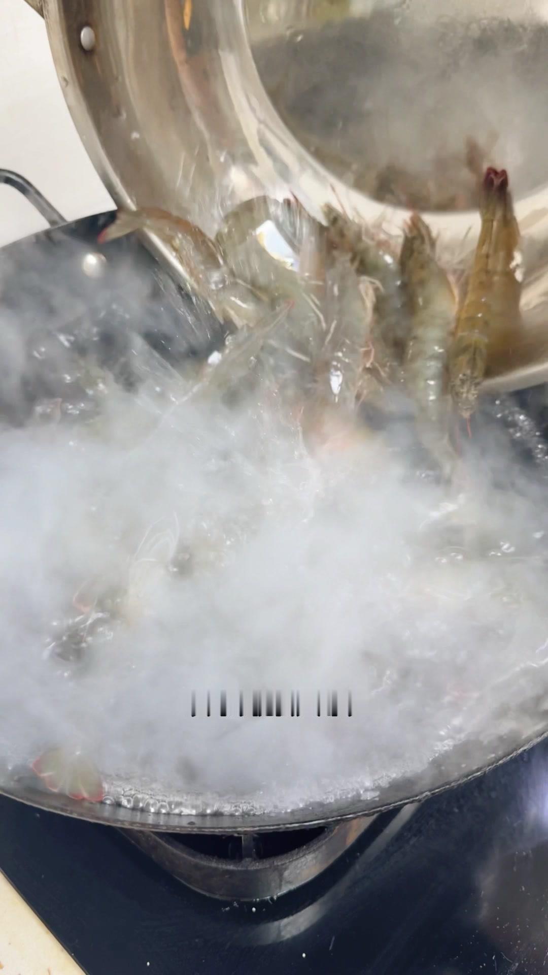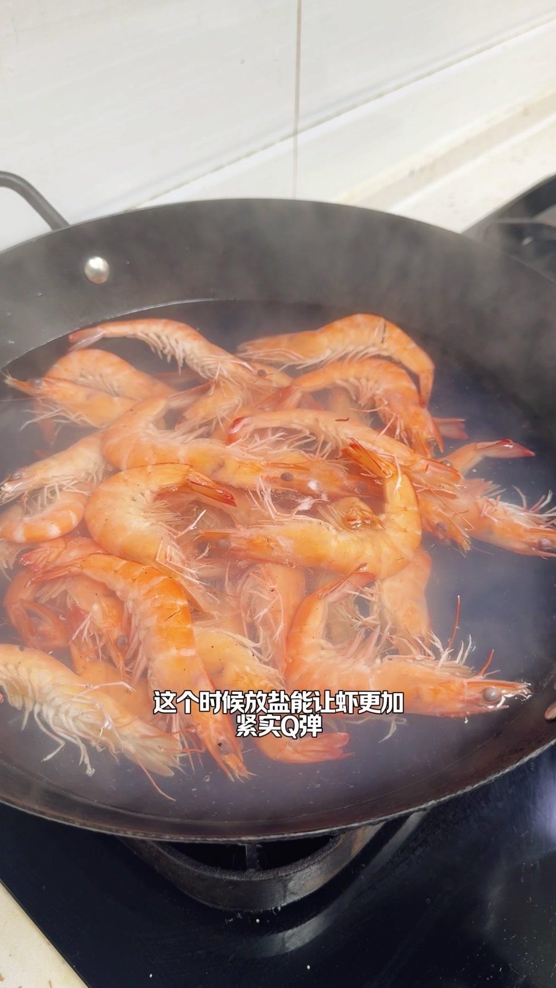 这时候放一勺糖能激发虾的鲜甜味,小火煮60秒后开始计时。新鲜的虾其实不需要放姜葱,盐这时候放能让虾肉更紧实Q弹,关火后再浸泡3分钟就熟了。