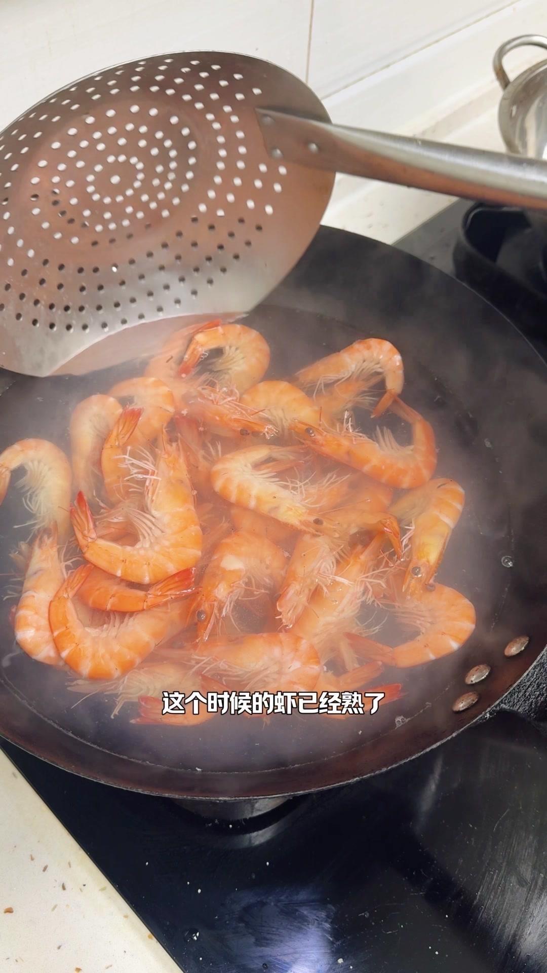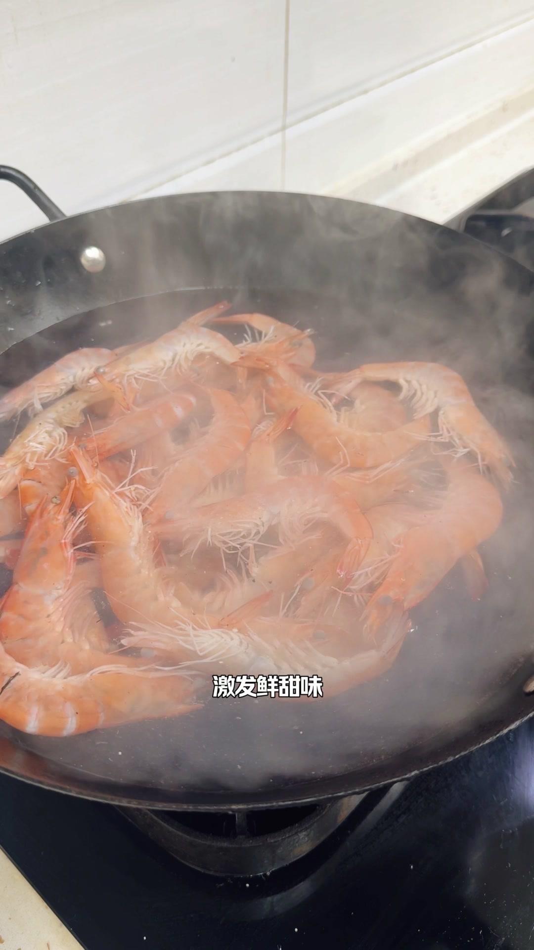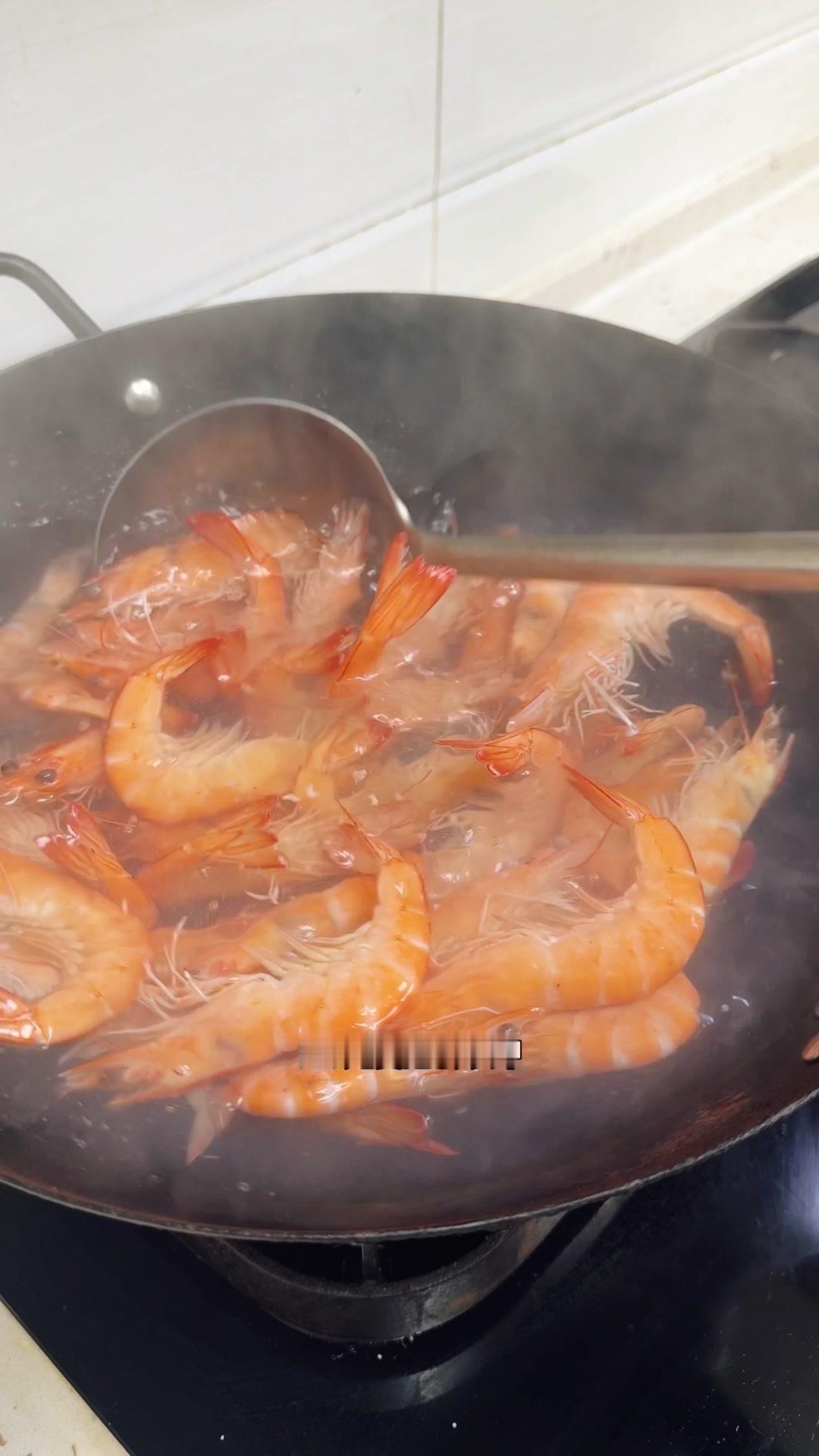 这时候放一勺糖能激发虾的鲜甜味,小火煮60秒后开始计时。新鲜的虾其实不需要放姜葱,盐这时候放能让虾肉更紧实Q弹,关火后再浸泡3分钟就熟了。