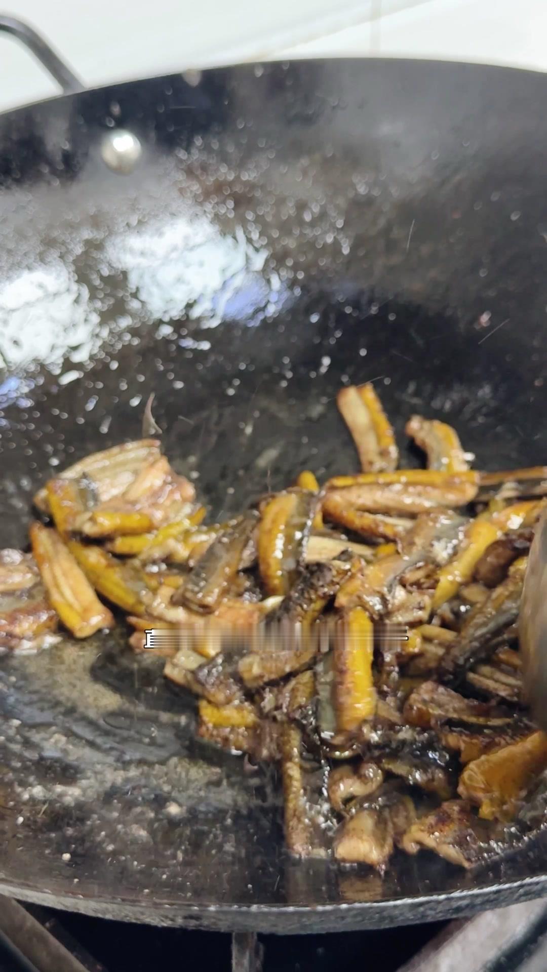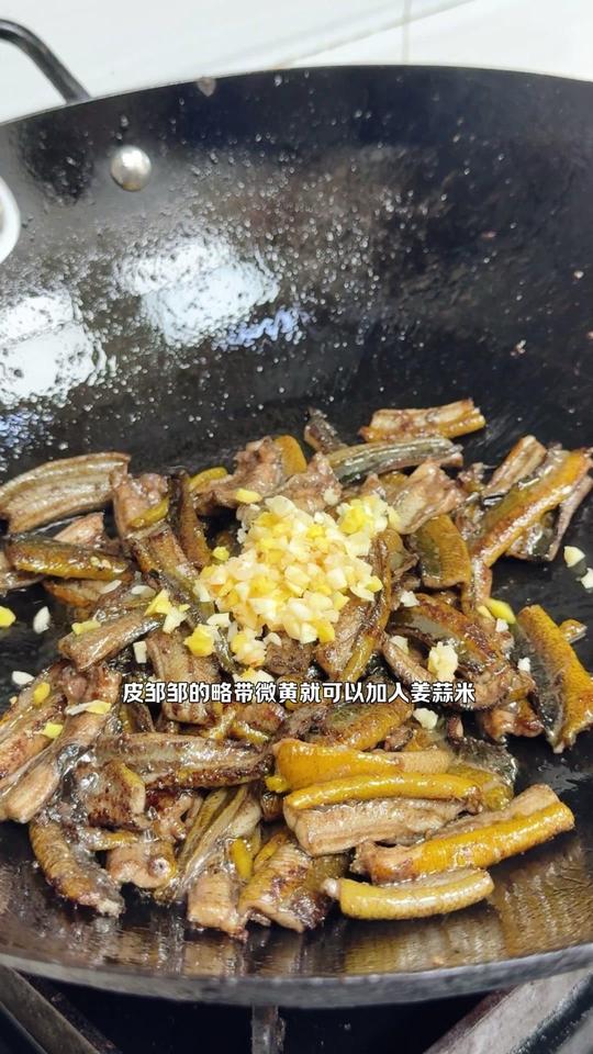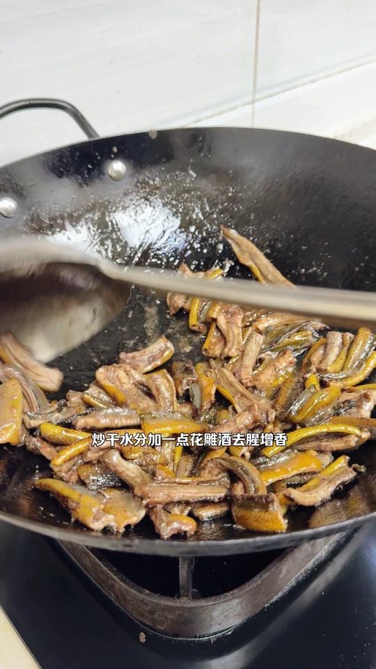 6成油温倒入鳝鱼爆炒,炒干水分,加一点花雕酒去腥增香,直到把鳝鱼爆香,爆至皮皱皱的略带微黄。