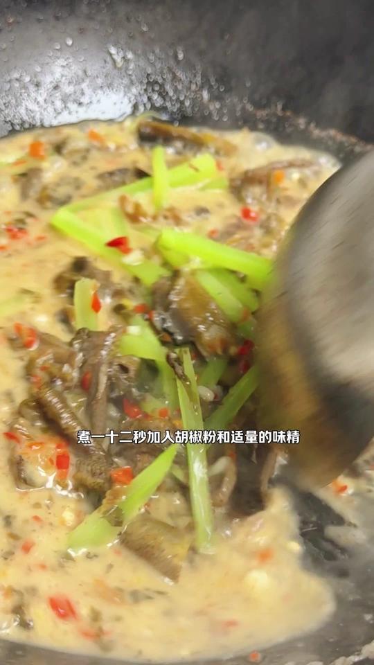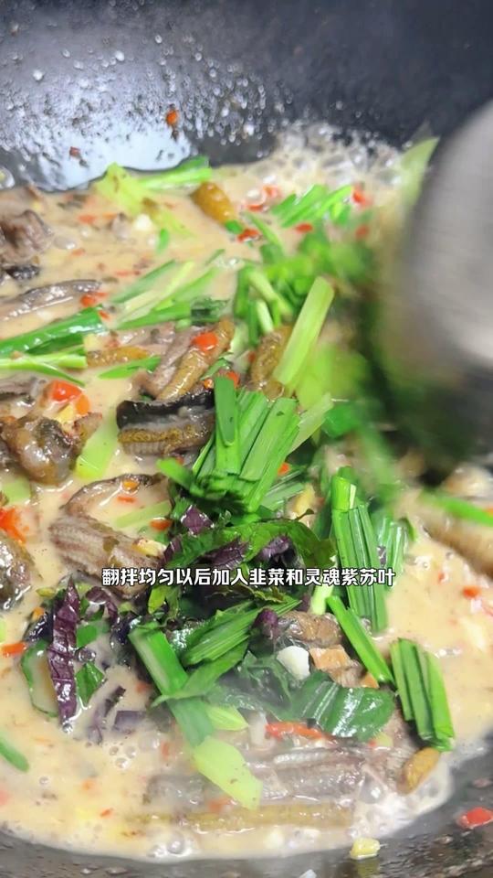 放入莴笋丝煮12秒,加入胡椒粉和适量的味精,翻拌均匀以后加入韭菜和灵魂紫苏叶,最后煮个5-8秒。