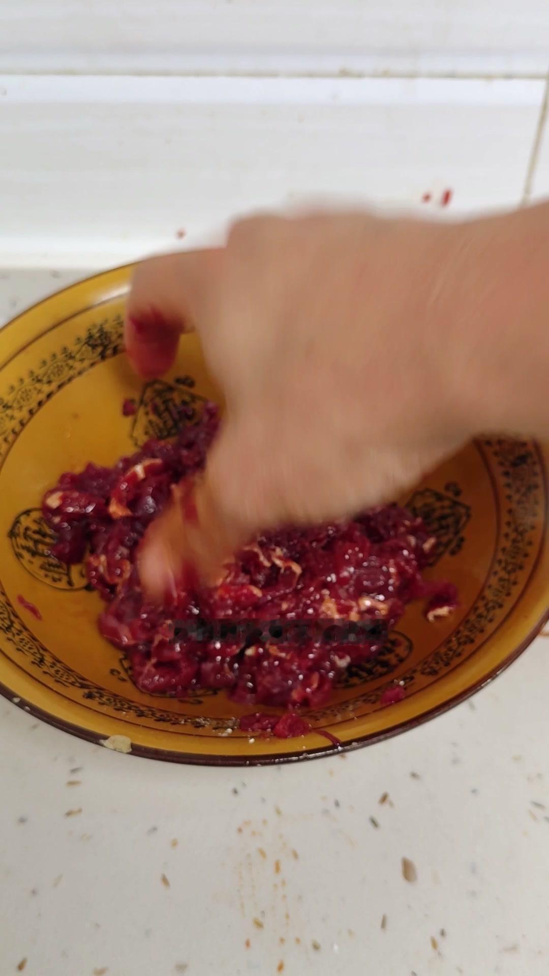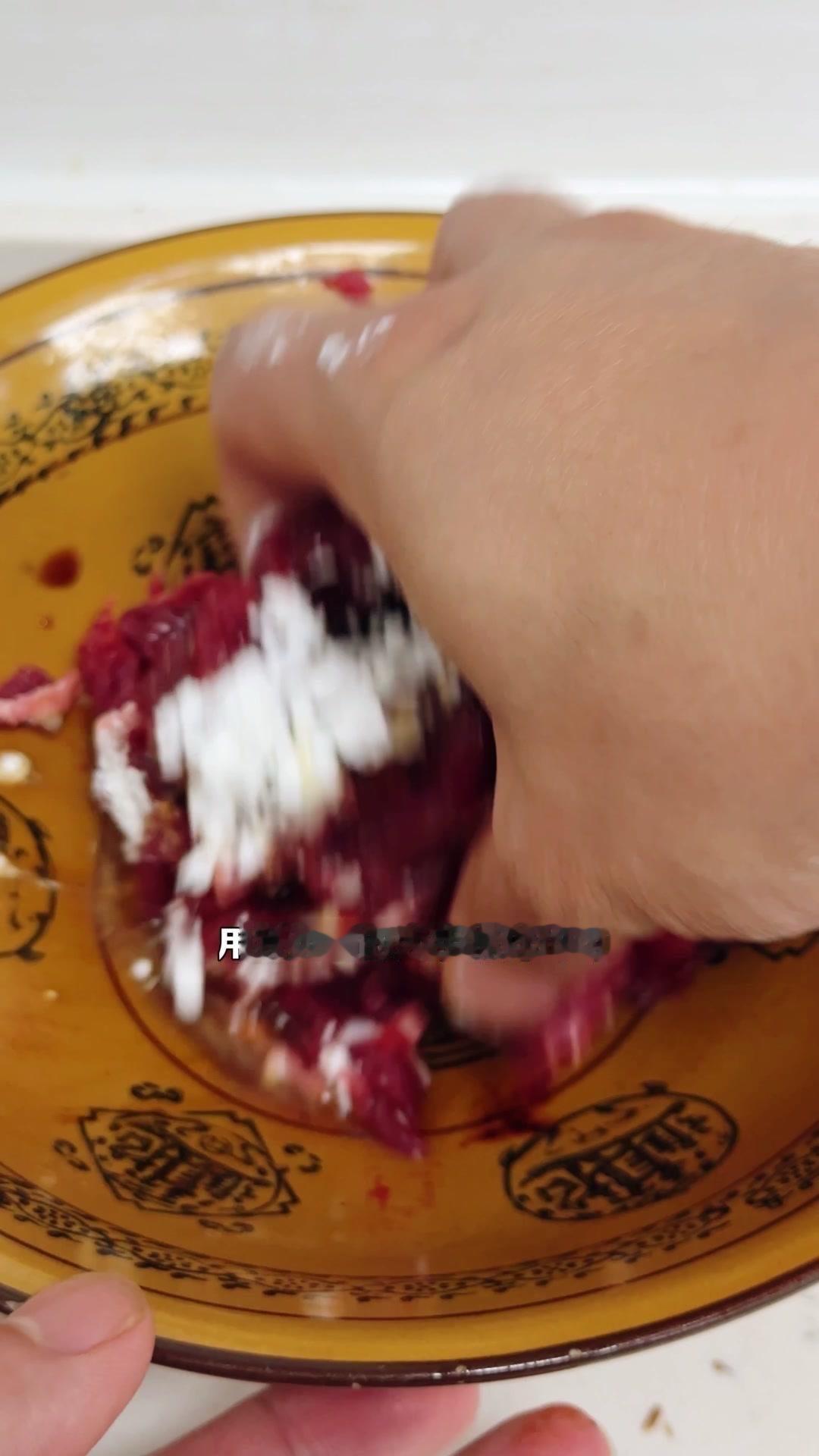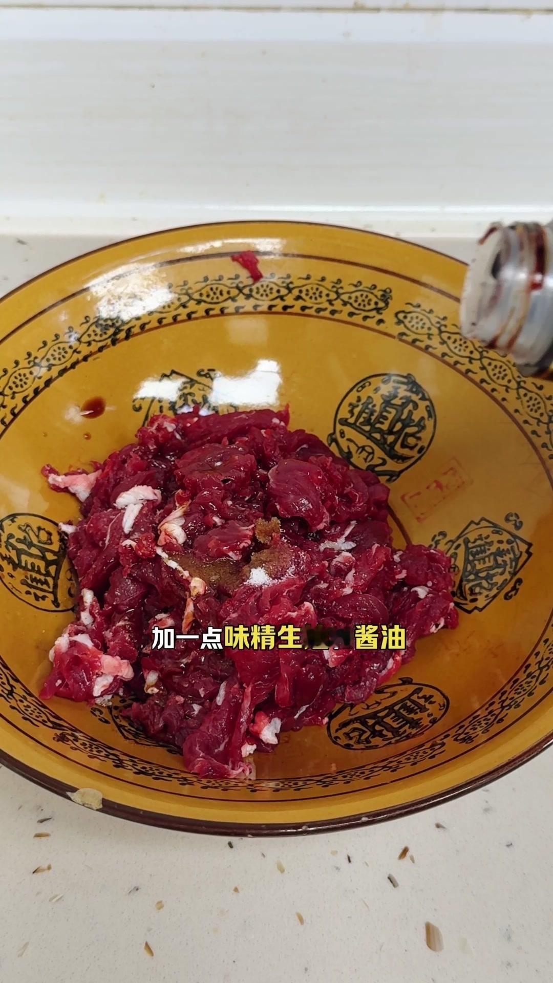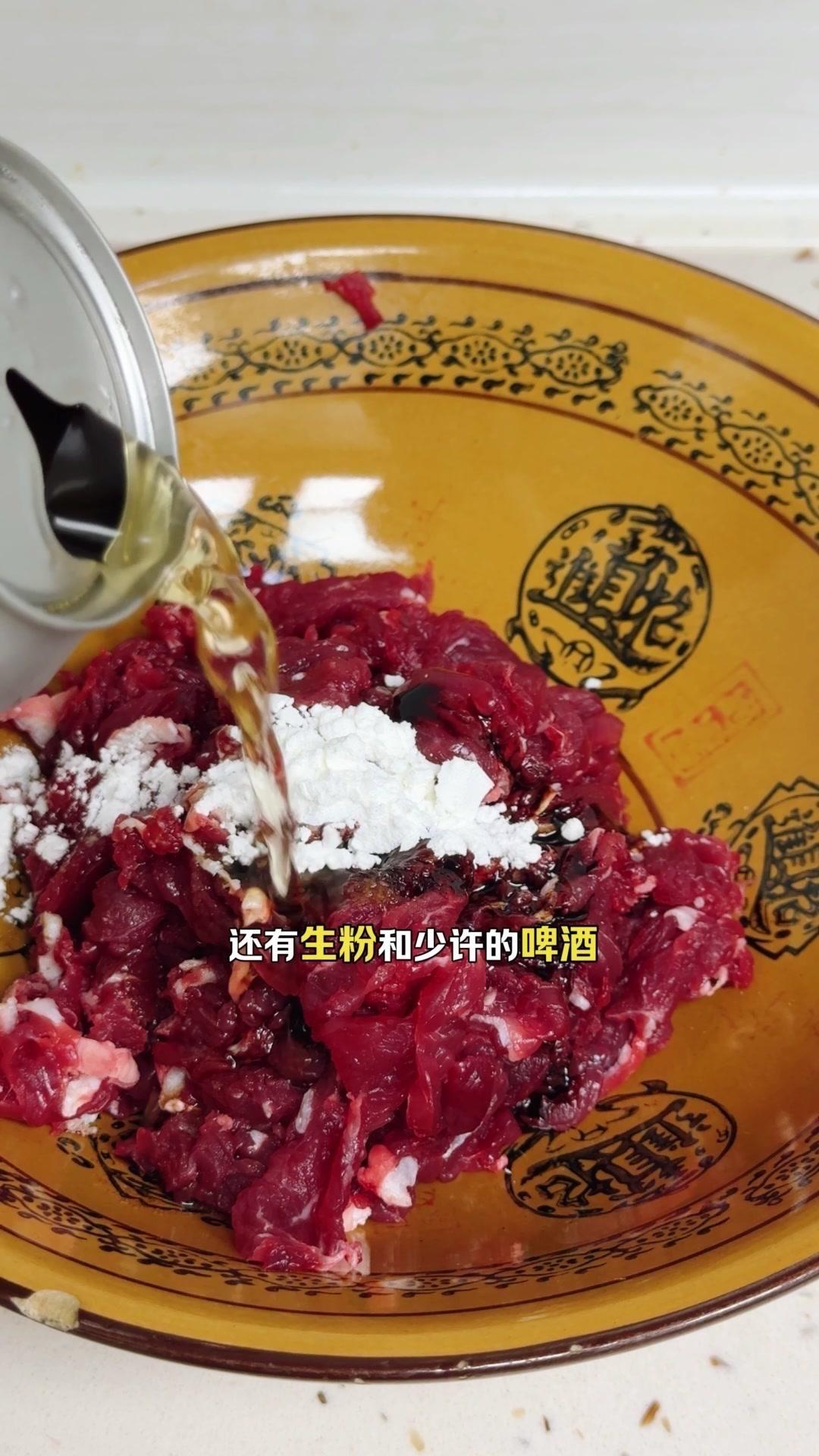 2️⃣腌制牛肉:加一点味精、生抽和酱油、生粉和少许啤酒,用手抓拌均匀,再加一点油抓匀,炒的时候不易粘连。