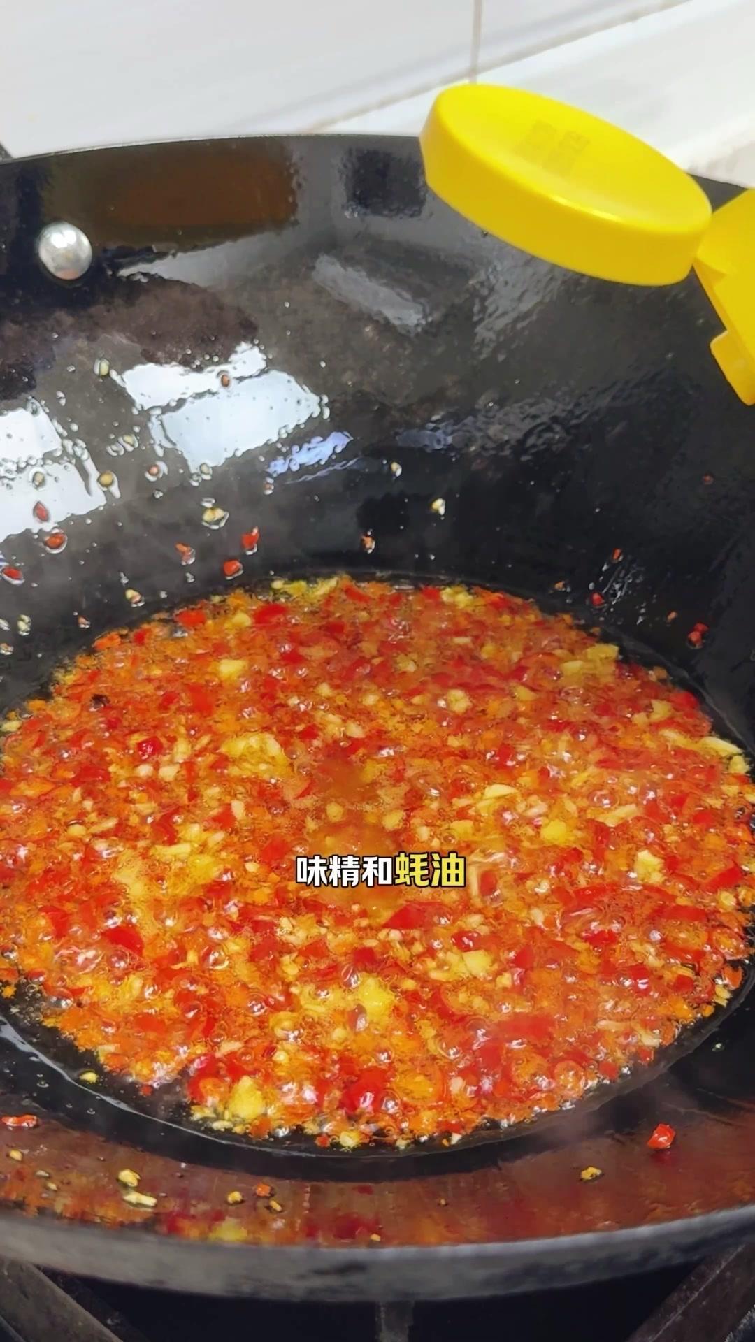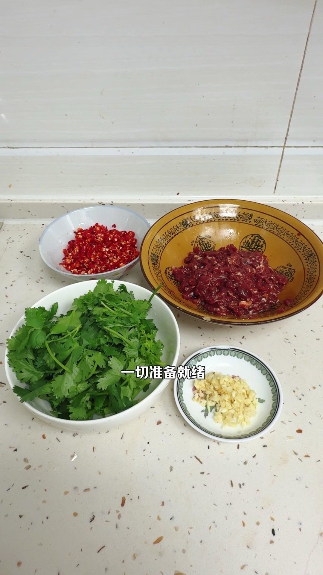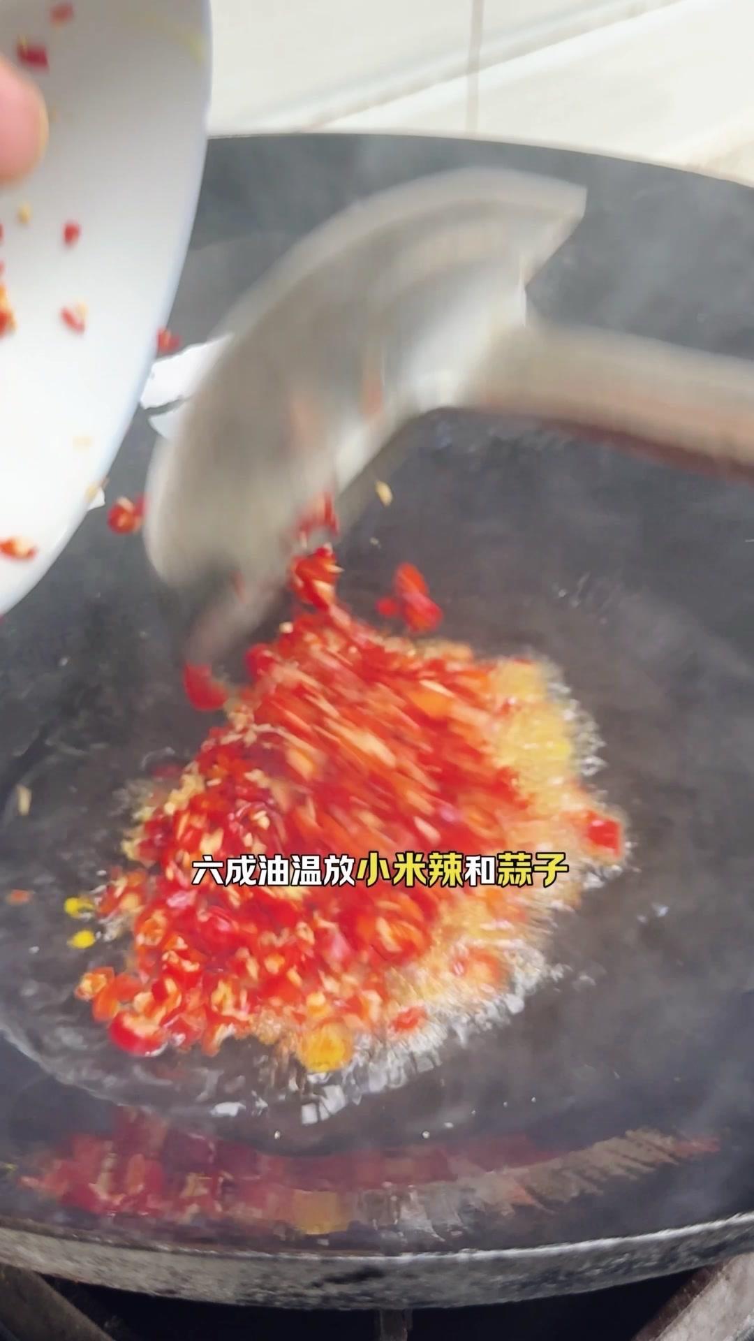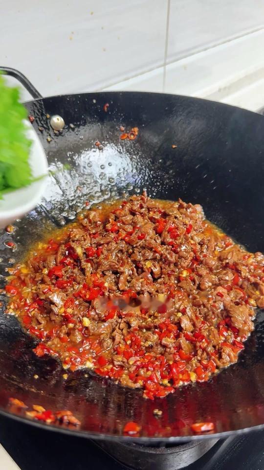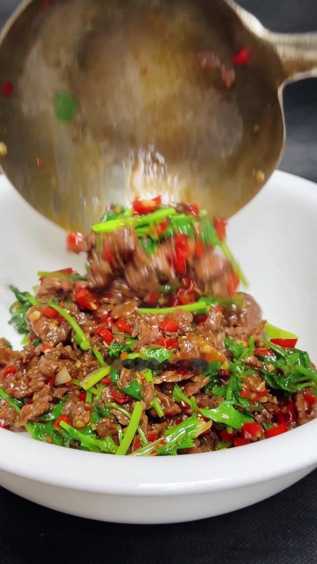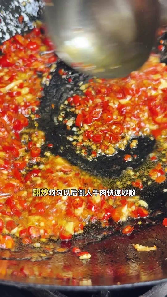 3️⃣起锅烧油:6成油温放小米辣和蒜子,炒出香辣味后,加一点盐、味精和蚝油,翻炒均匀后倒入牛肉快速炒散。牛肉一旦变色,立马倒入香菜,快速翻炒5-8下即可出锅装盘。