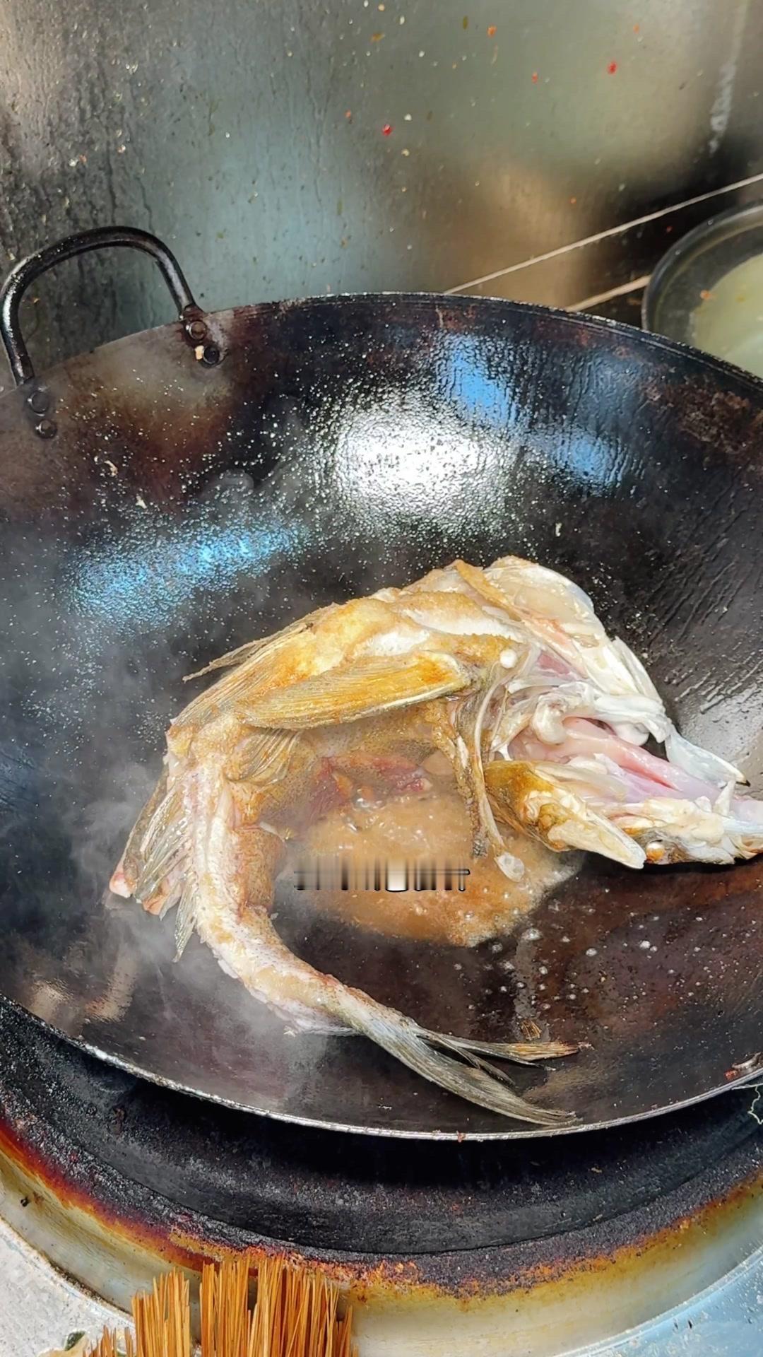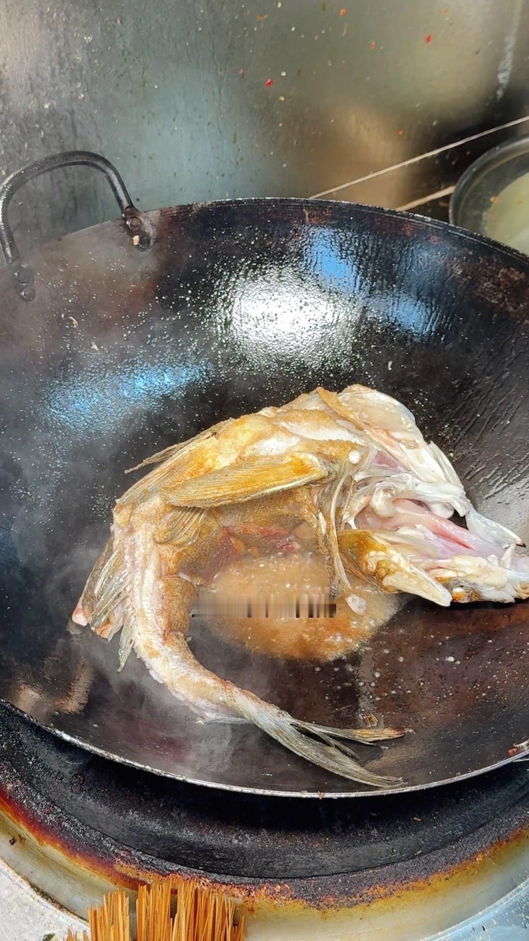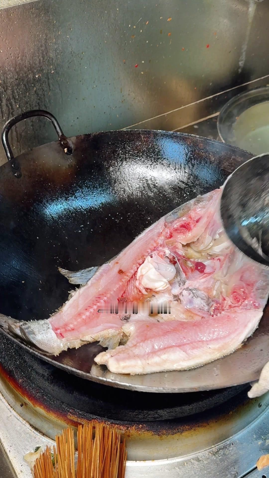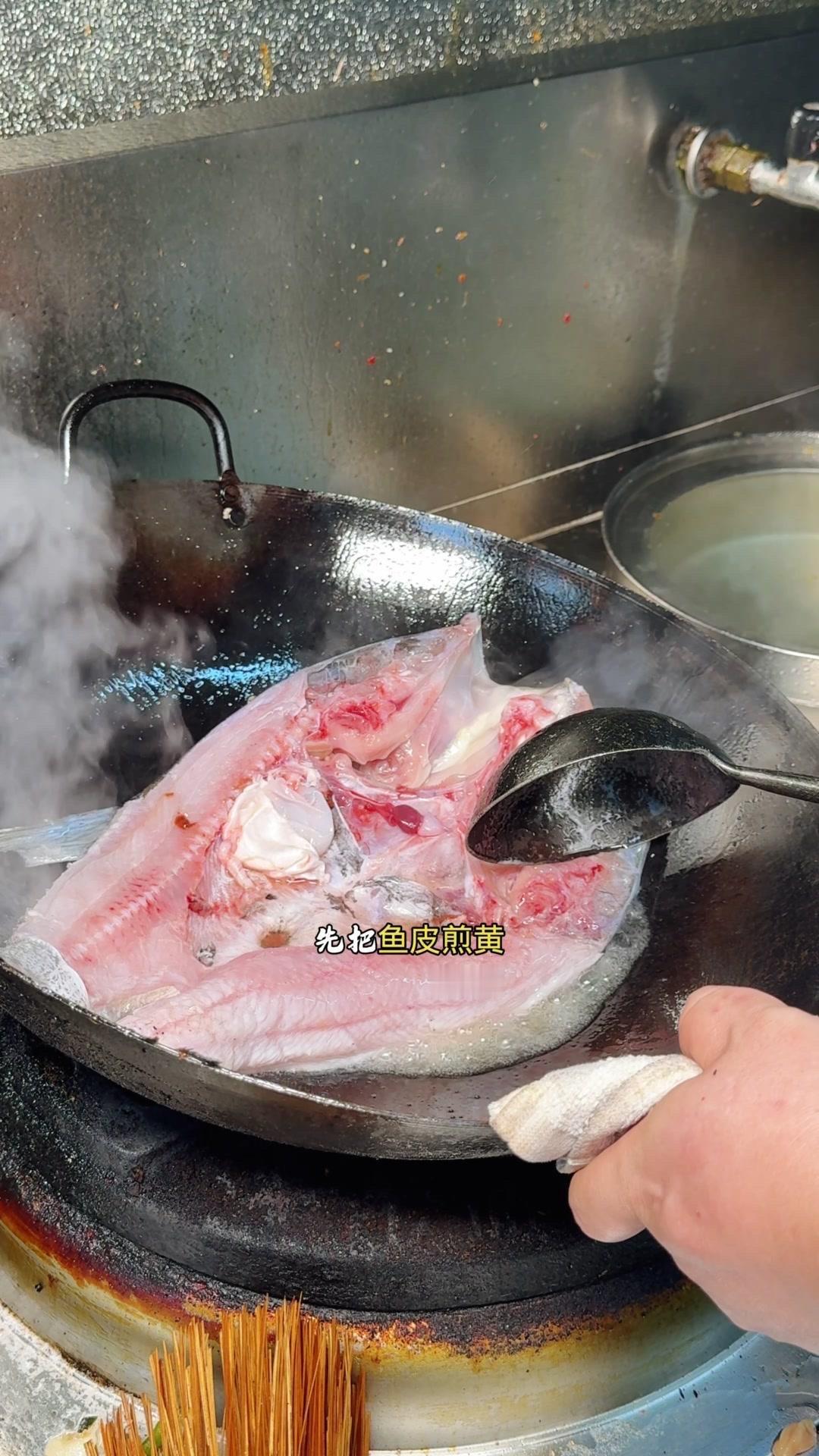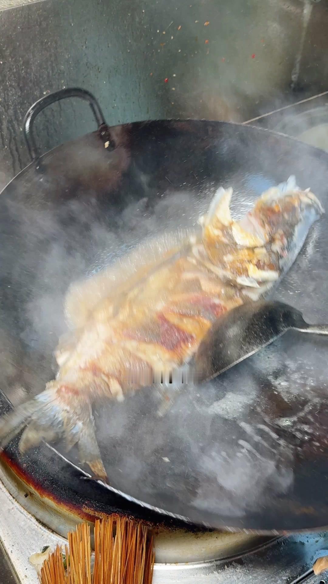 3️⃣从锅边淋入白醋,去腥的同时能让鱼肉更加细嫩。杨总趁雄鱼不注意给它翻面,鱼皮颜色金黄。