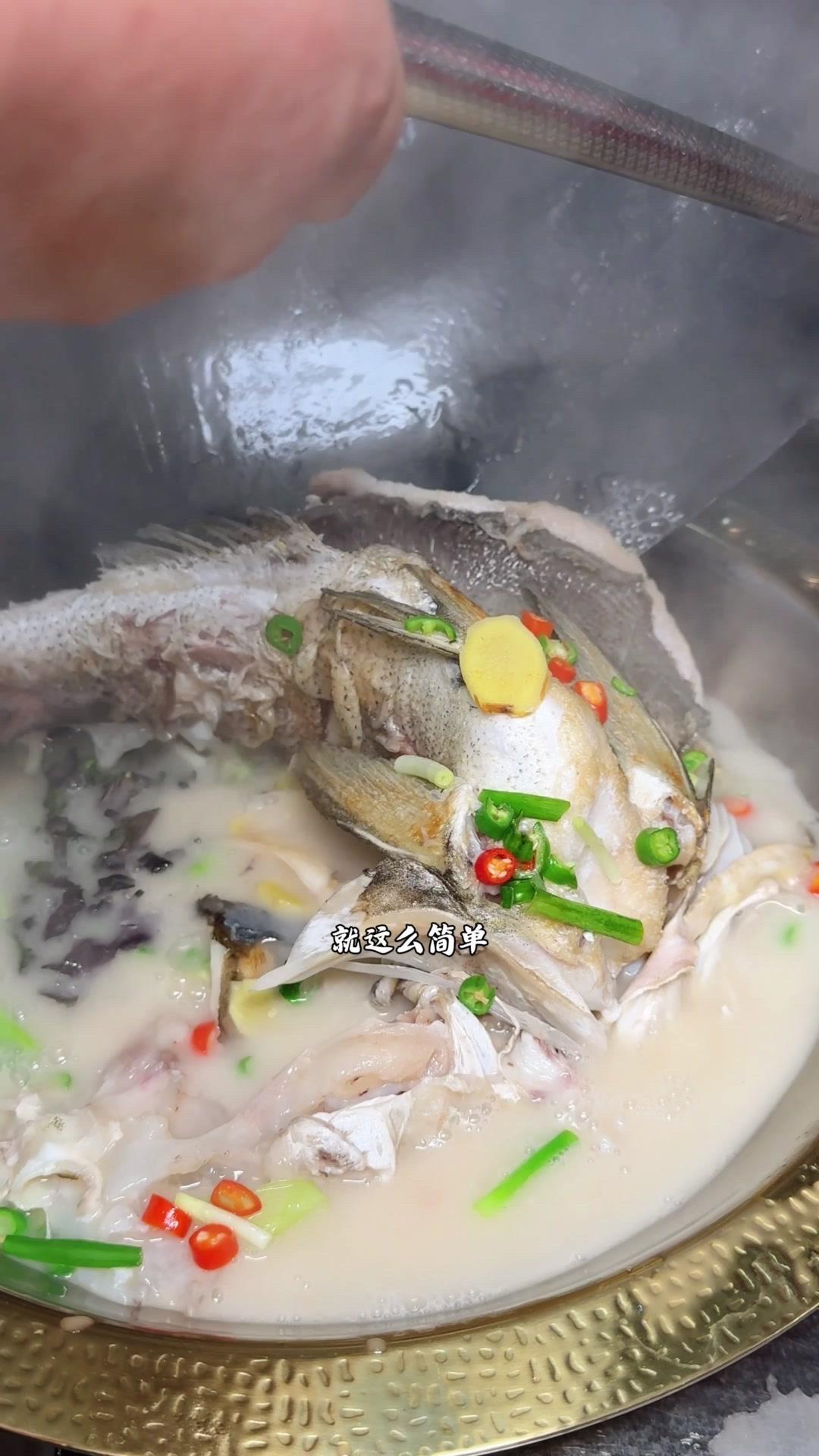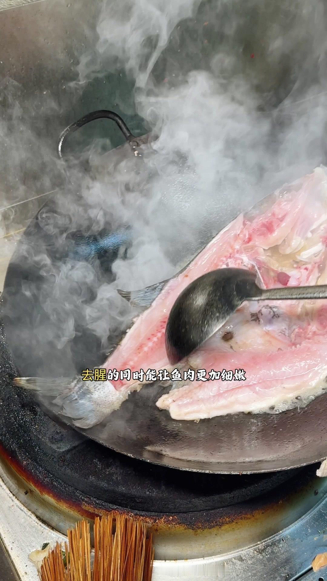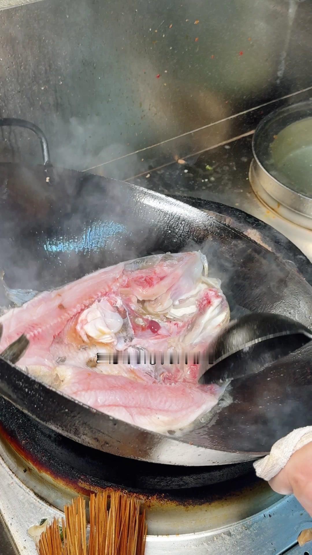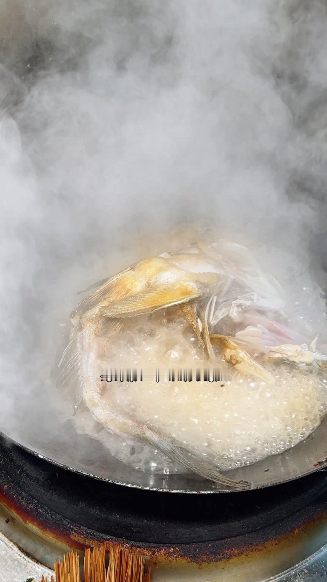 3️⃣从锅边淋入白醋,去腥的同时能让鱼肉更加细嫩。杨总趁雄鱼不注意给它翻面,鱼皮颜色金黄。