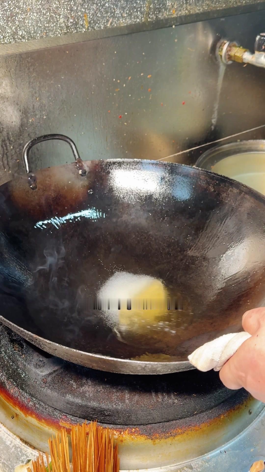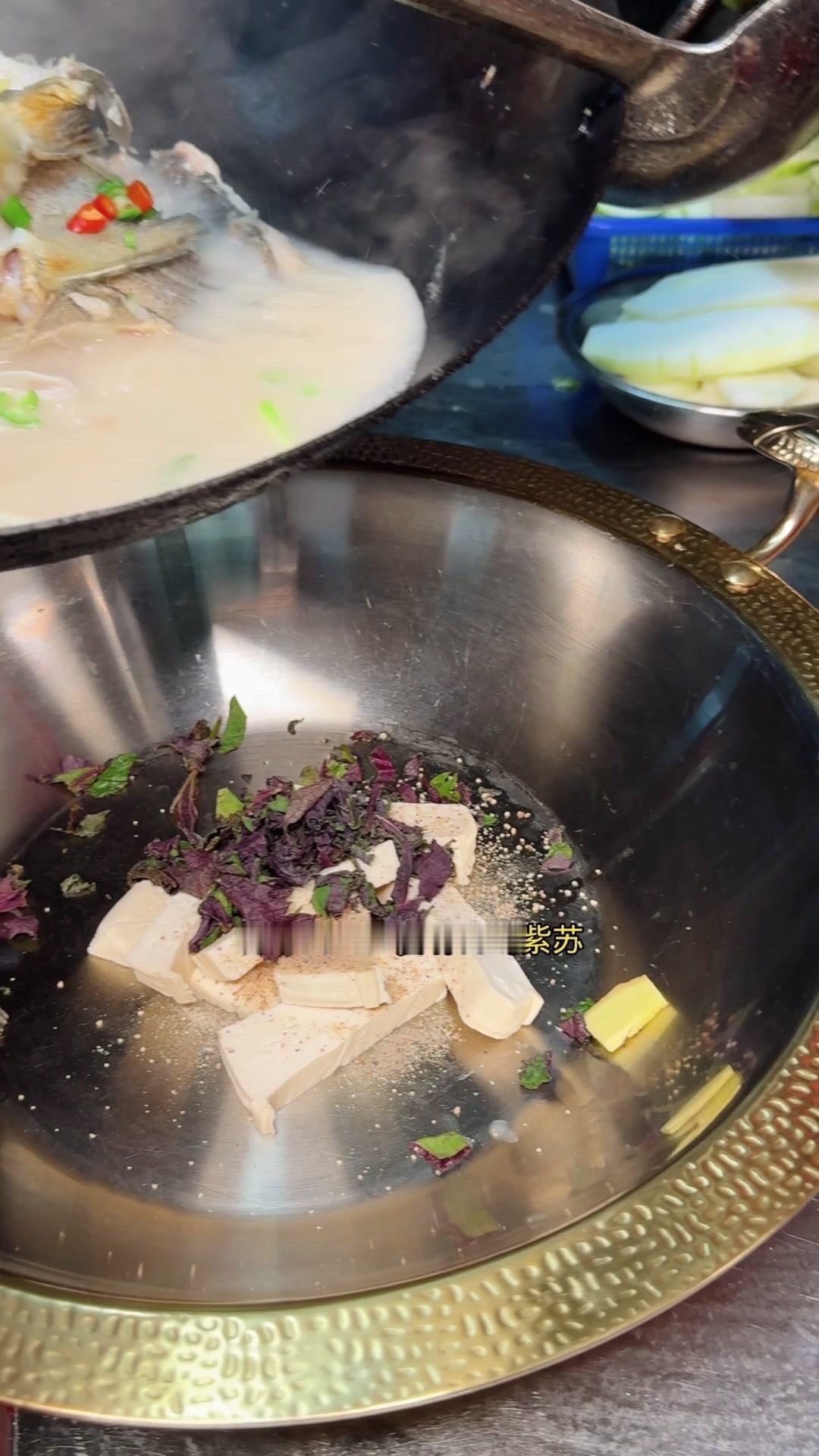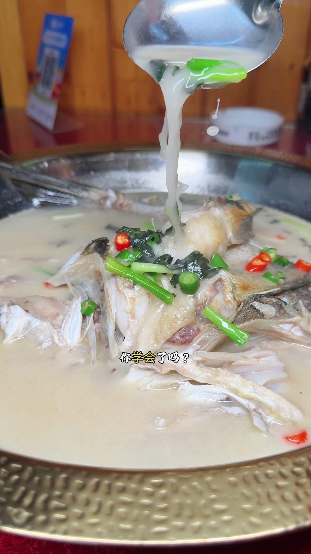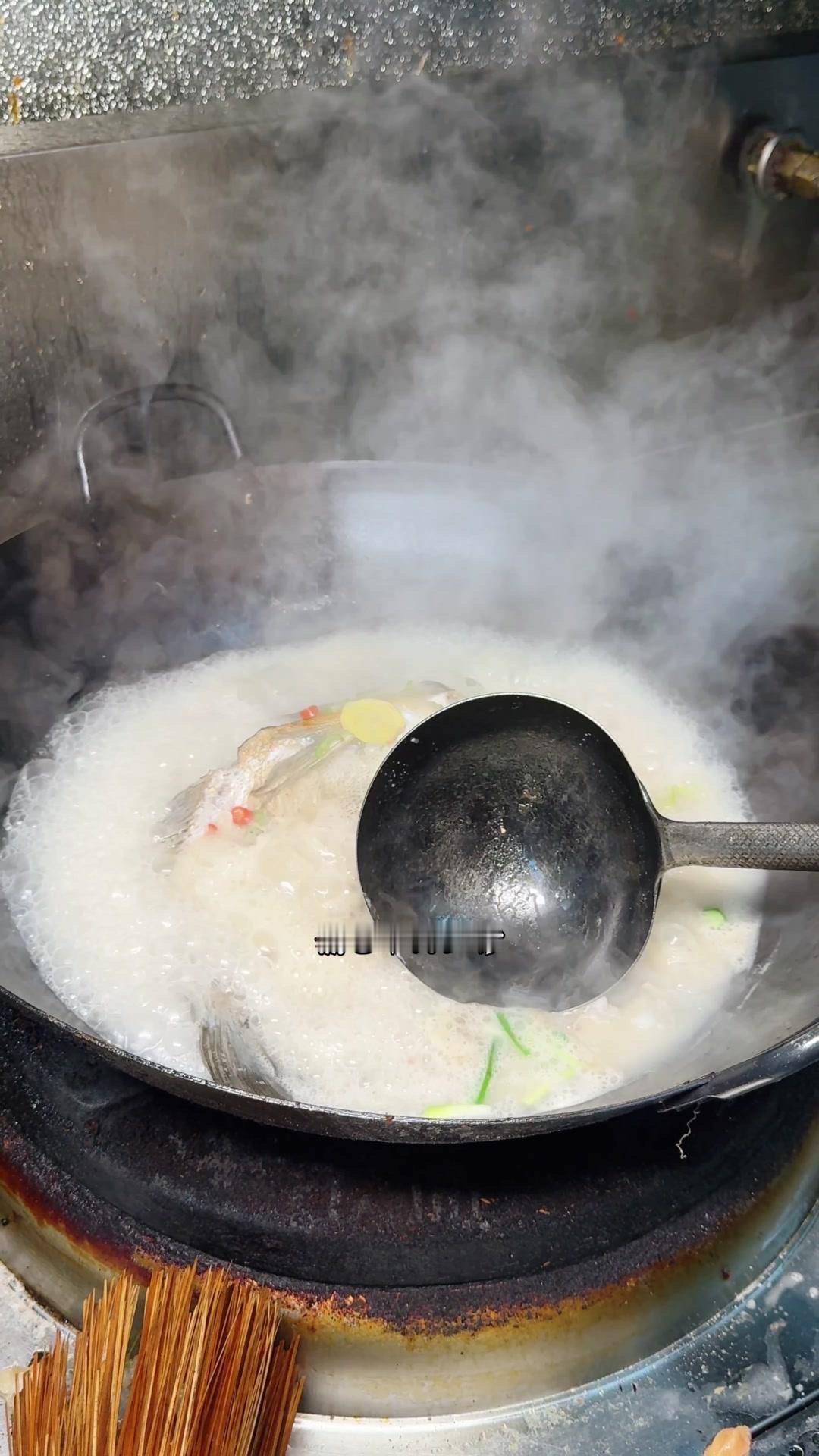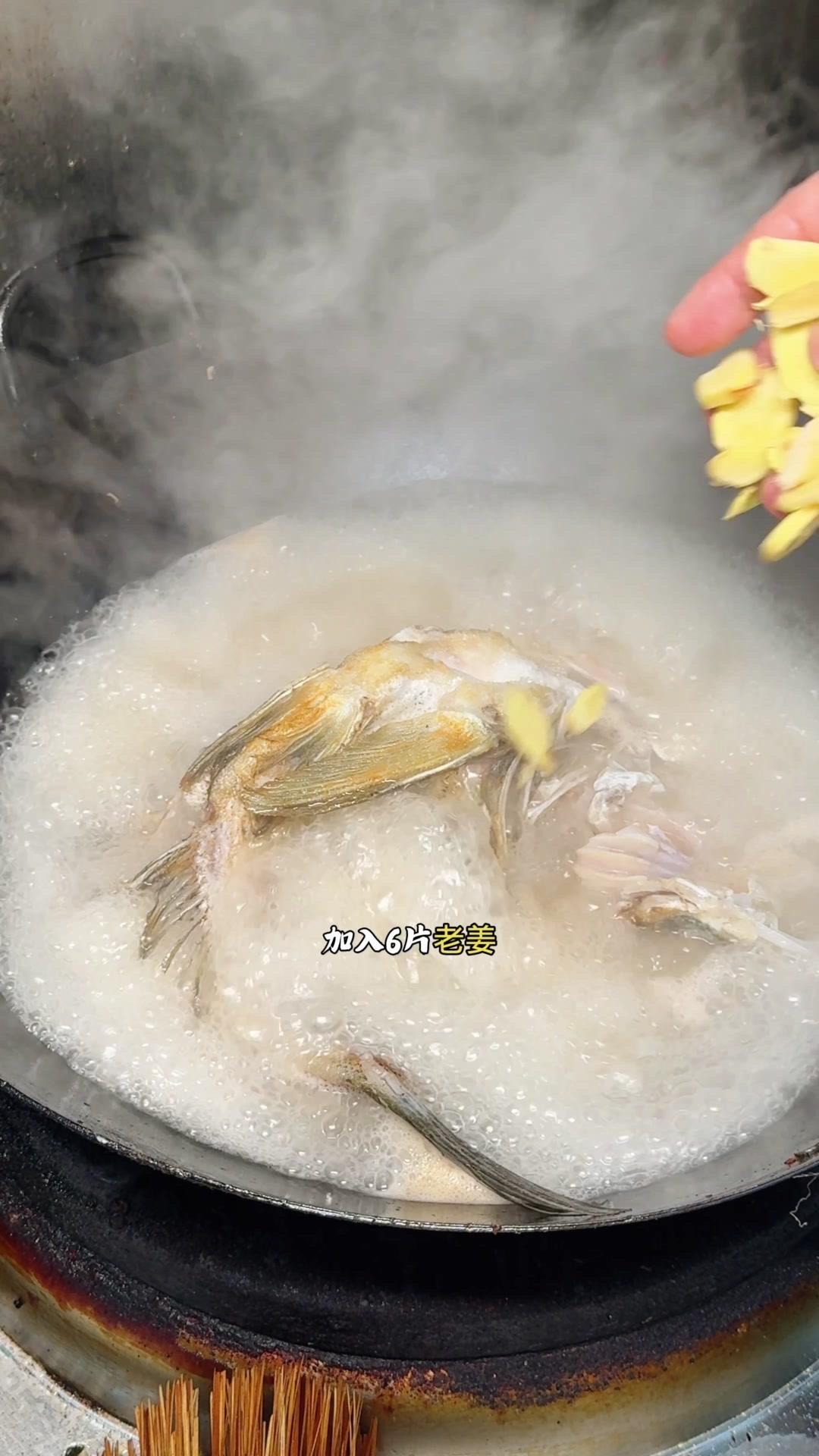 3️⃣从锅边淋入白醋,去腥的同时能让鱼肉更加细嫩。杨总趁雄鱼不注意给它翻面,鱼皮颜色金黄。