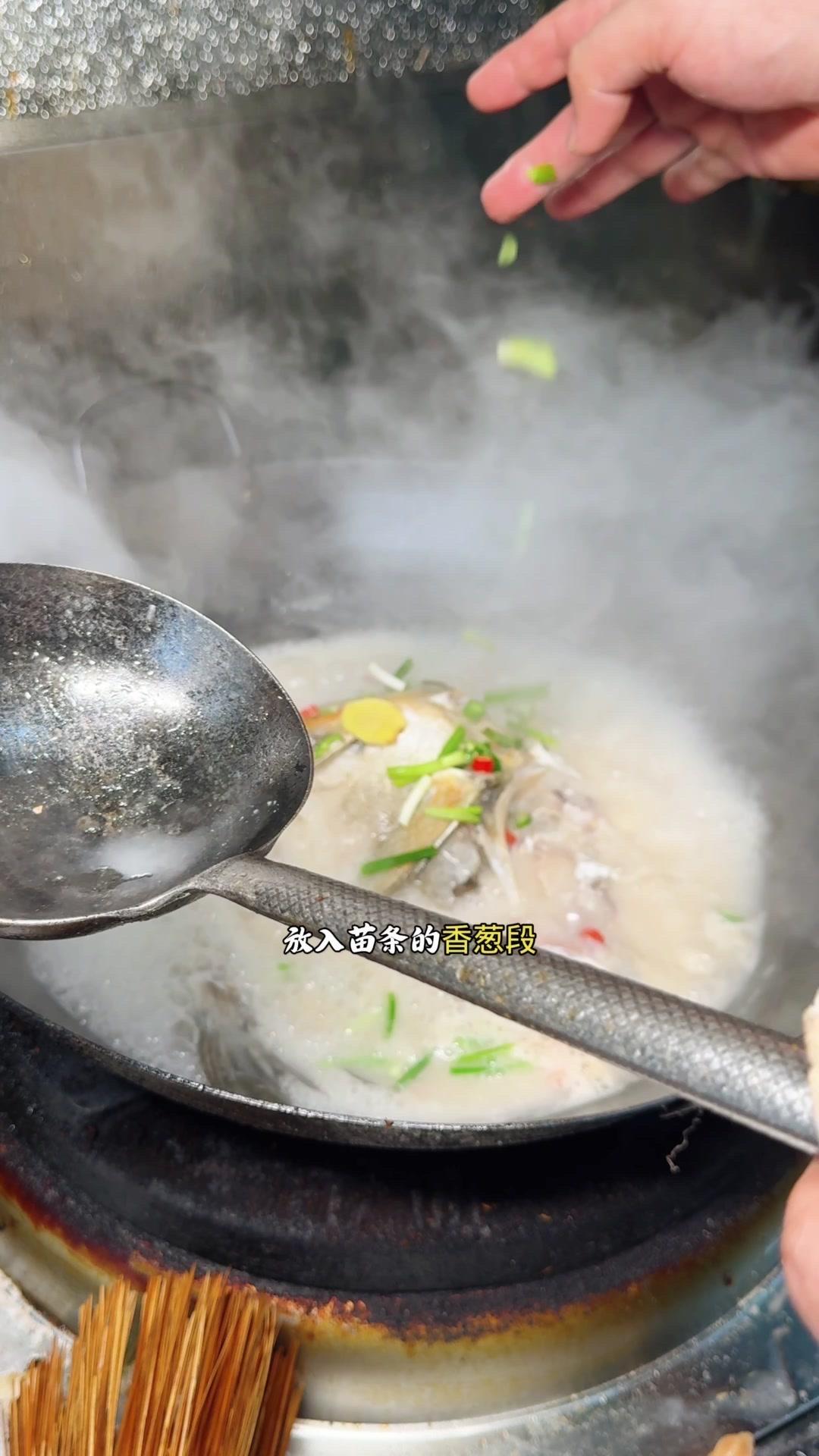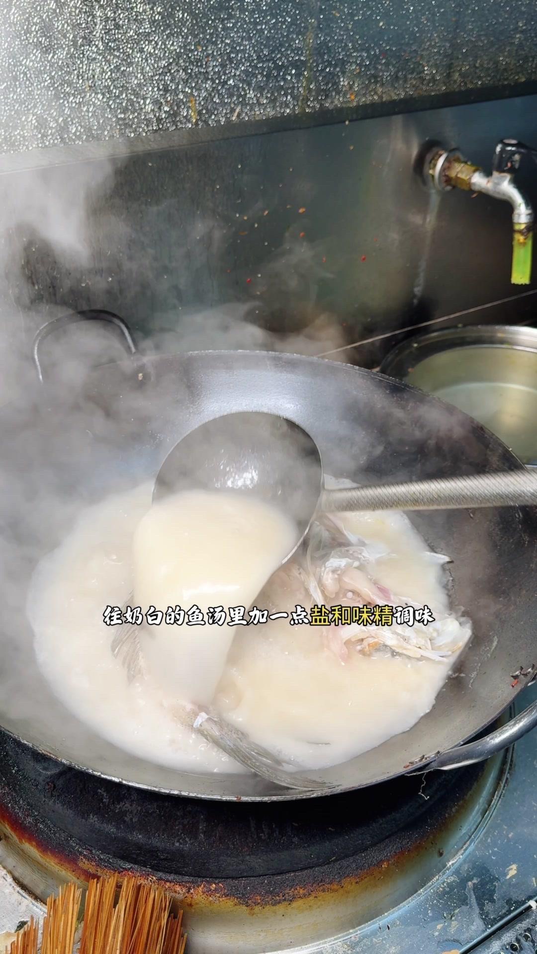 5️⃣时间到,往奶白的鱼汤里加一点盐和味精调味,放入苗条的香葱段,煮2-3秒即可。