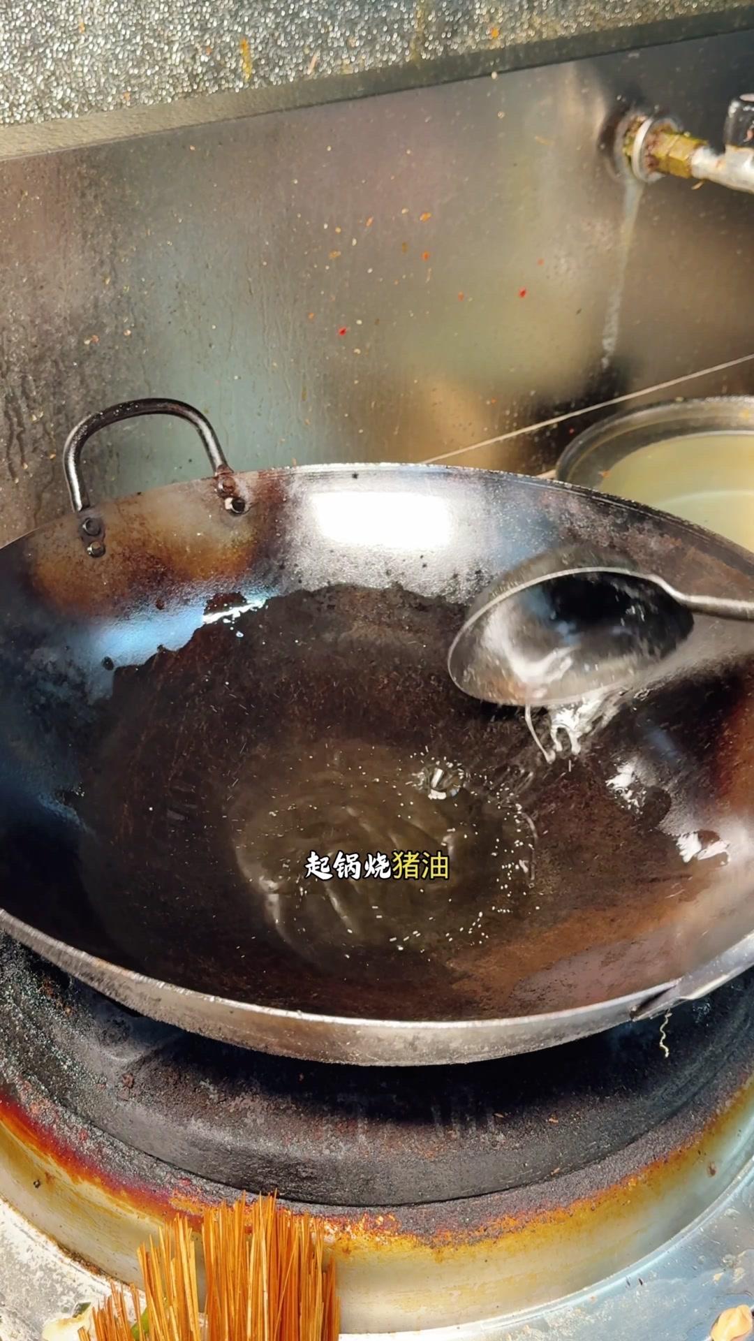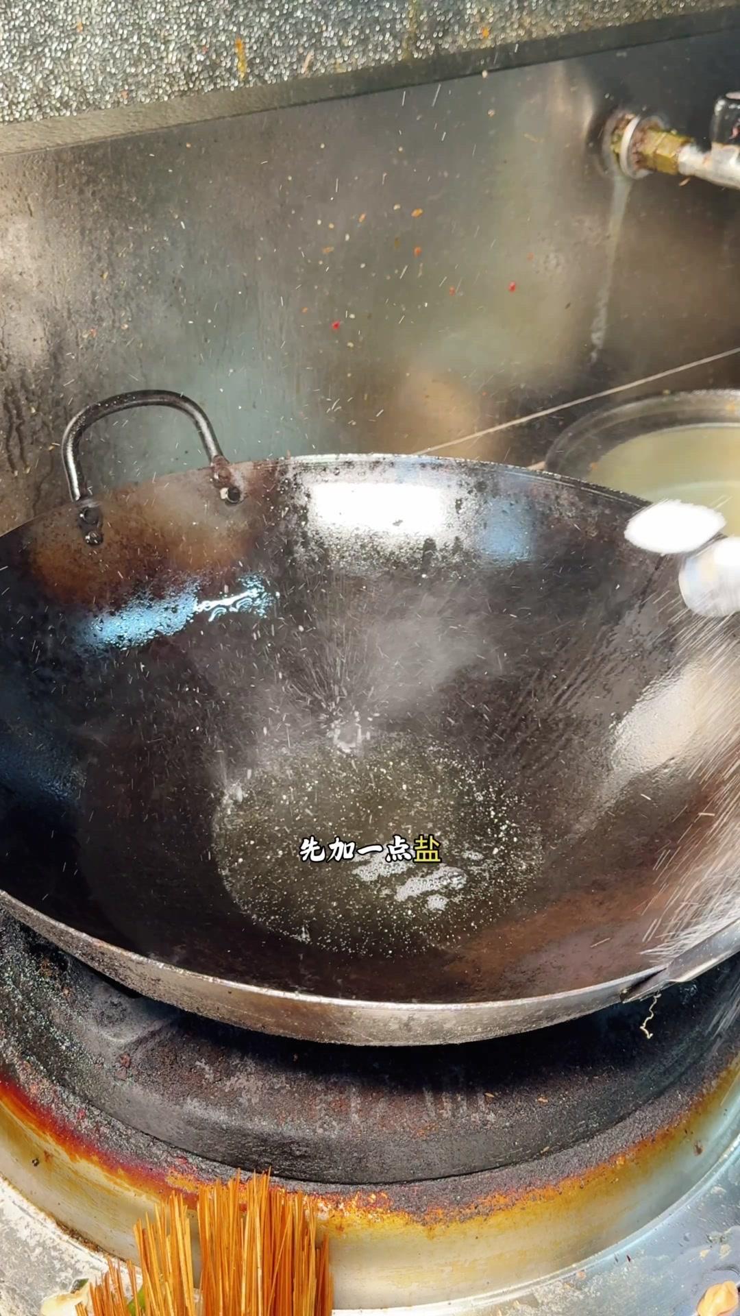 2️⃣起锅烧猪油,先加一点盐,6成油温,从锅边迅速放入雄鱼,转动锅子,先把鱼皮煎黄。