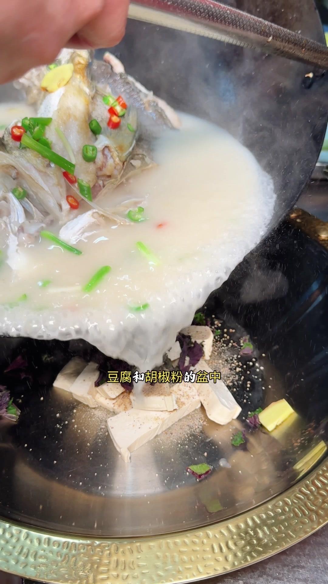 6️⃣倒入盛有鳞粉、紫苏豆腐和胡椒粉的盆中,这么简单,水煮活鱼就煮好了。