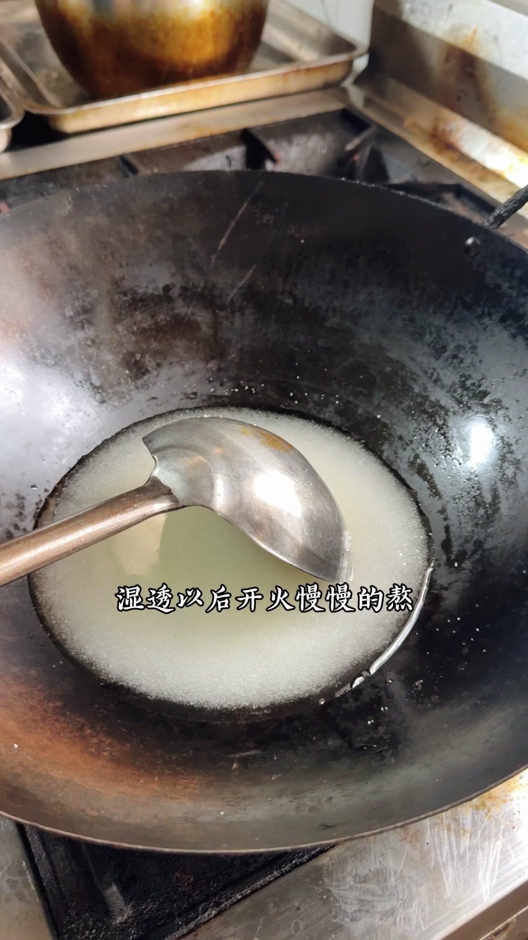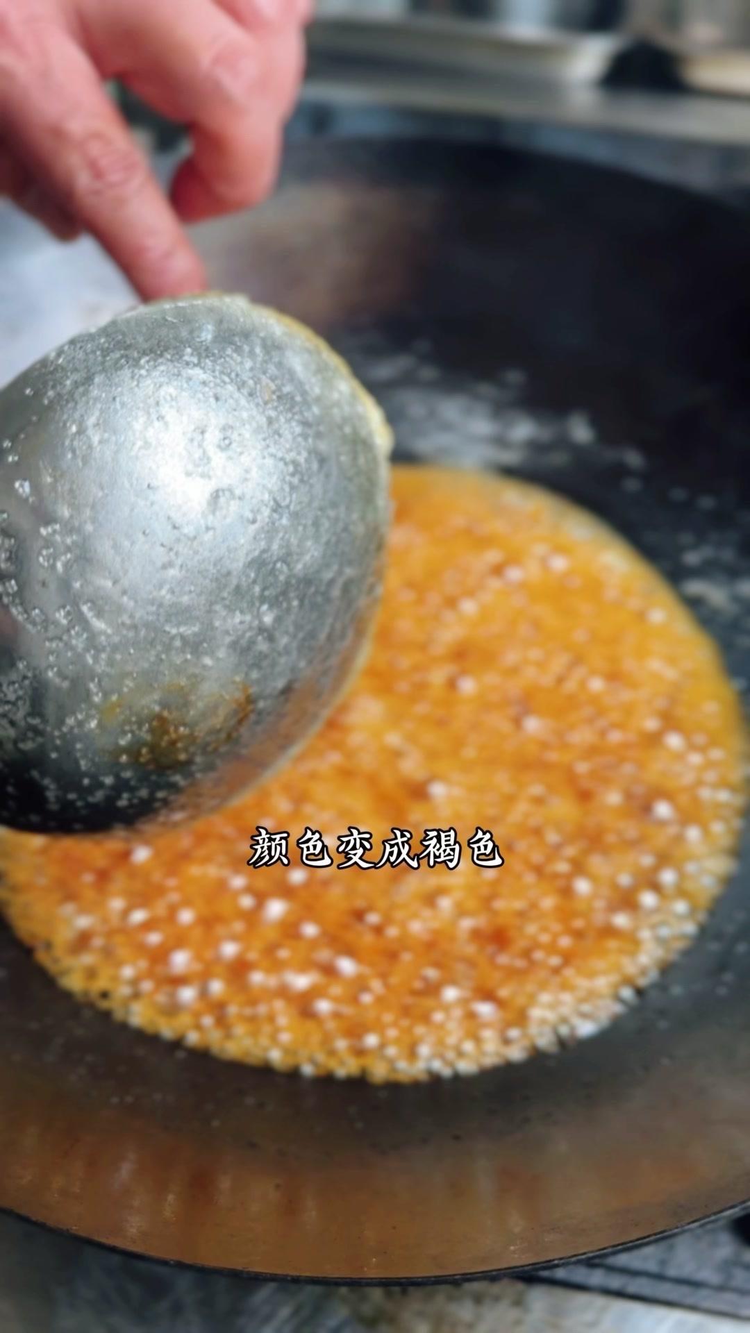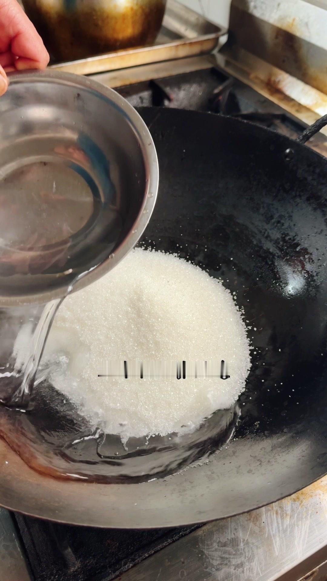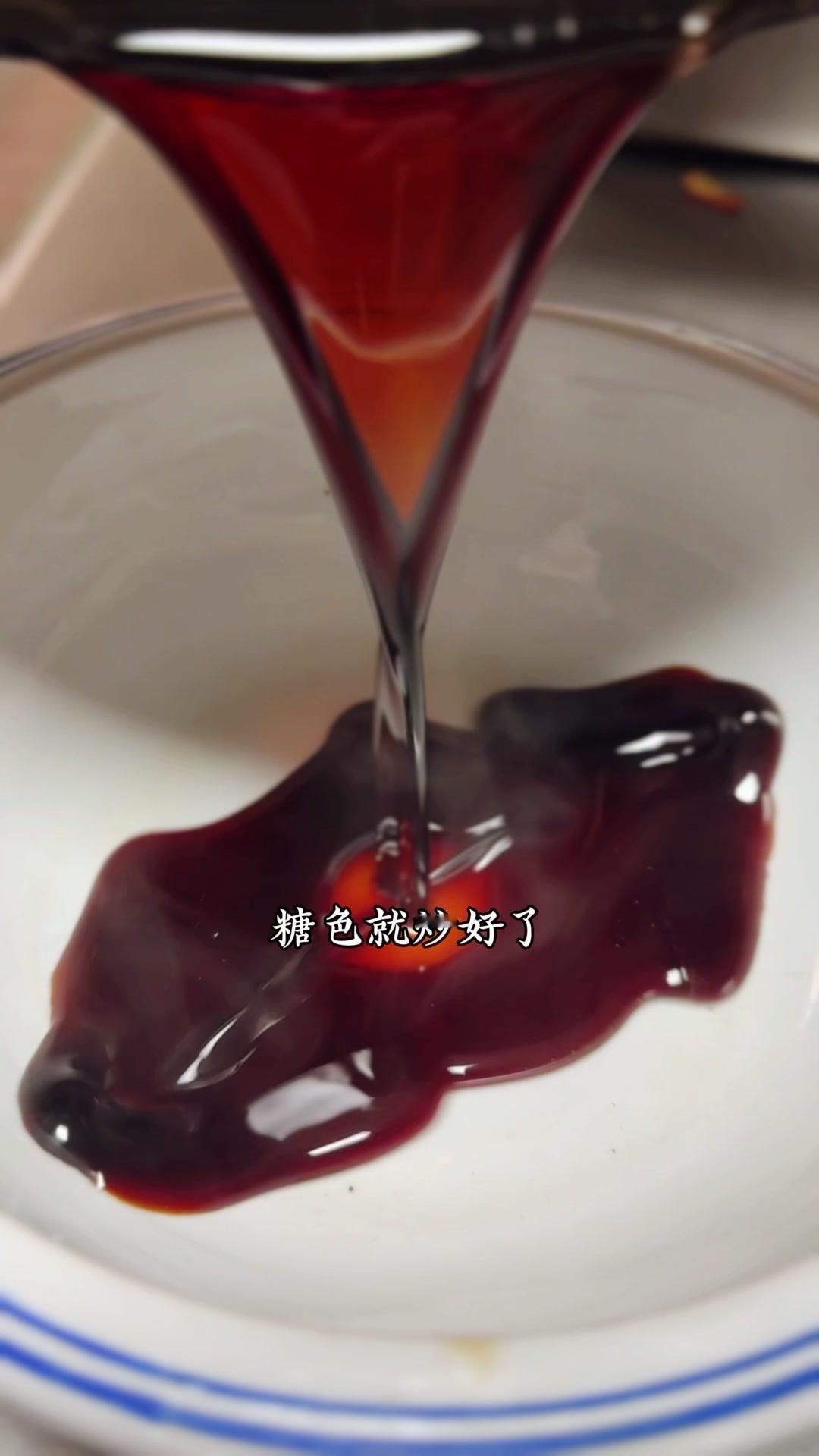 2️⃣炒糖色:干锅放白糖500g,加水湿透后开火慢熬,不用搅拌,颜色变褐色、大泡转小泡时加开水,糖色就炒好了。