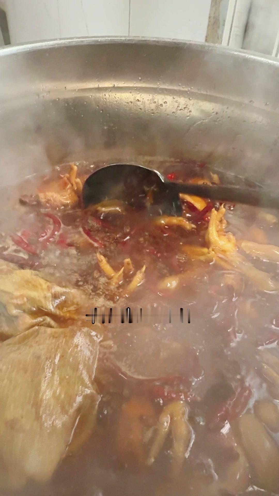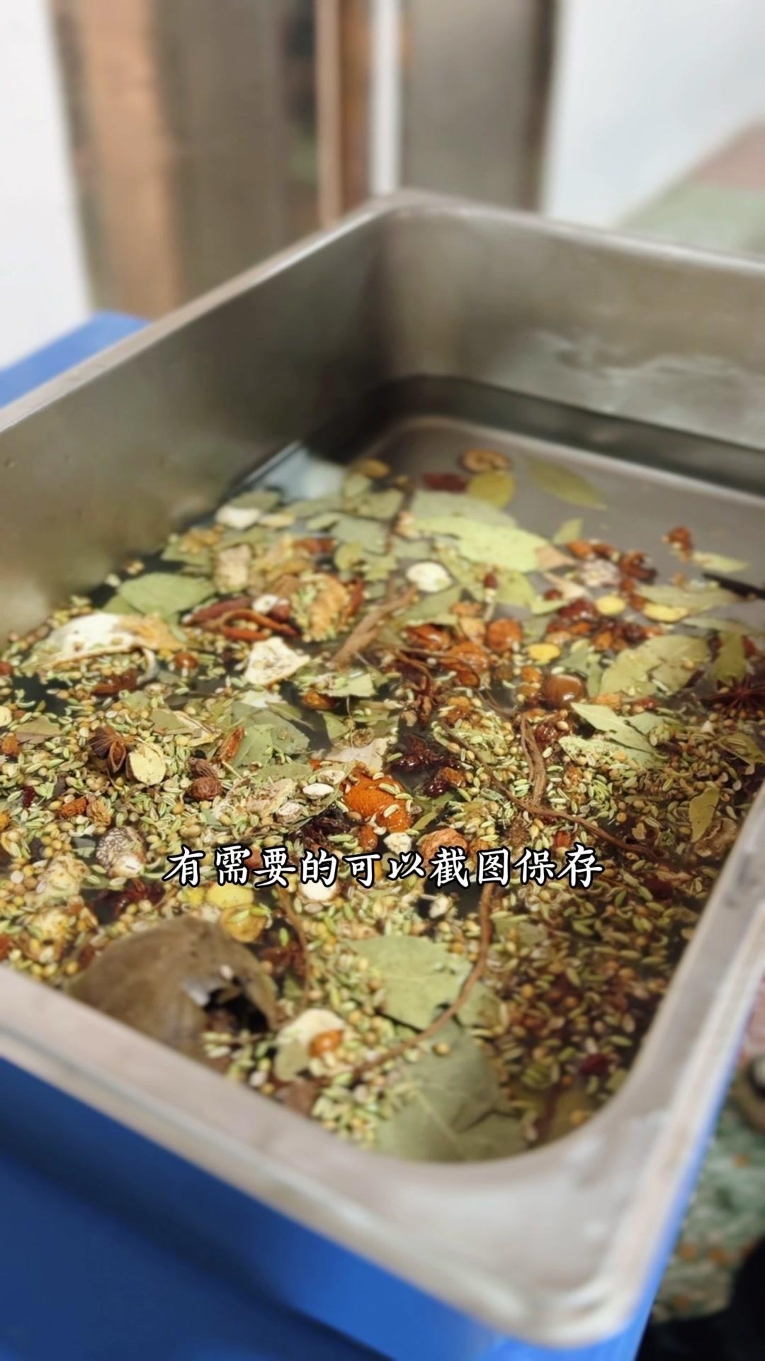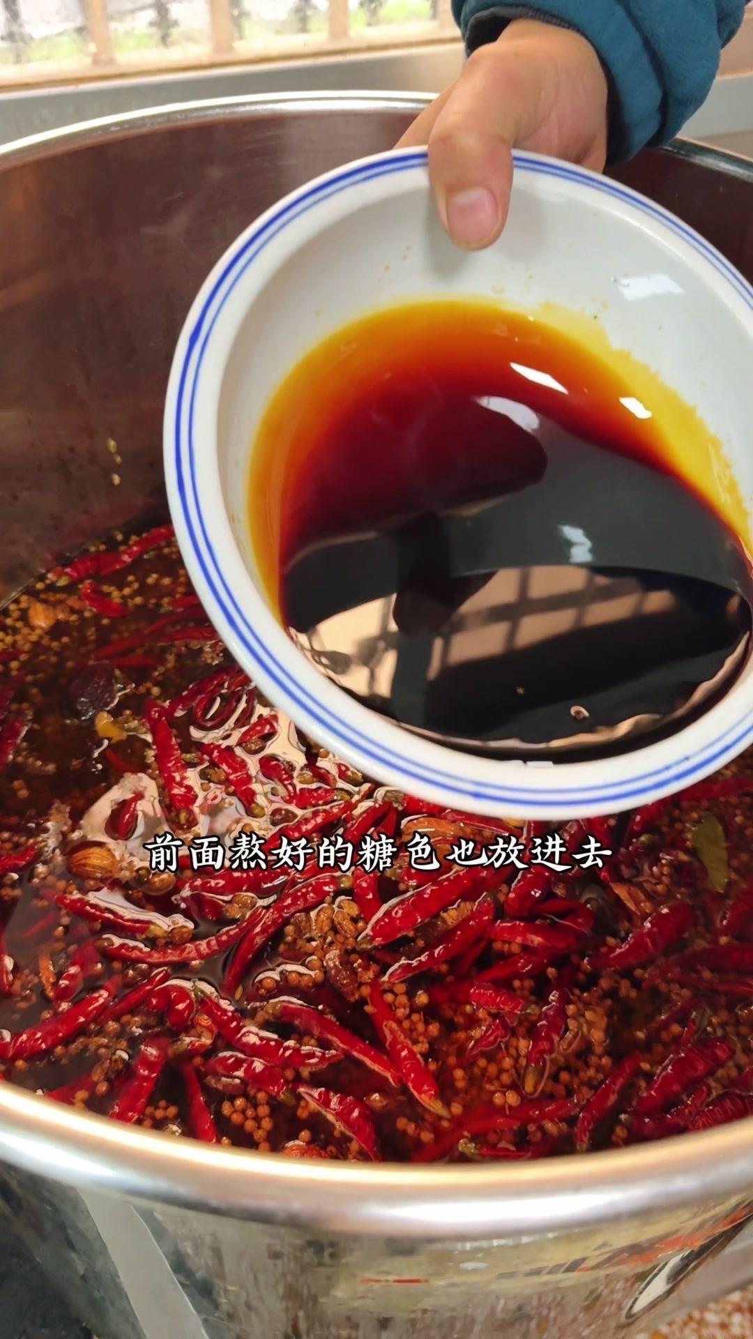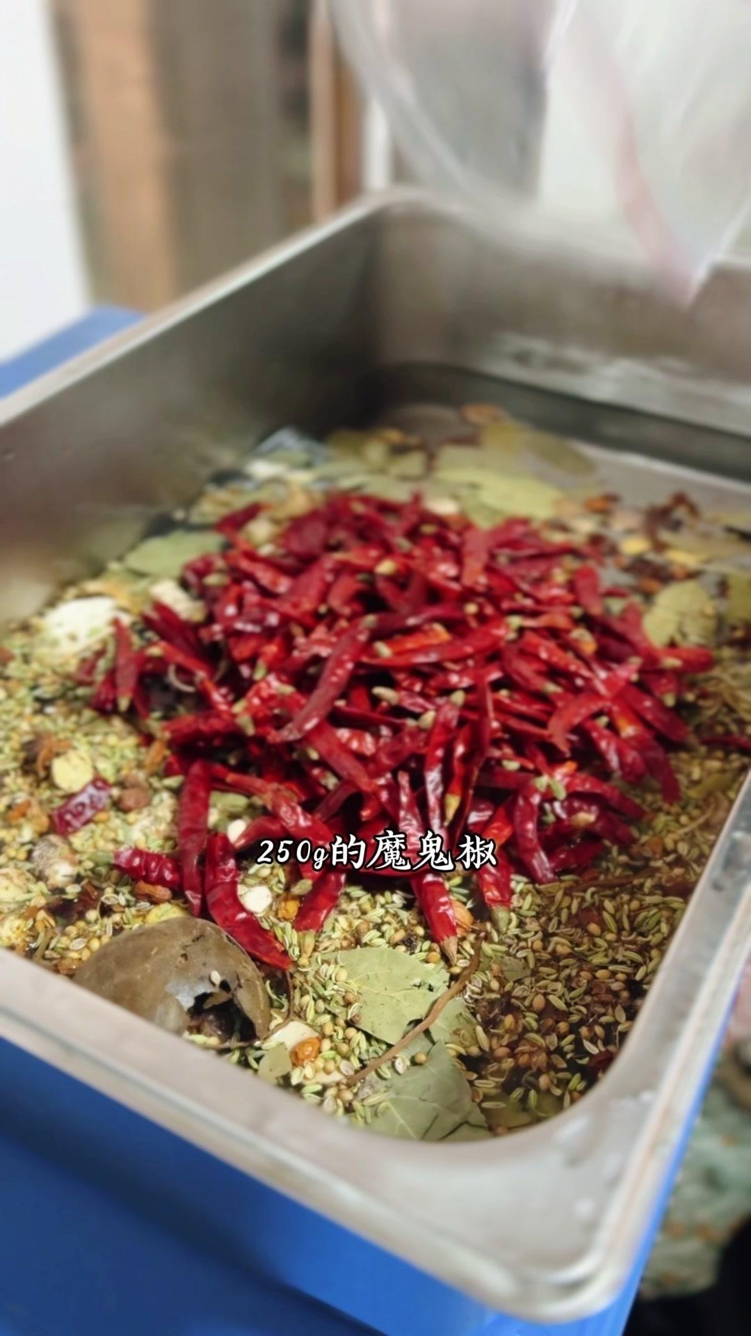 3️⃣调卤料:卤料包温水泡10分钟,魔鬼椒250g、红花椒150g也泡10分钟;高汤去渣,放入香料、盐400g、老抽400g、蚝油200g,加大豆油6斤和炒好的糖色搅匀,大火烧开转小火熬45分钟,关火前5分钟加鸡精100g、味精200g,静置一晚。