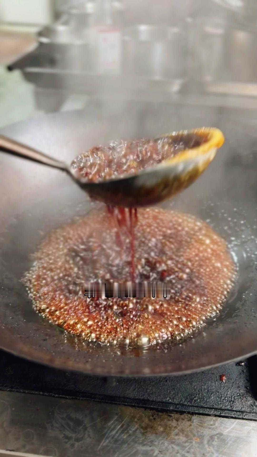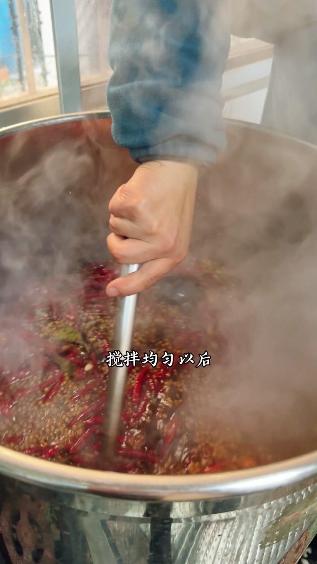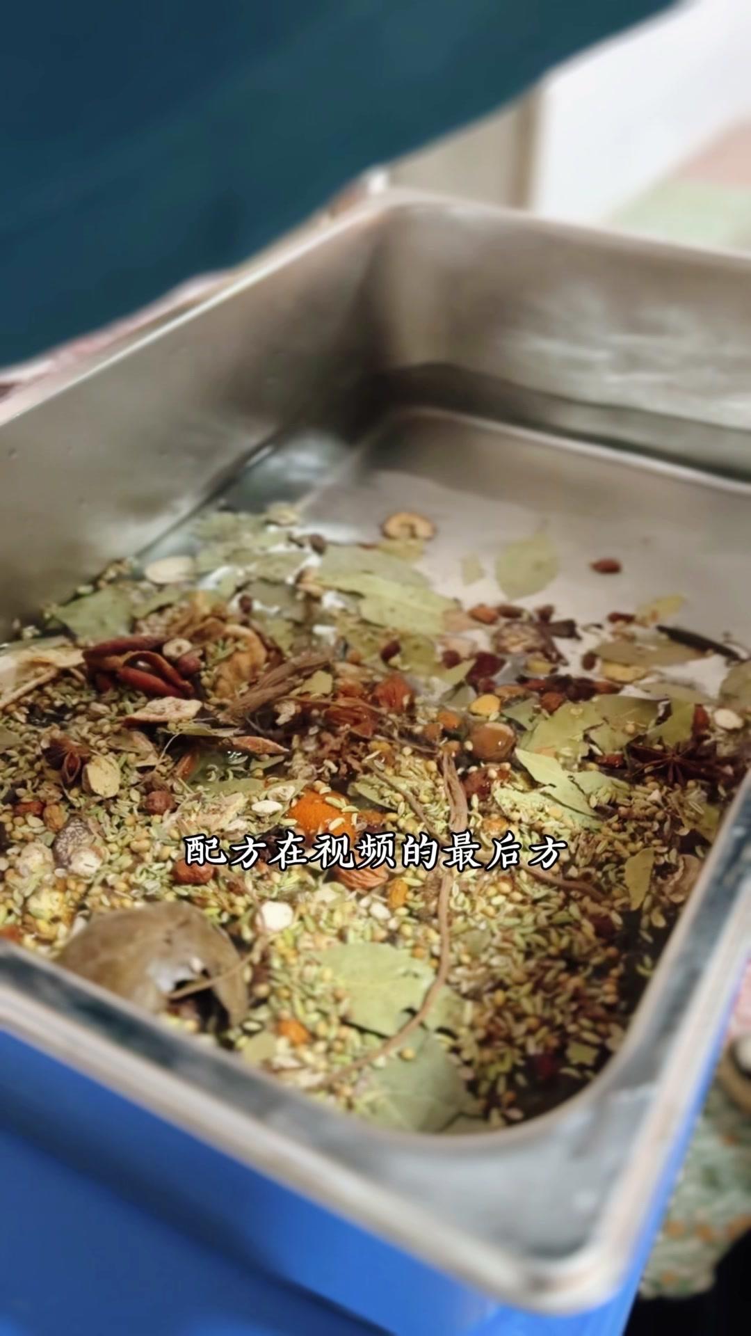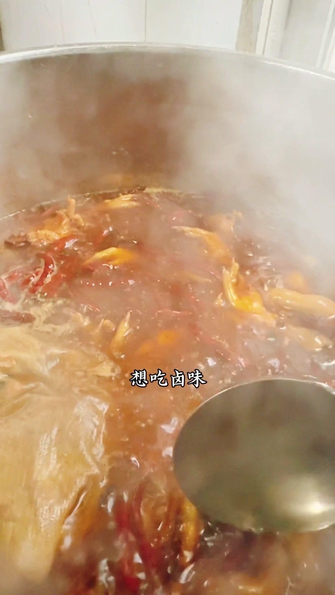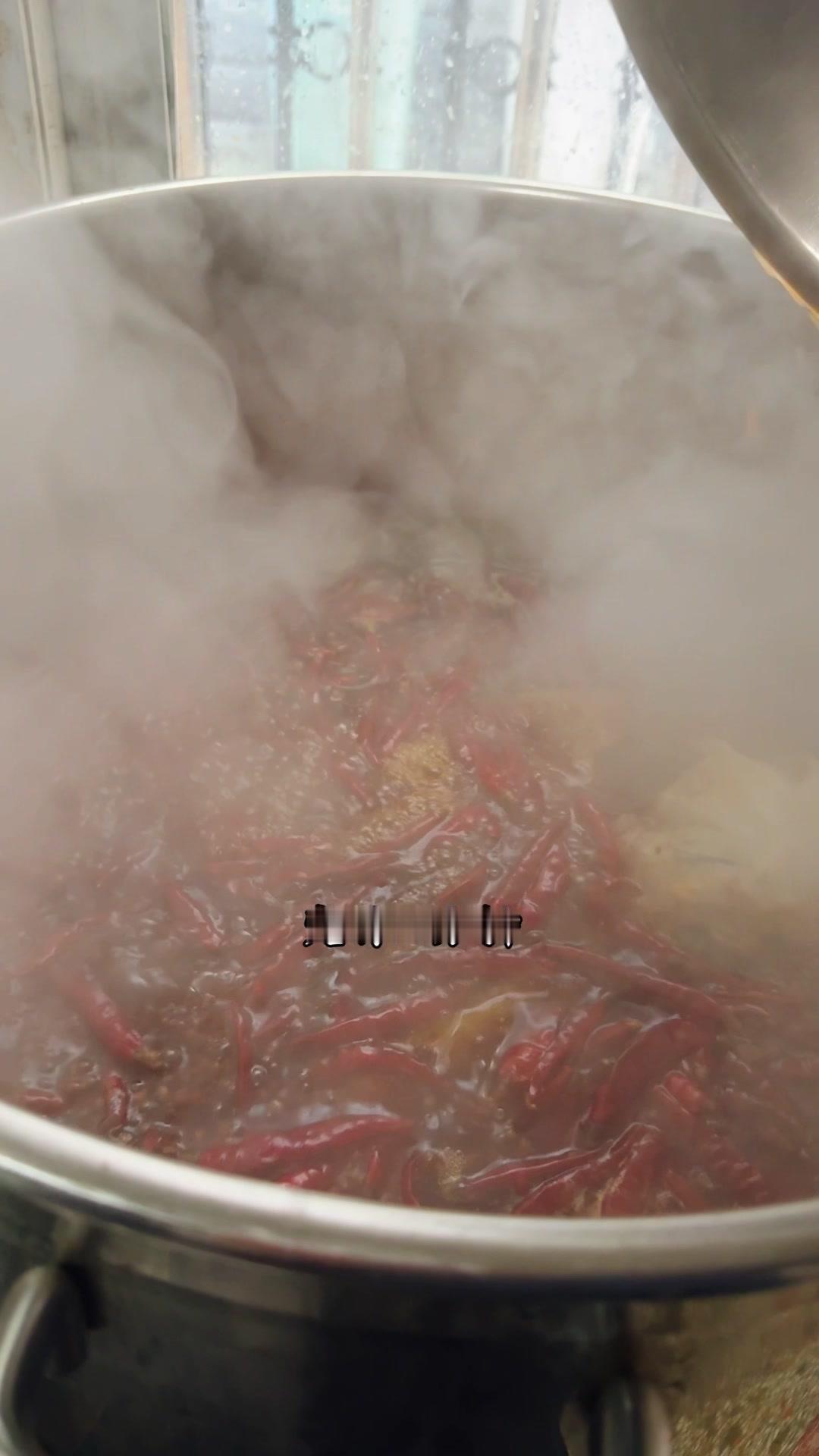 3️⃣调卤料:卤料包温水泡10分钟,魔鬼椒250g、红花椒150g也泡10分钟;高汤去渣,放入香料、盐400g、老抽400g、蚝油200g,加大豆油6斤和炒好的糖色搅匀,大火烧开转小火熬45分钟,关火前5分钟加鸡精100g、味精200g,静置一晚。