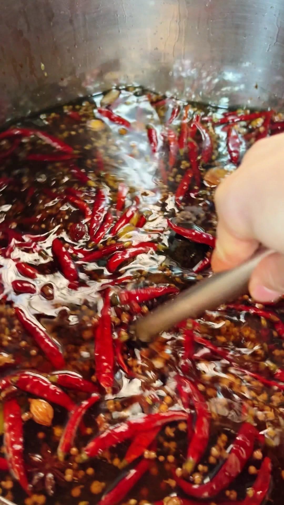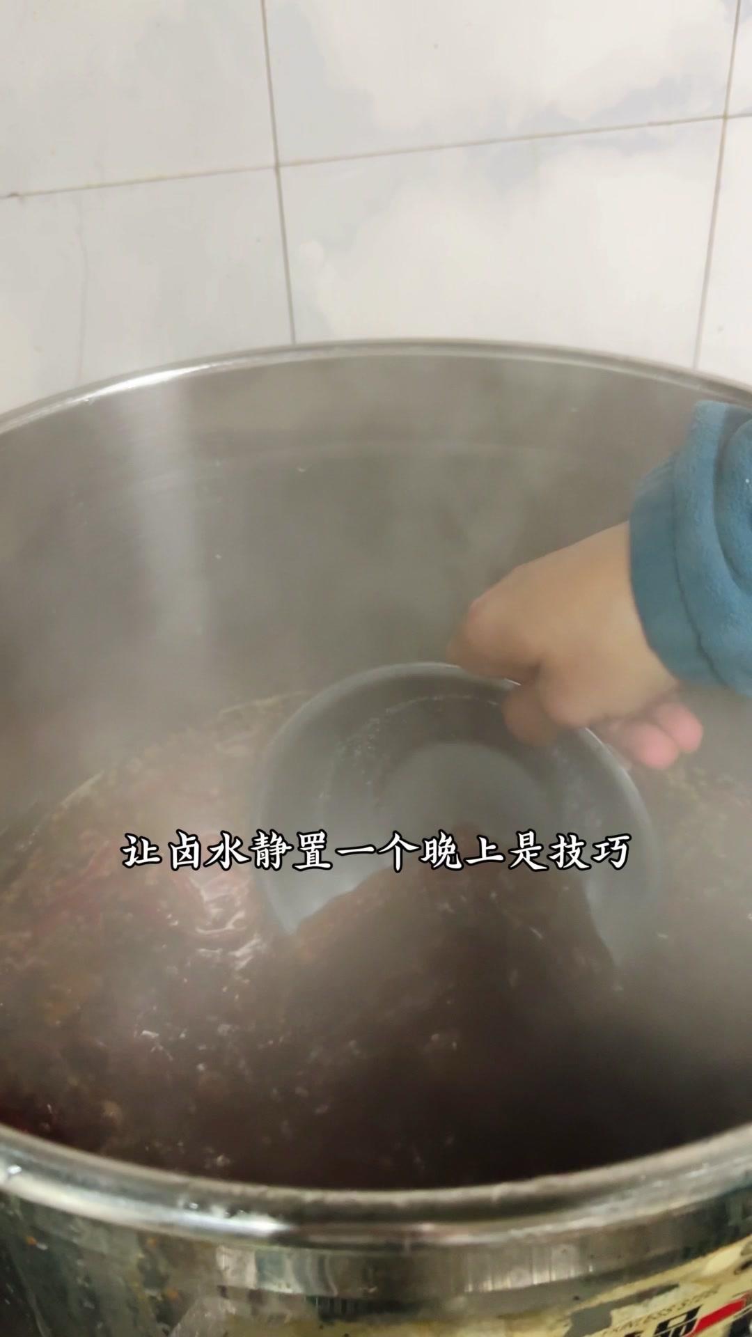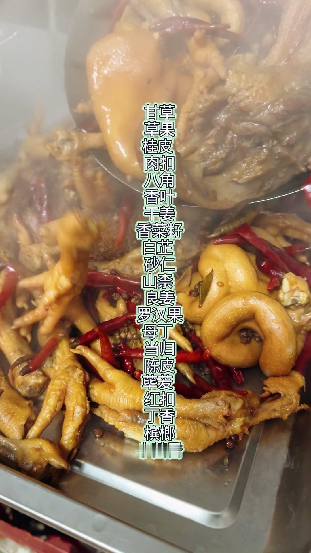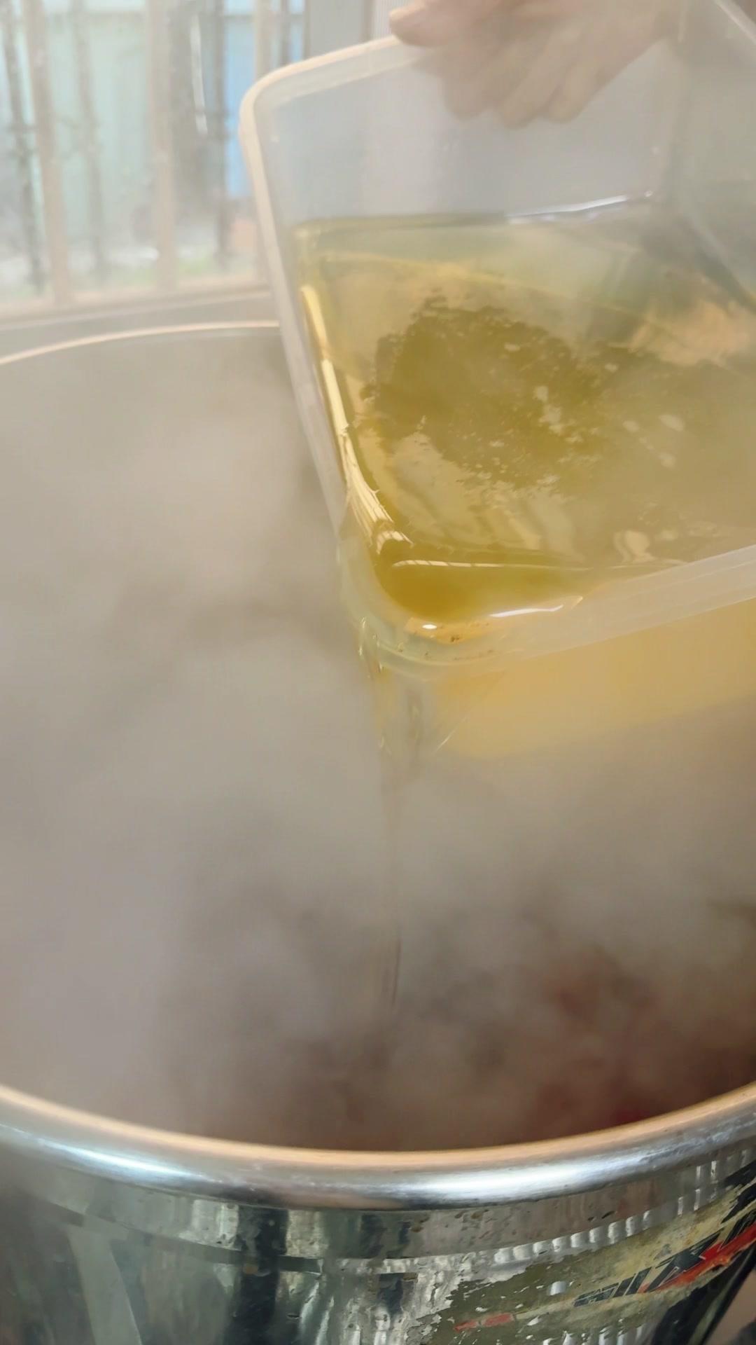 3️⃣调卤料:卤料包温水泡10分钟,魔鬼椒250g、红花椒150g也泡10分钟;高汤去渣,放入香料、盐400g、老抽400g、蚝油200g,加大豆油6斤和炒好的糖色搅匀,大火烧开转小火熬45分钟,关火前5分钟加鸡精100g、味精200g,静置一晚。