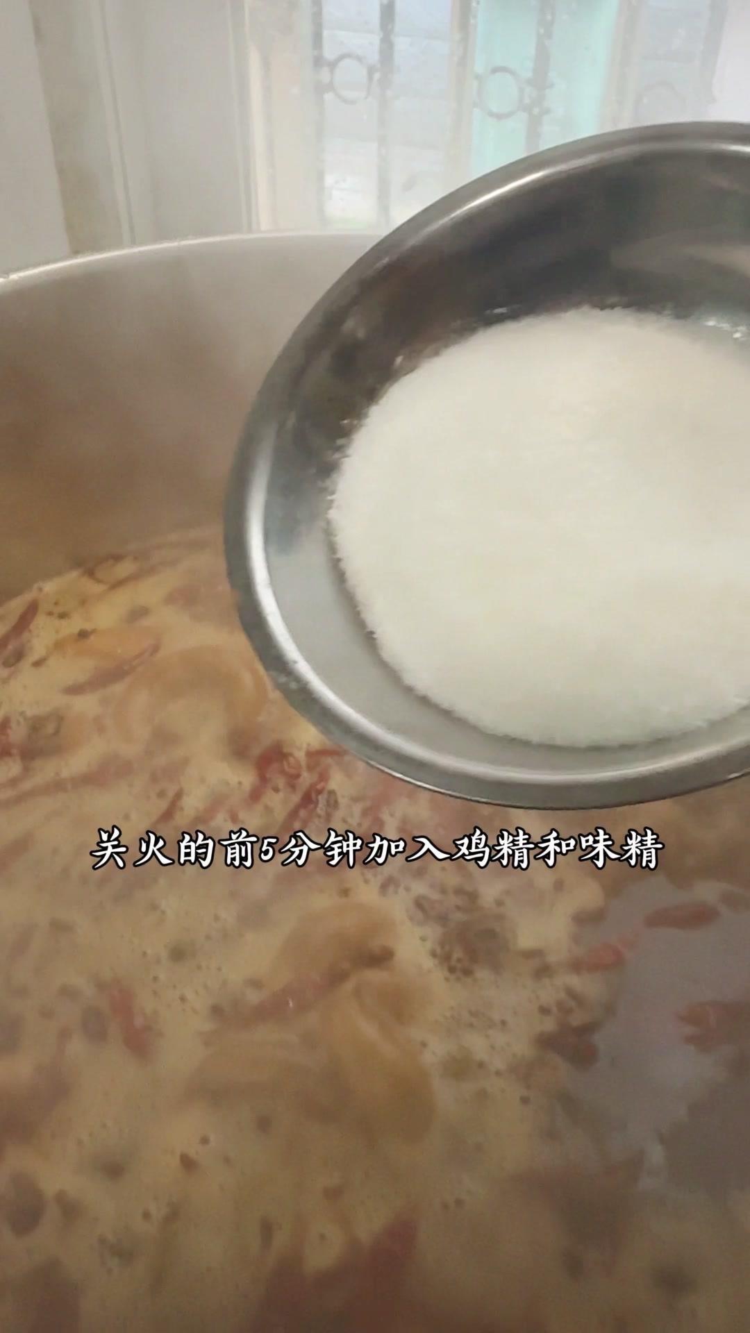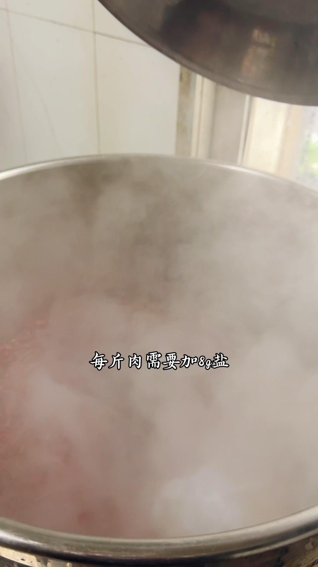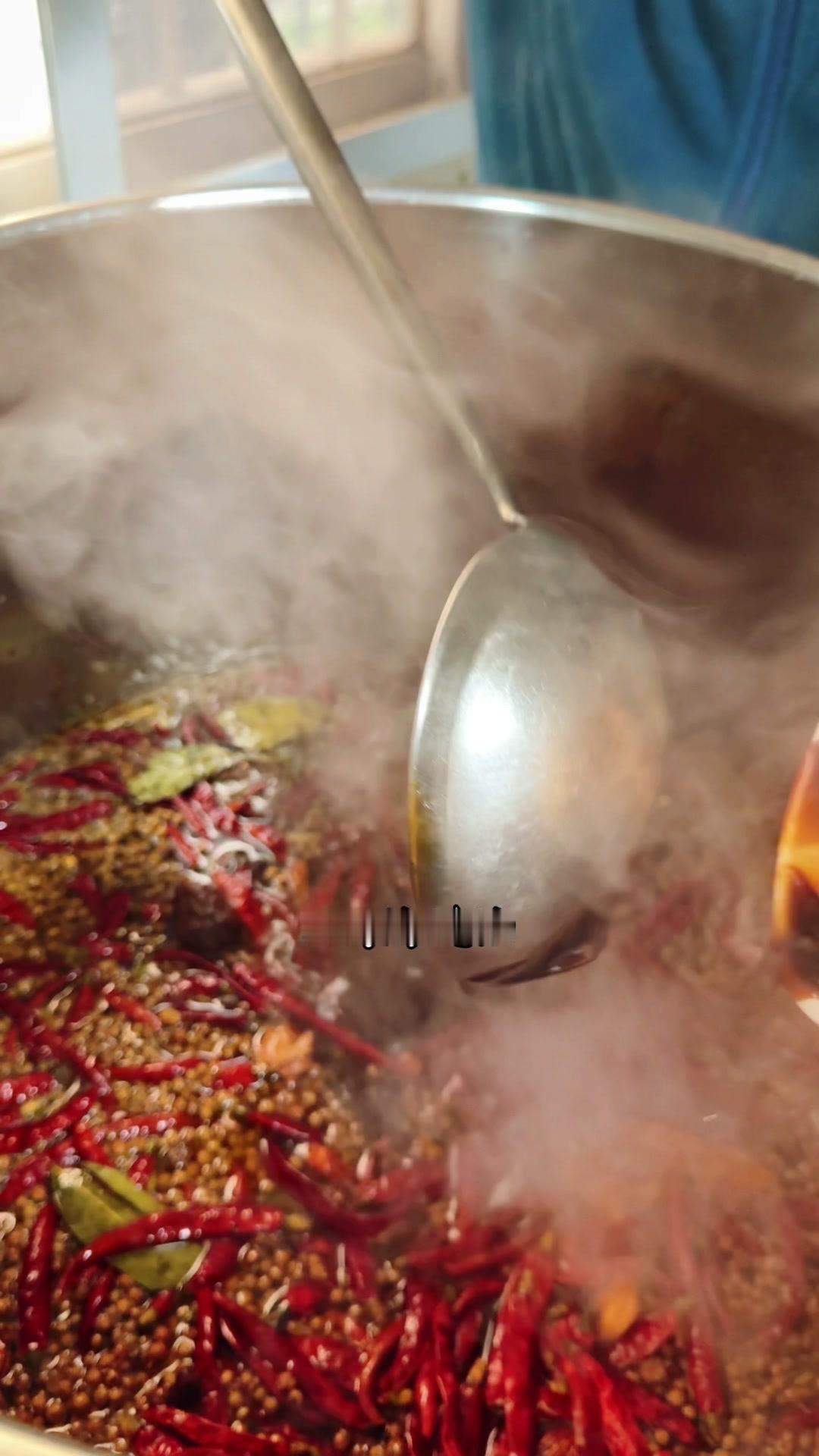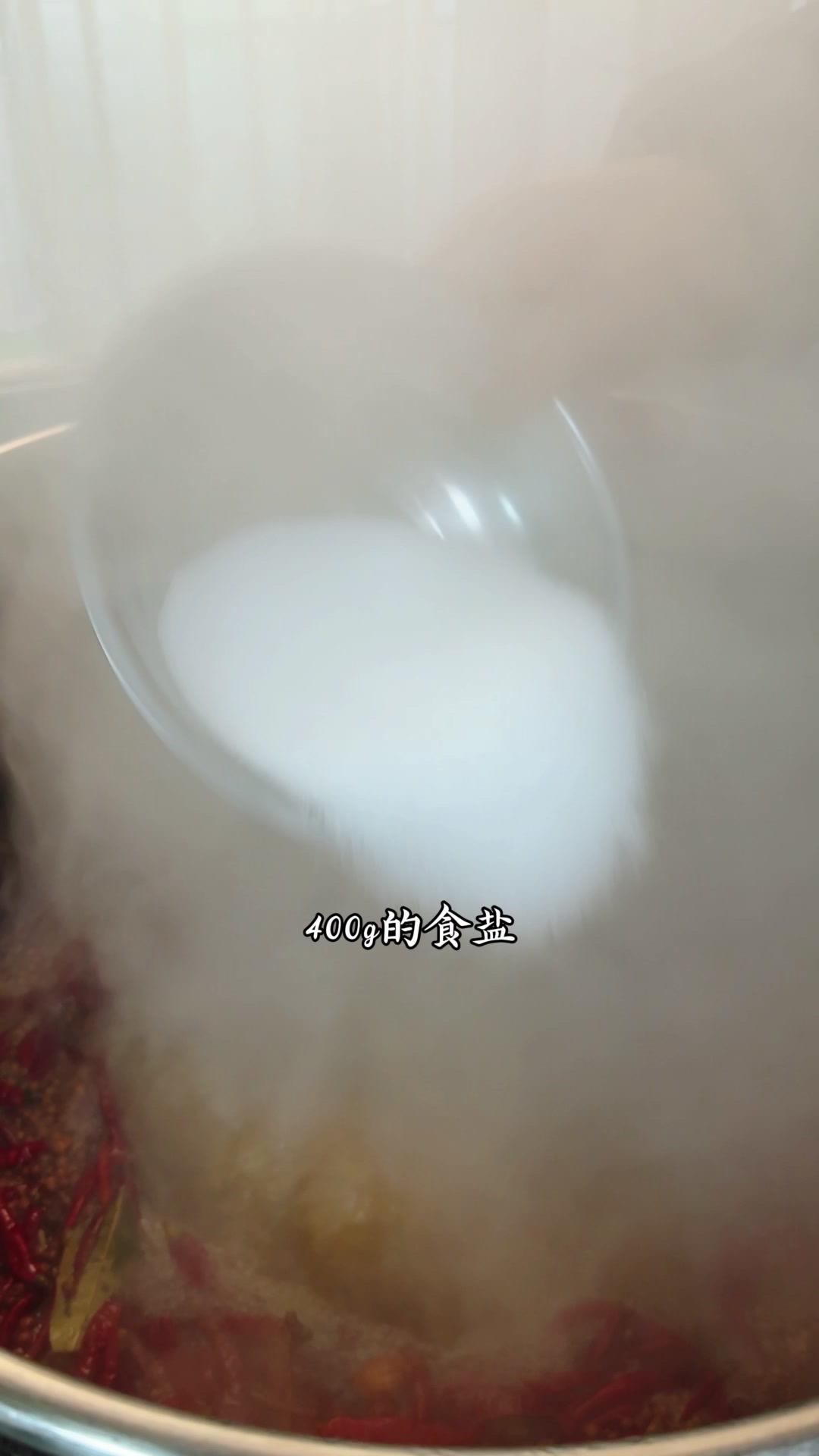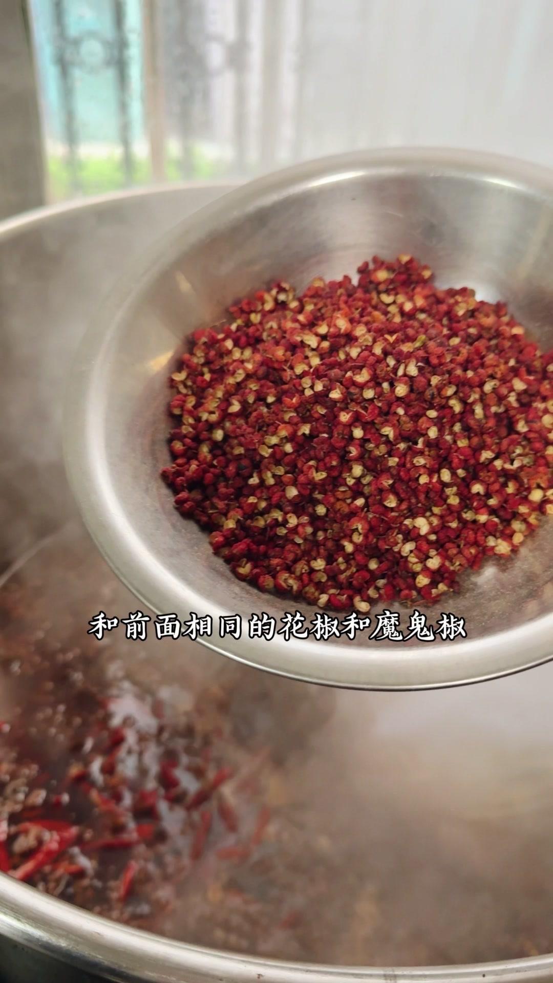 3️⃣调卤料:卤料包温水泡10分钟,魔鬼椒250g、红花椒150g也泡10分钟;高汤去渣,放入香料、盐400g、老抽400g、蚝油200g,加大豆油6斤和炒好的糖色搅匀,大火烧开转小火熬45分钟,关火前5分钟加鸡精100g、味精200g,静置一晚。