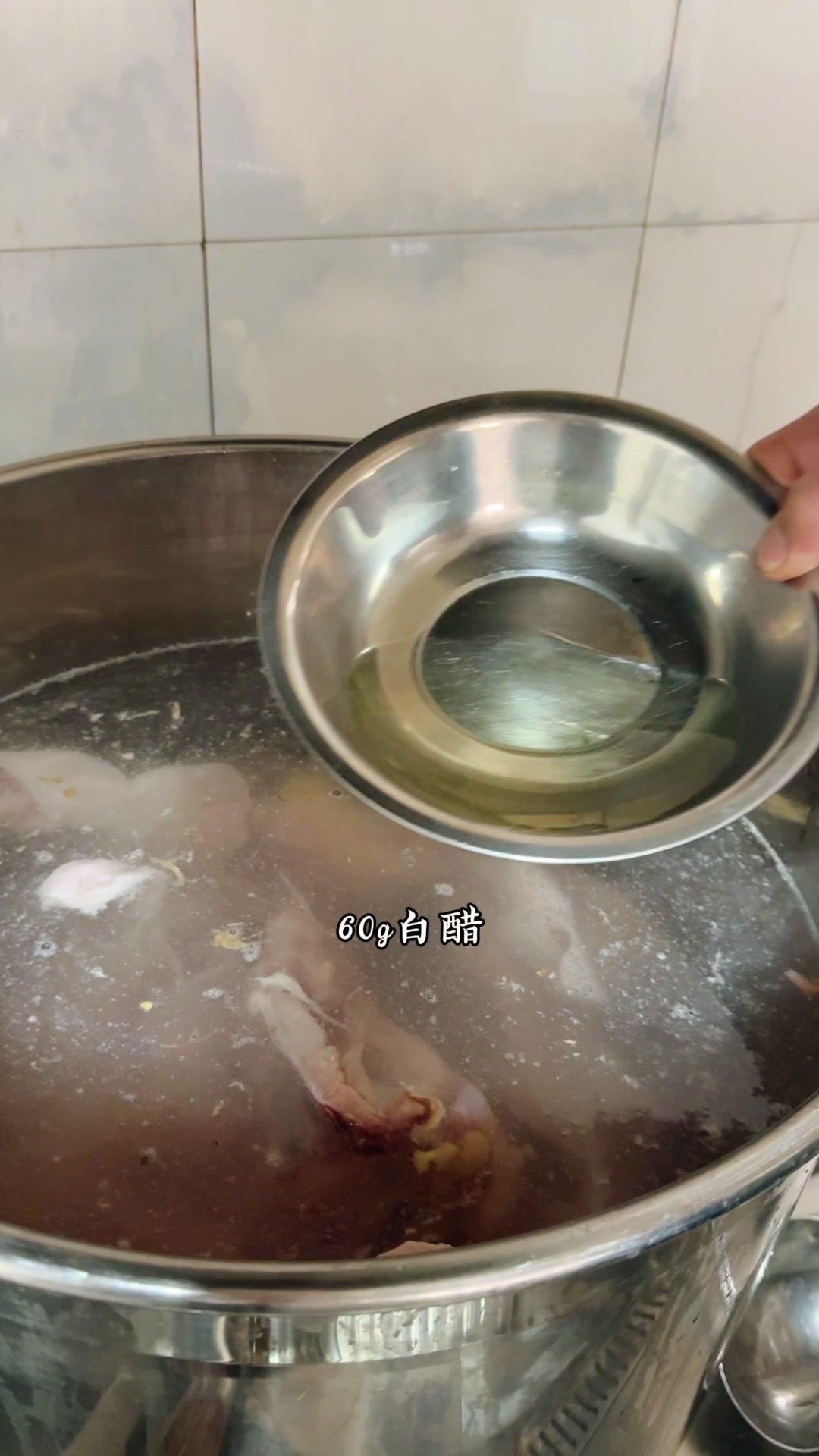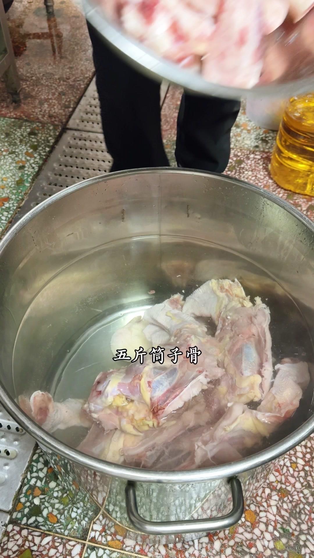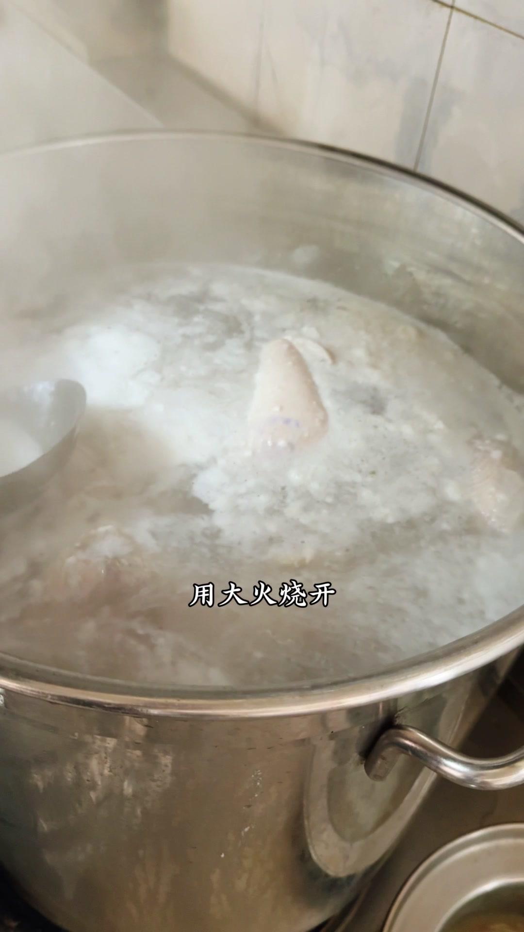 1️⃣熬制高汤:鸡骨架1件、筒子骨5斤、猪皮3斤洗净,加姜片1斤、白醋60g、料酒200g,大火烧开撇浮沫,转小火熬4-5小时。