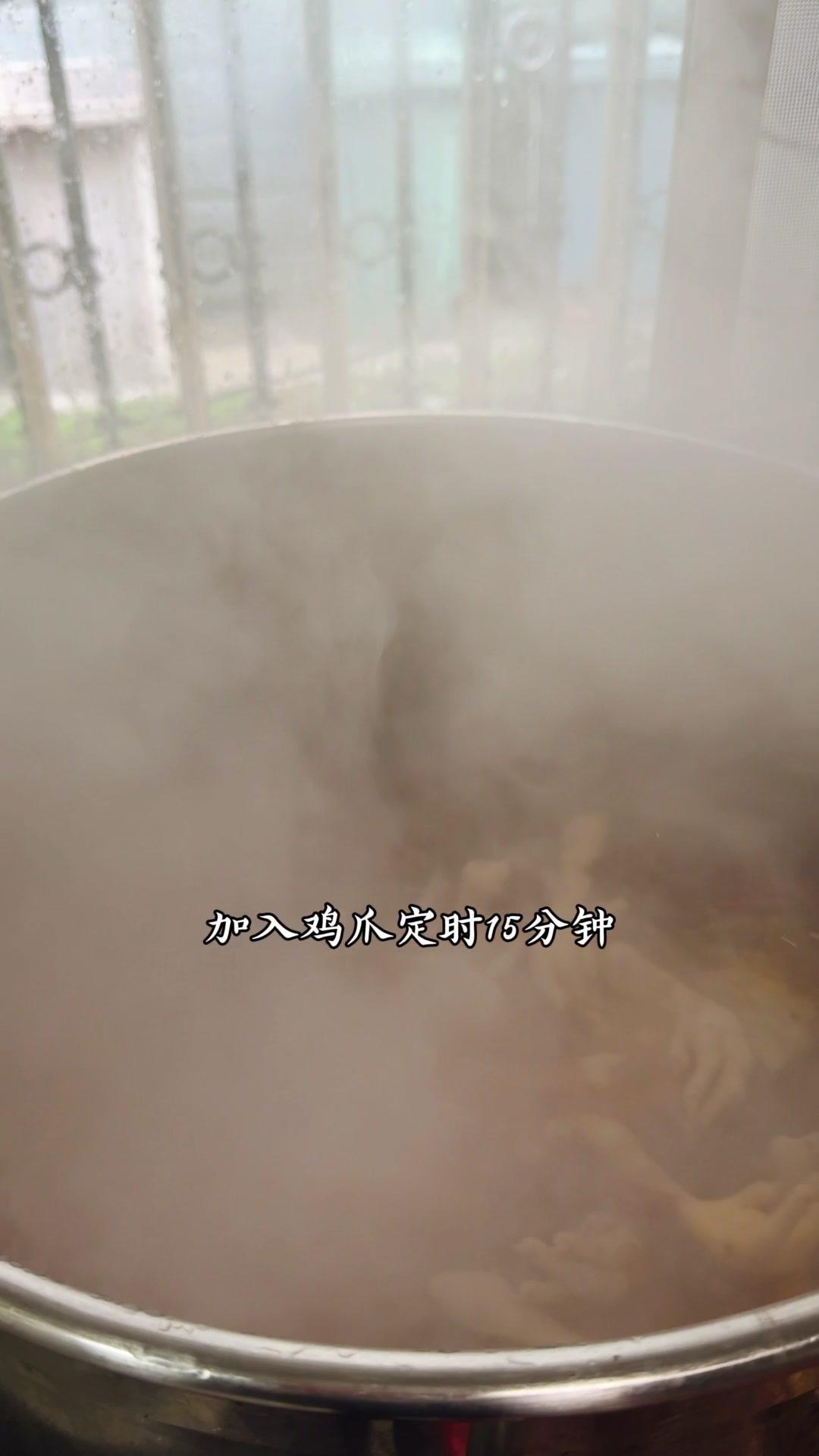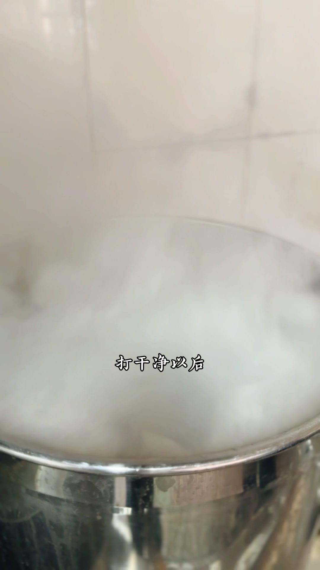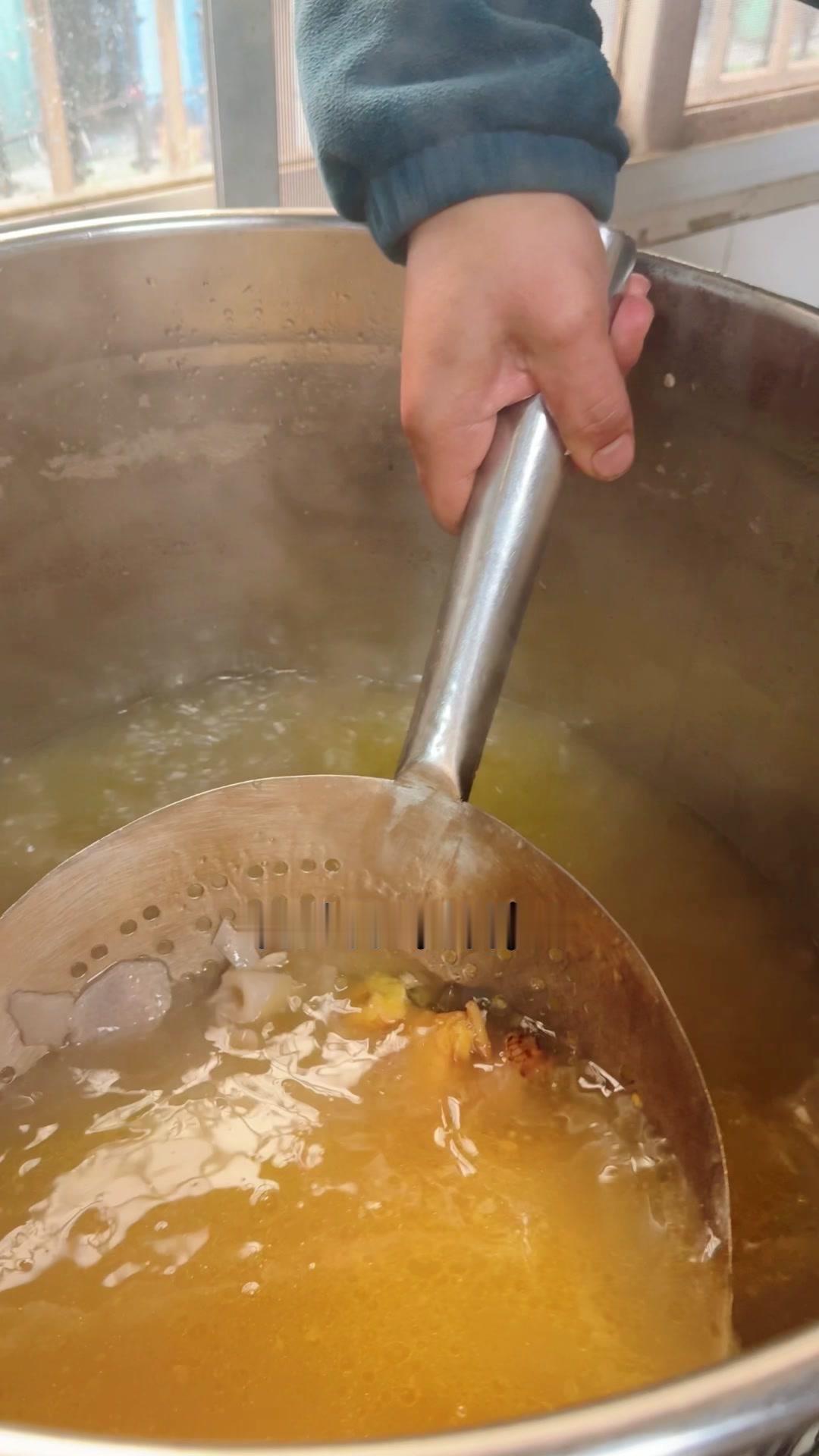 1️⃣熬制高汤:鸡骨架1件、筒子骨5斤、猪皮3斤洗净,加姜片1斤、白醋60g、料酒200g,大火烧开撇浮沫,转小火熬4-5小时。
