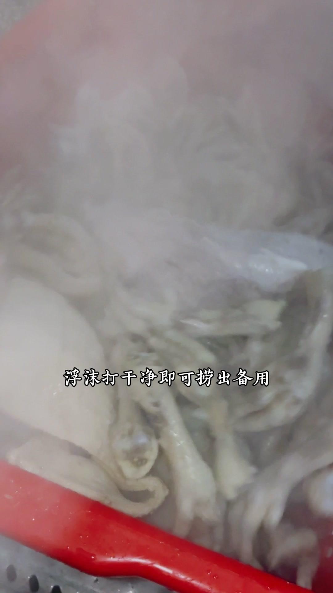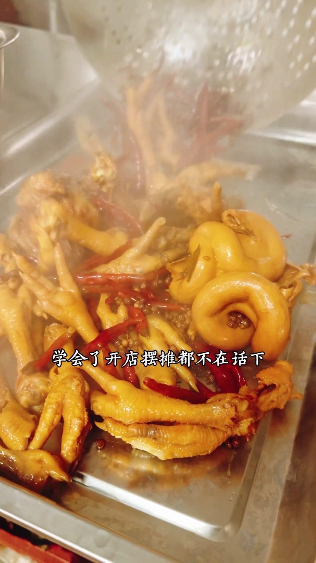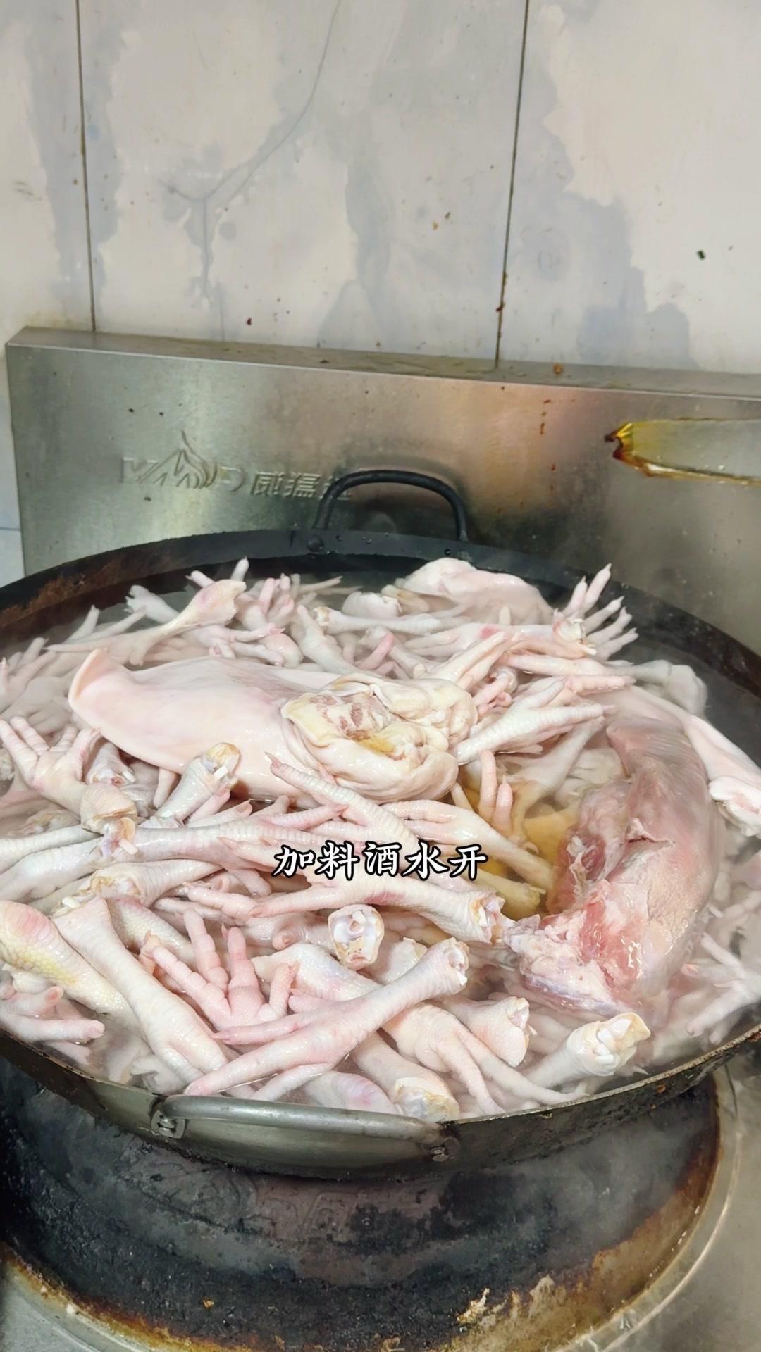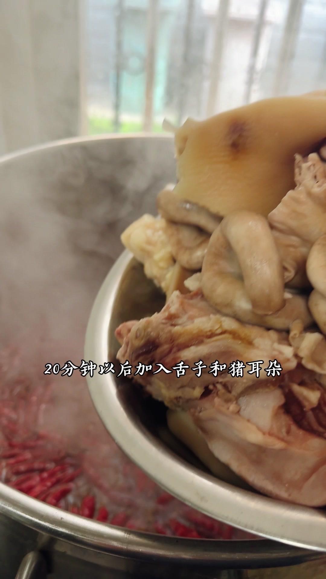 4️⃣卤制食材:食材冷水下锅焯水,加料酒去浮沫后捞出;卤水烧开,放卤料包、花椒和魔鬼椒,牛肚卤20分钟,舌子和猪耳朵卤15分钟,鸡爪卤15分钟,关火前5分钟加鸡精、味精,再浸泡15分钟即可。