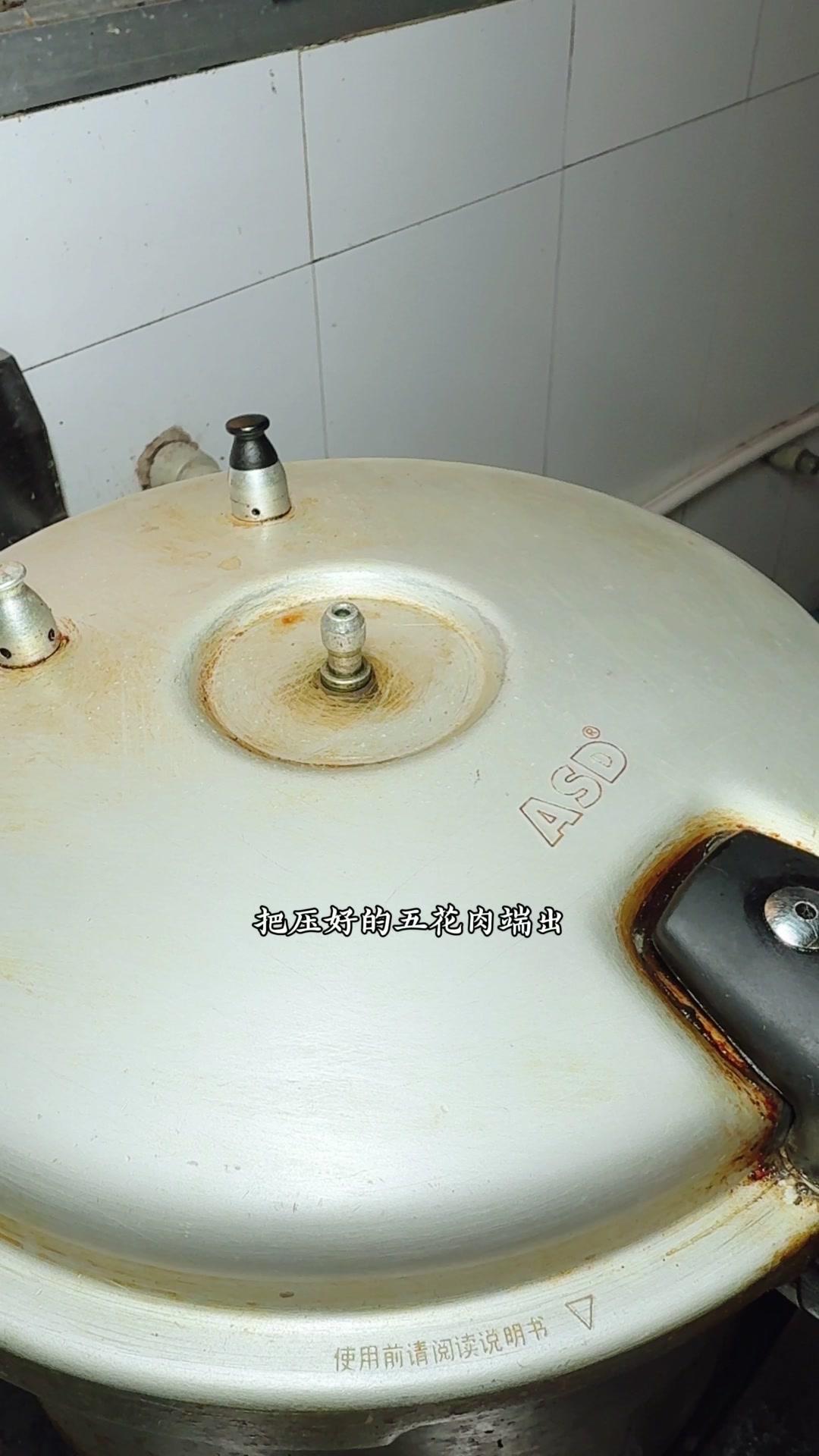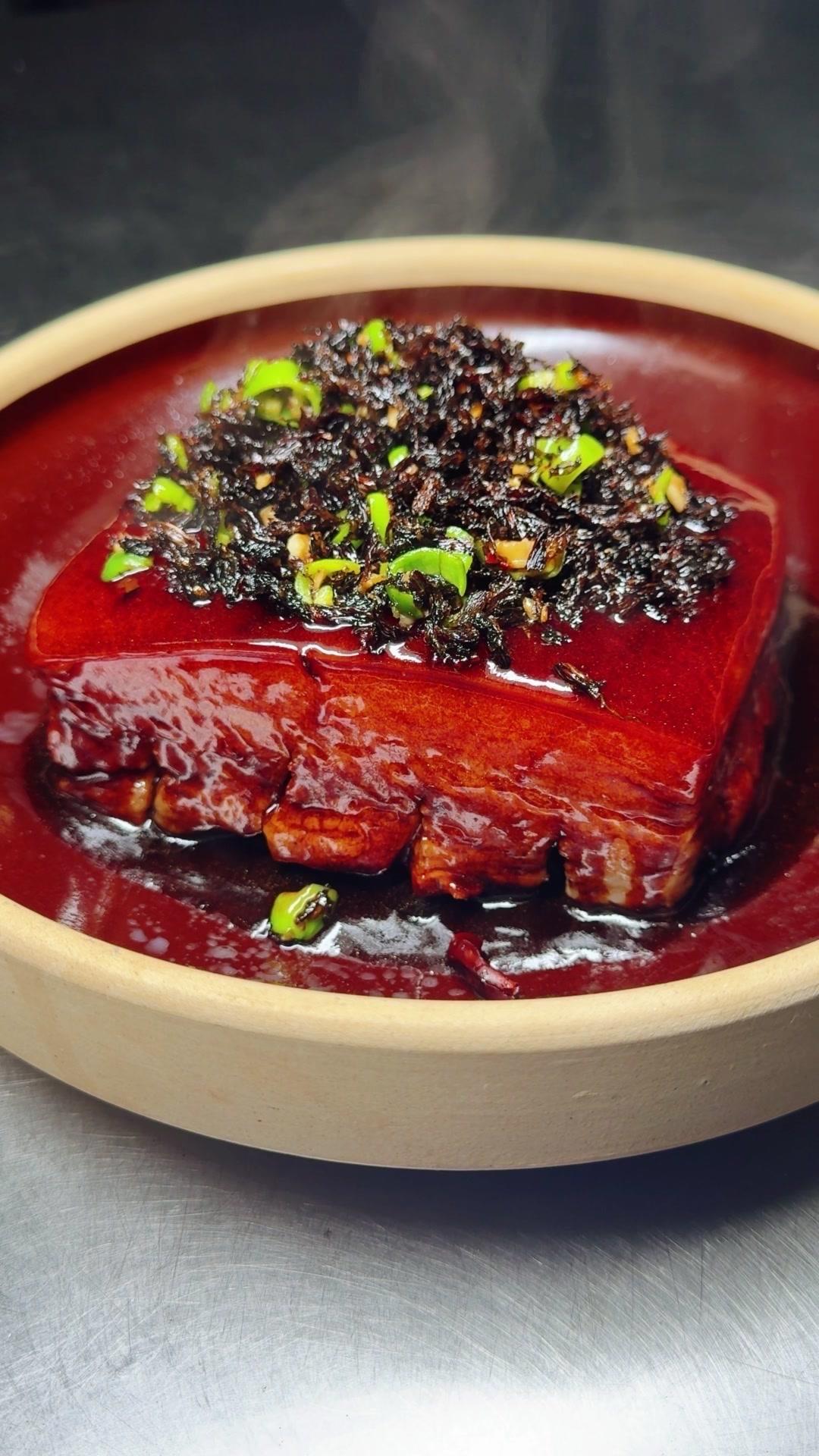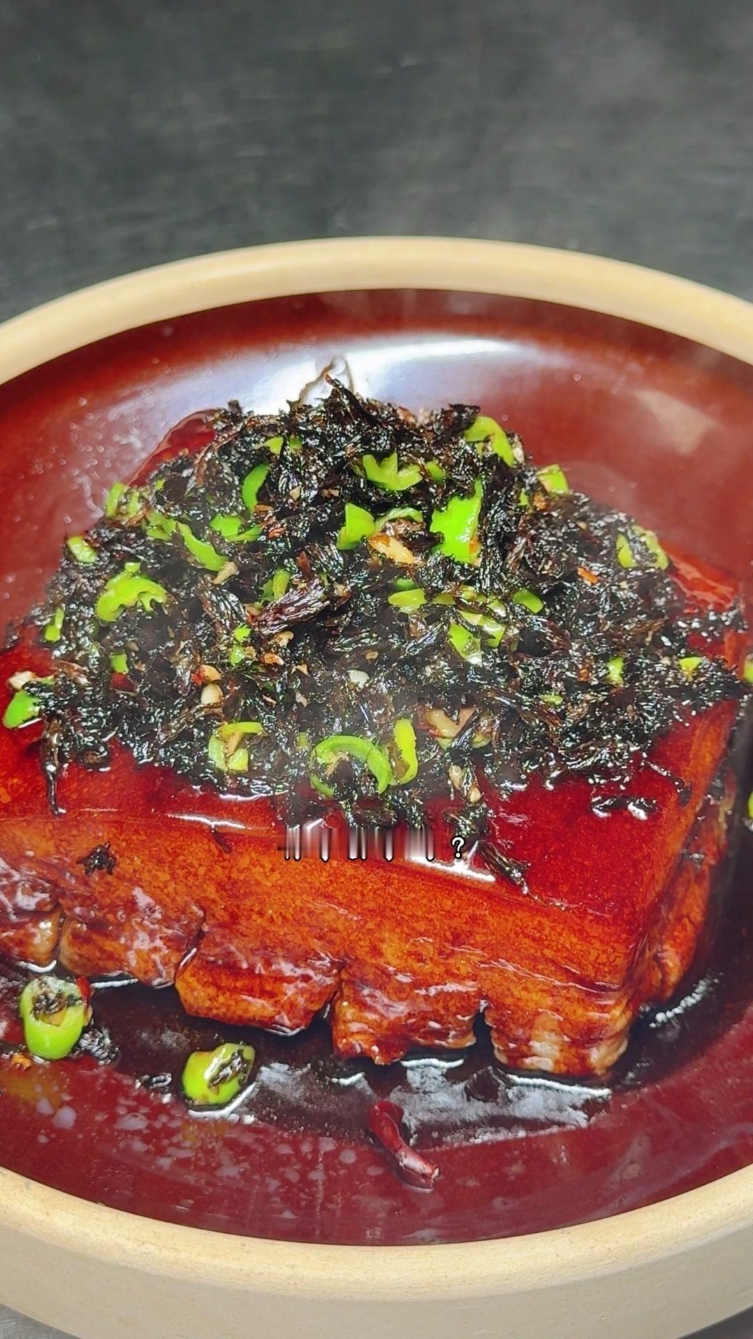 3️⃣高压锅压制:腌好的五花肉皮朝下放进高压锅,加八角、桂皮、干辣椒、豆豉,盖盖大火上汽压一个小时。压好后把汤汁倒出来烧浓稠,把肉翻扣到盘子里,淋上汤汁,最后盖上炒好的梅干菜就完成了。