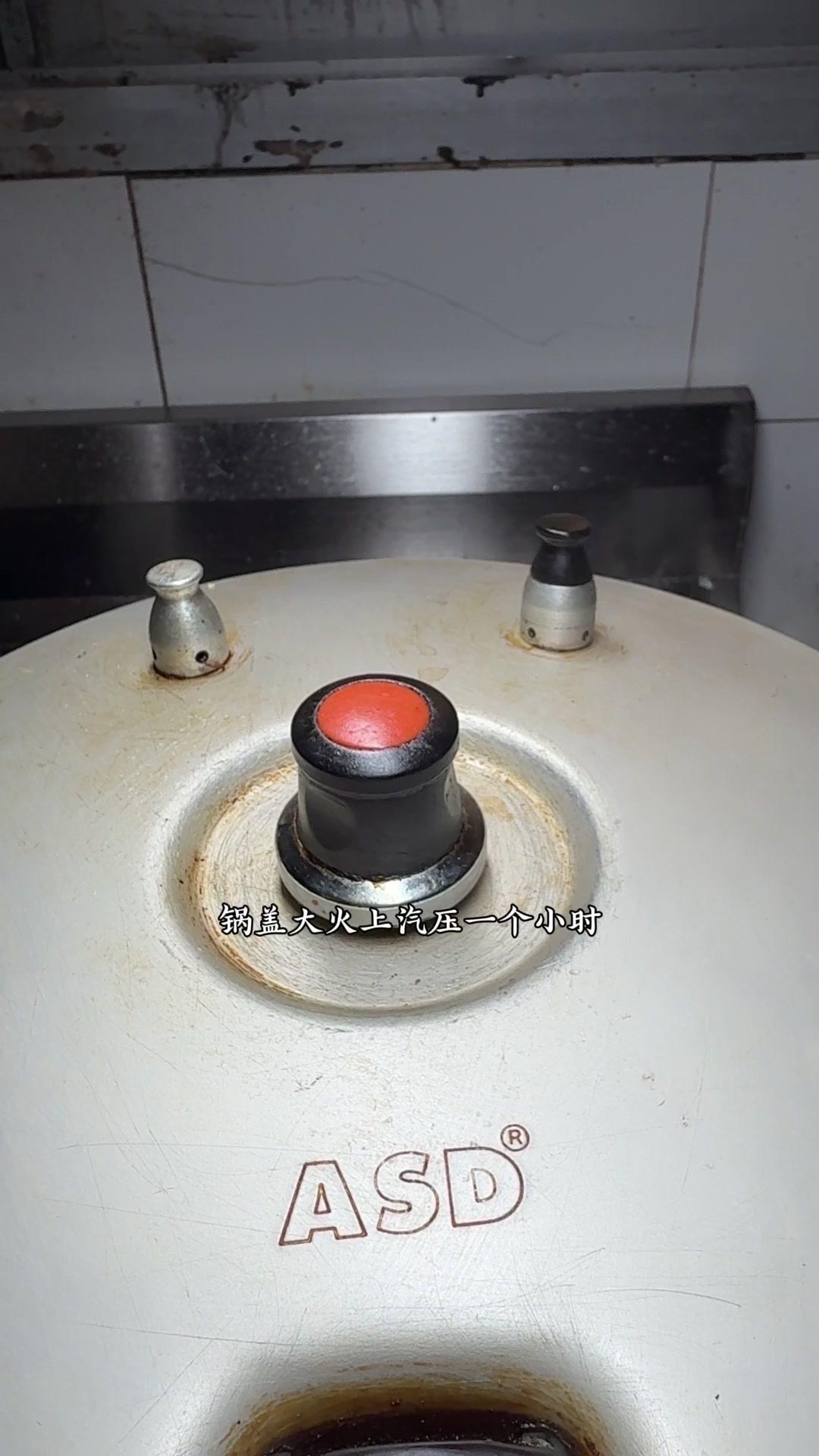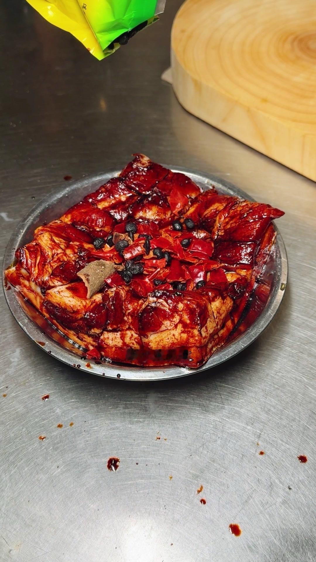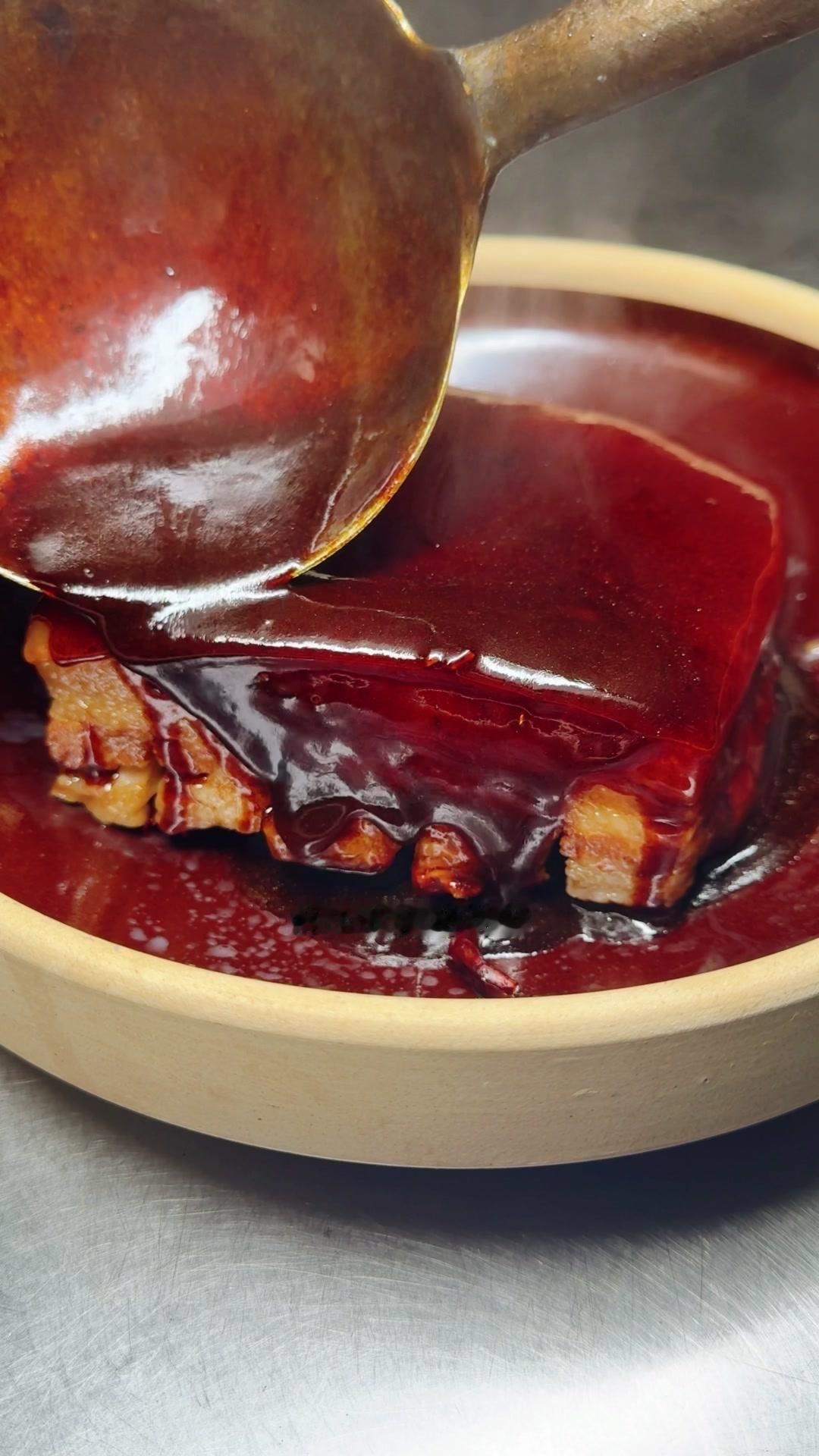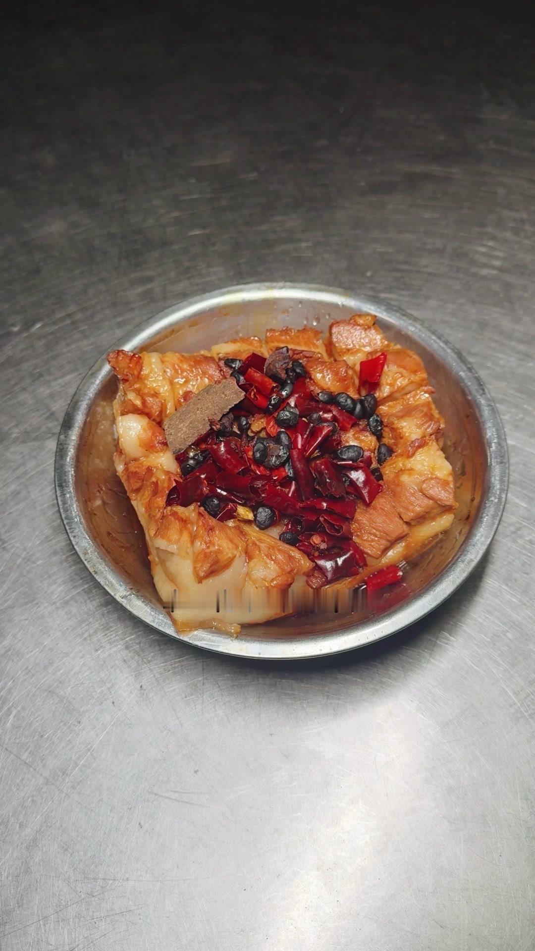 3️⃣高压锅压制:腌好的五花肉皮朝下放进高压锅,加八角、桂皮、干辣椒、豆豉,盖盖大火上汽压一个小时。压好后把汤汁倒出来烧浓稠,把肉翻扣到盘子里,淋上汤汁,最后盖上炒好的梅干菜就完成了。