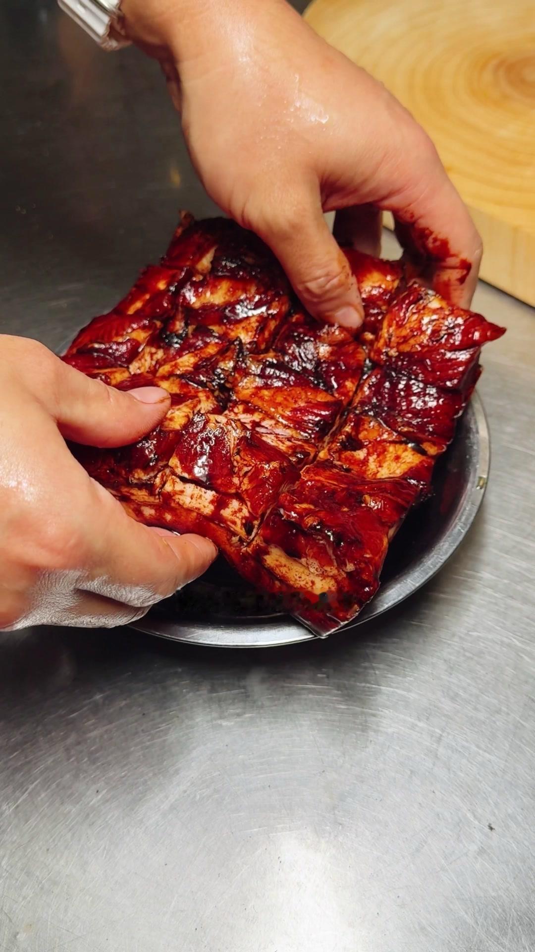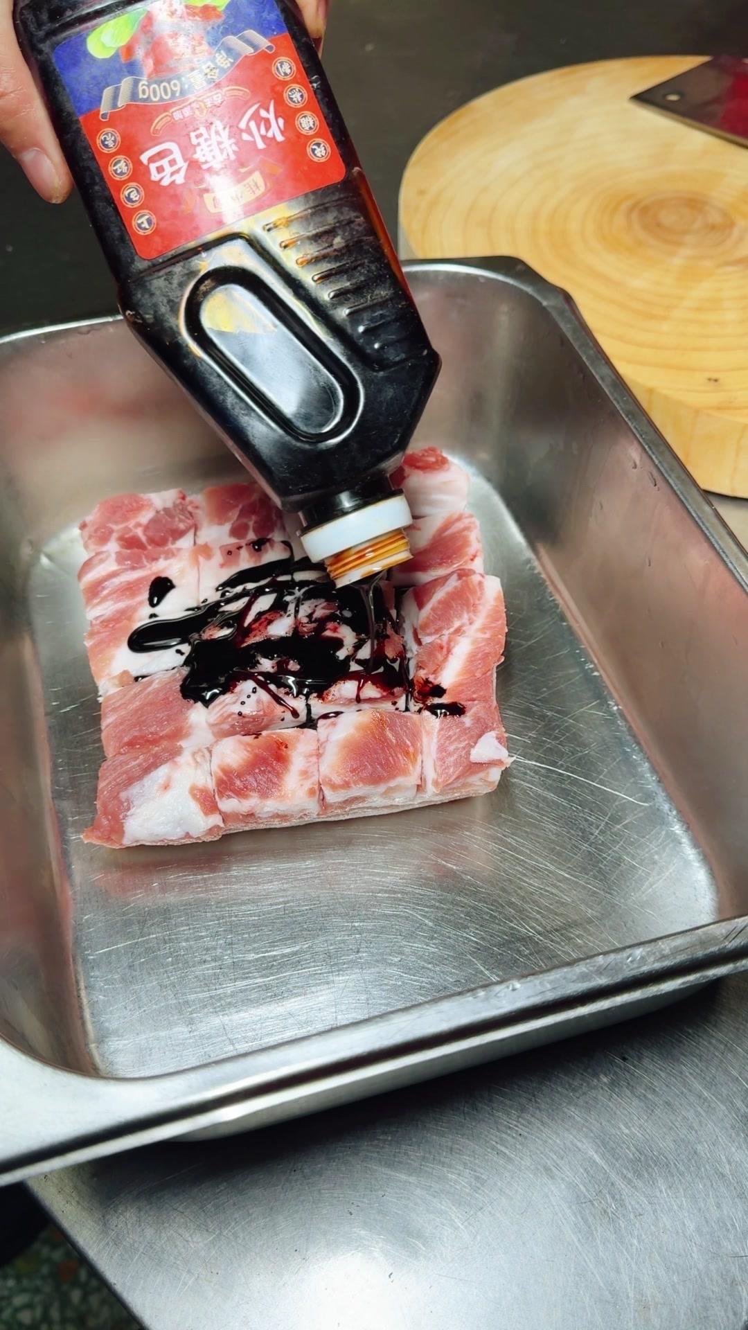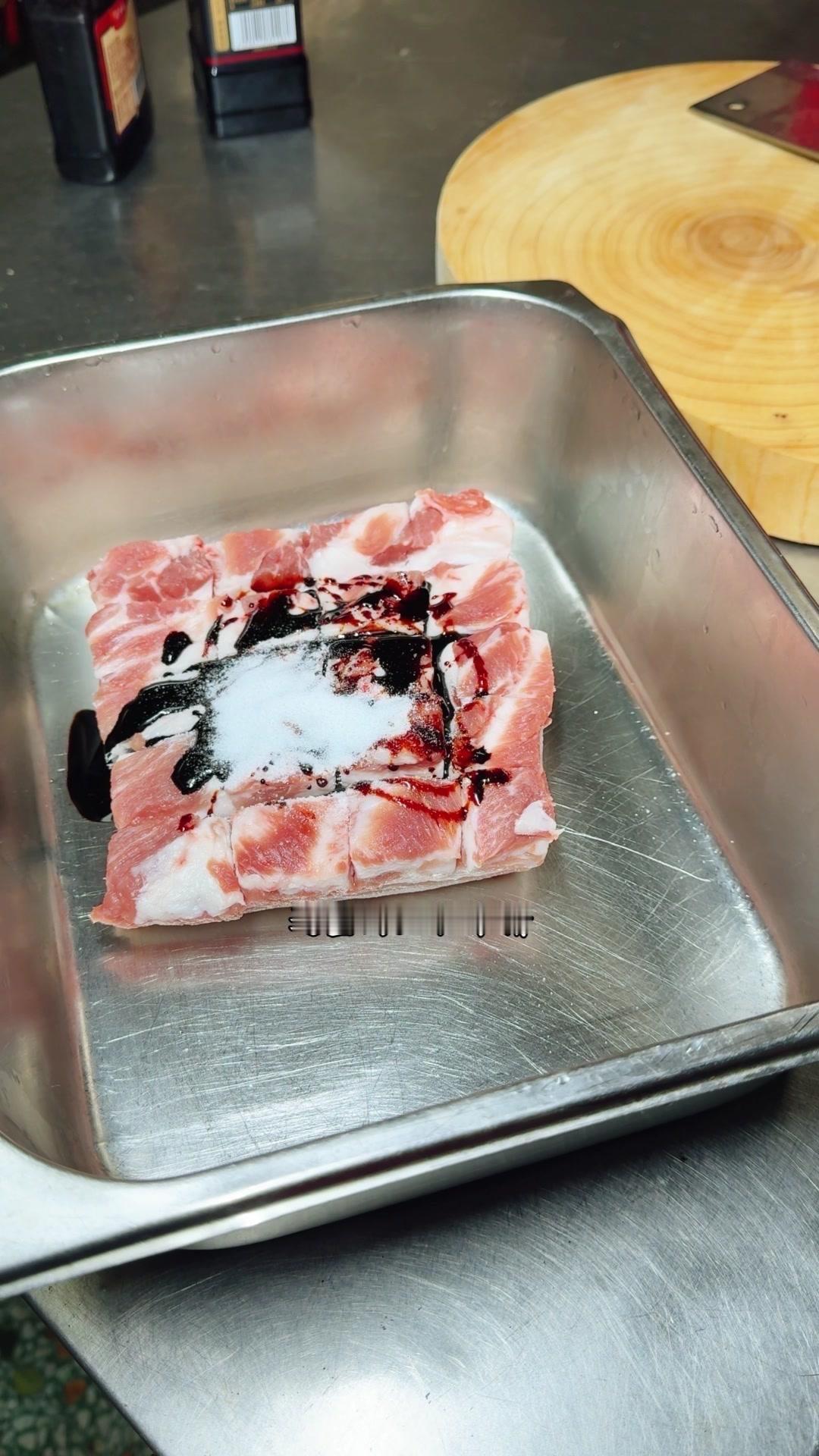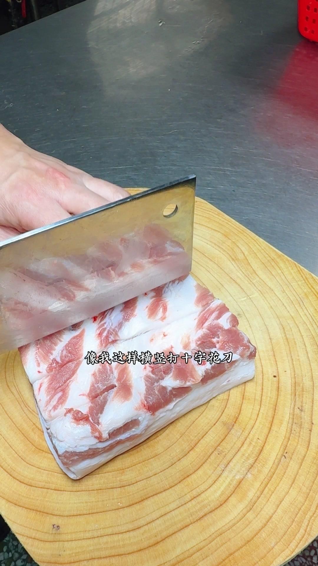 1️⃣处理五花肉:先把肉洗干净,有毛的话用火烧掉,没有就直接切十字花刀,别切破皮。然后加酱油、糖色、盐和味精,用手抹匀腌一会儿。