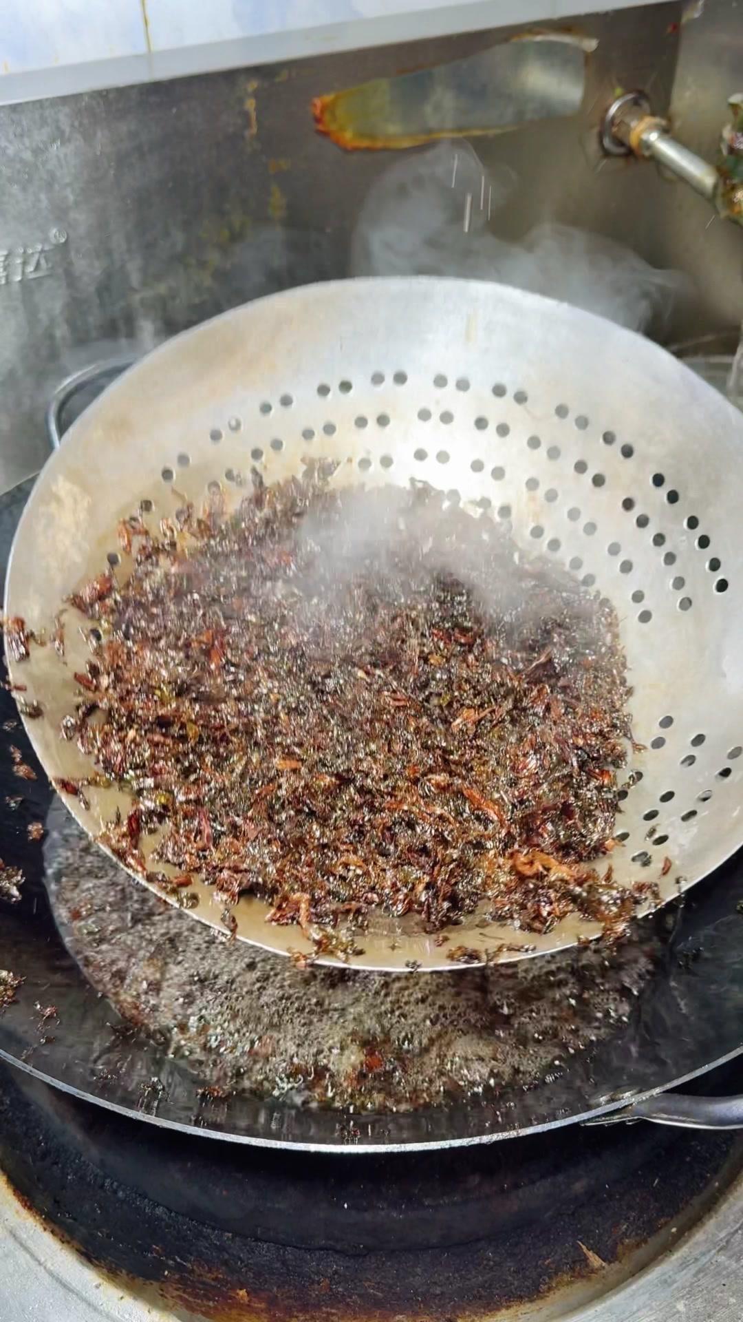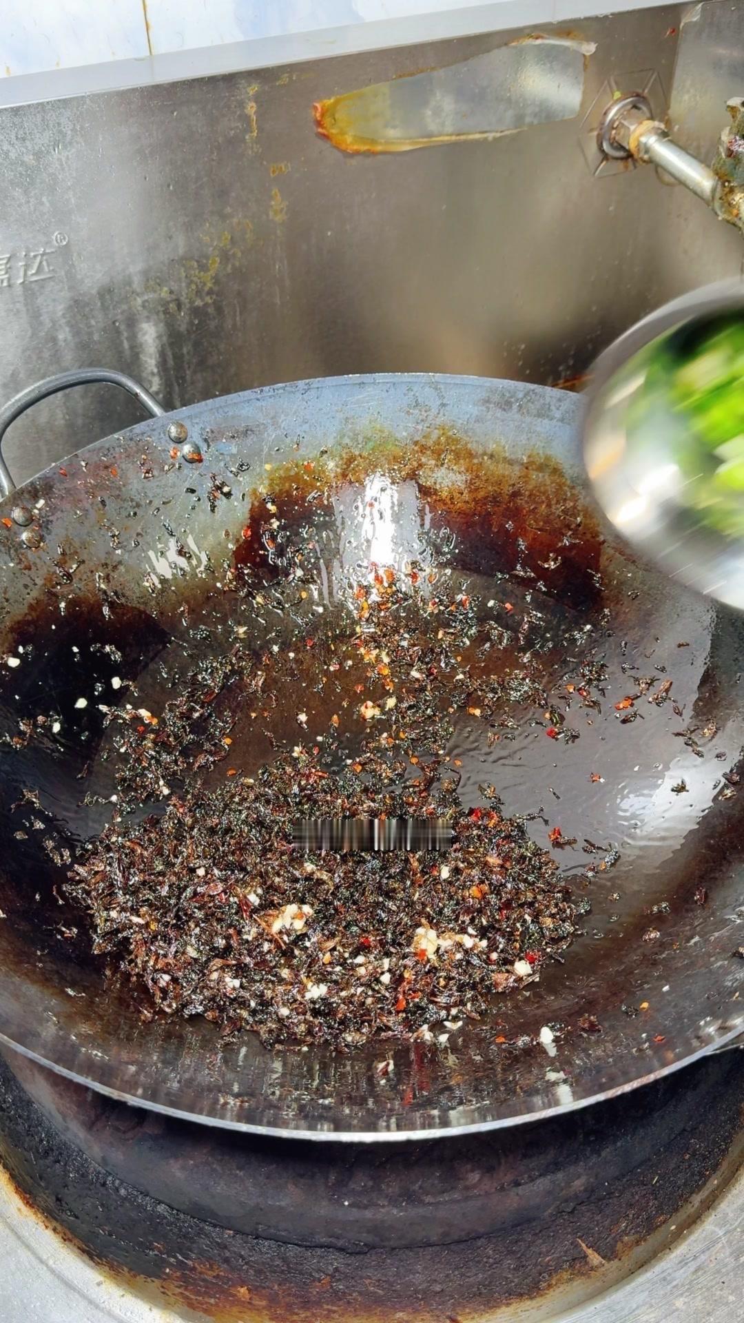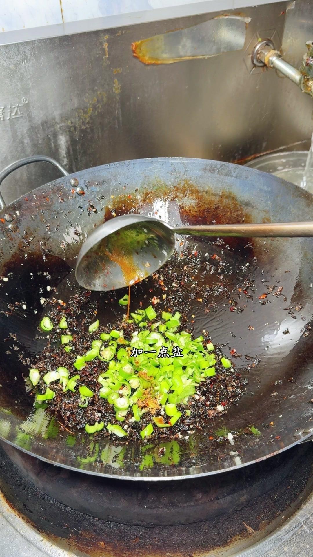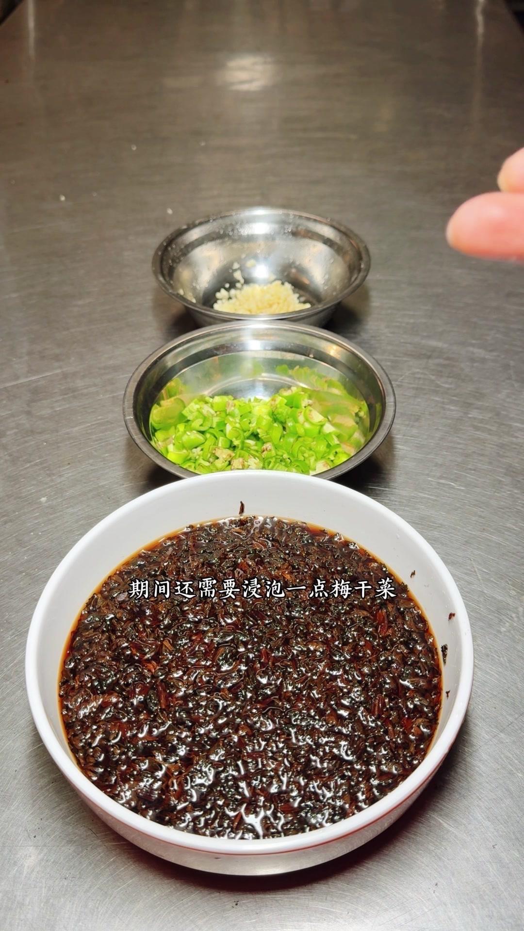 2️⃣准备梅干菜:提前泡软梅干菜,挤干水分后沥干。另起锅倒油,爆香蒜子、辣椒粉,再放梅干菜和青辣椒,加点盐、味精、生抽炒入味,盛出来备用。